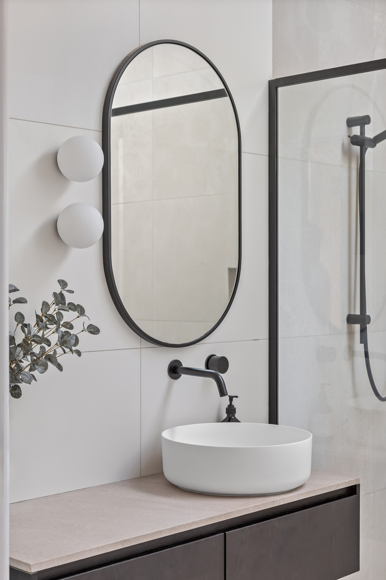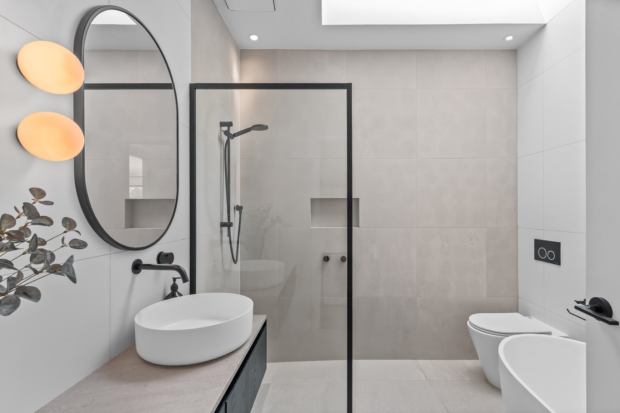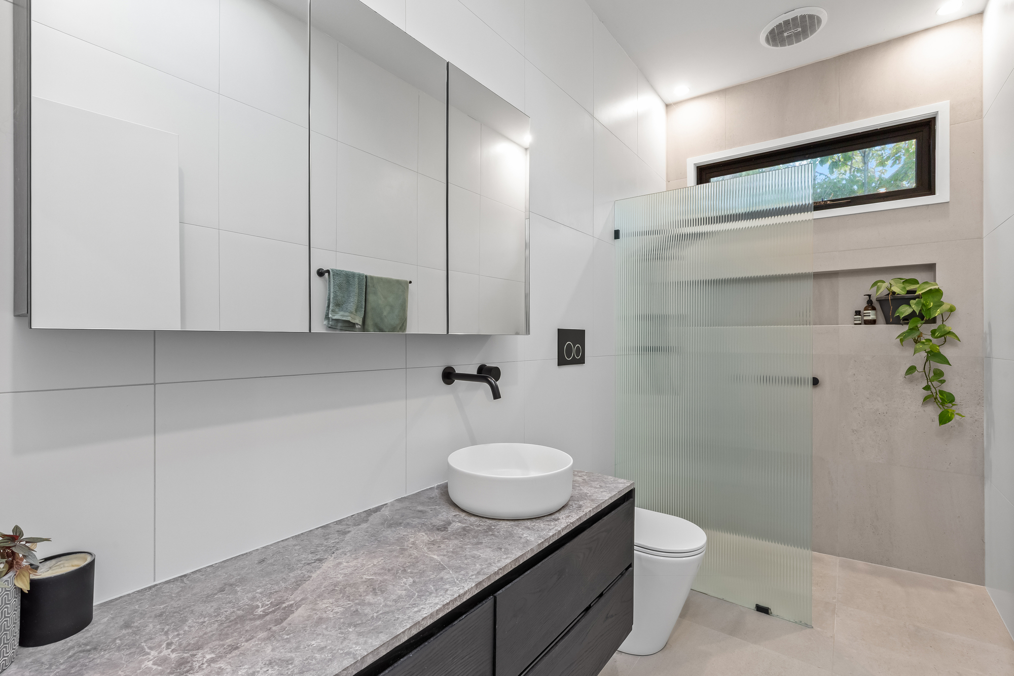 Both bathrooms have been renovated with contemporary finishes, skylights, stone benchtops, and tiles, walk-in showers with built-in niches, and cisternless in-wall toilets. The main bathroom includes a bathtub, while the ensuite features mirrored cabinetry for added storage.