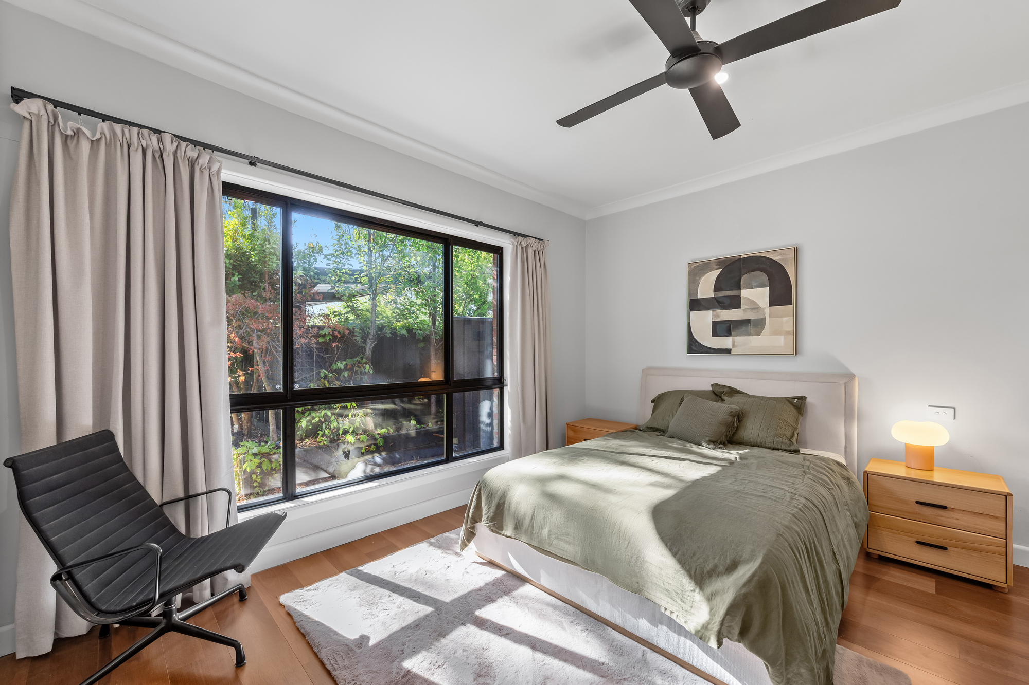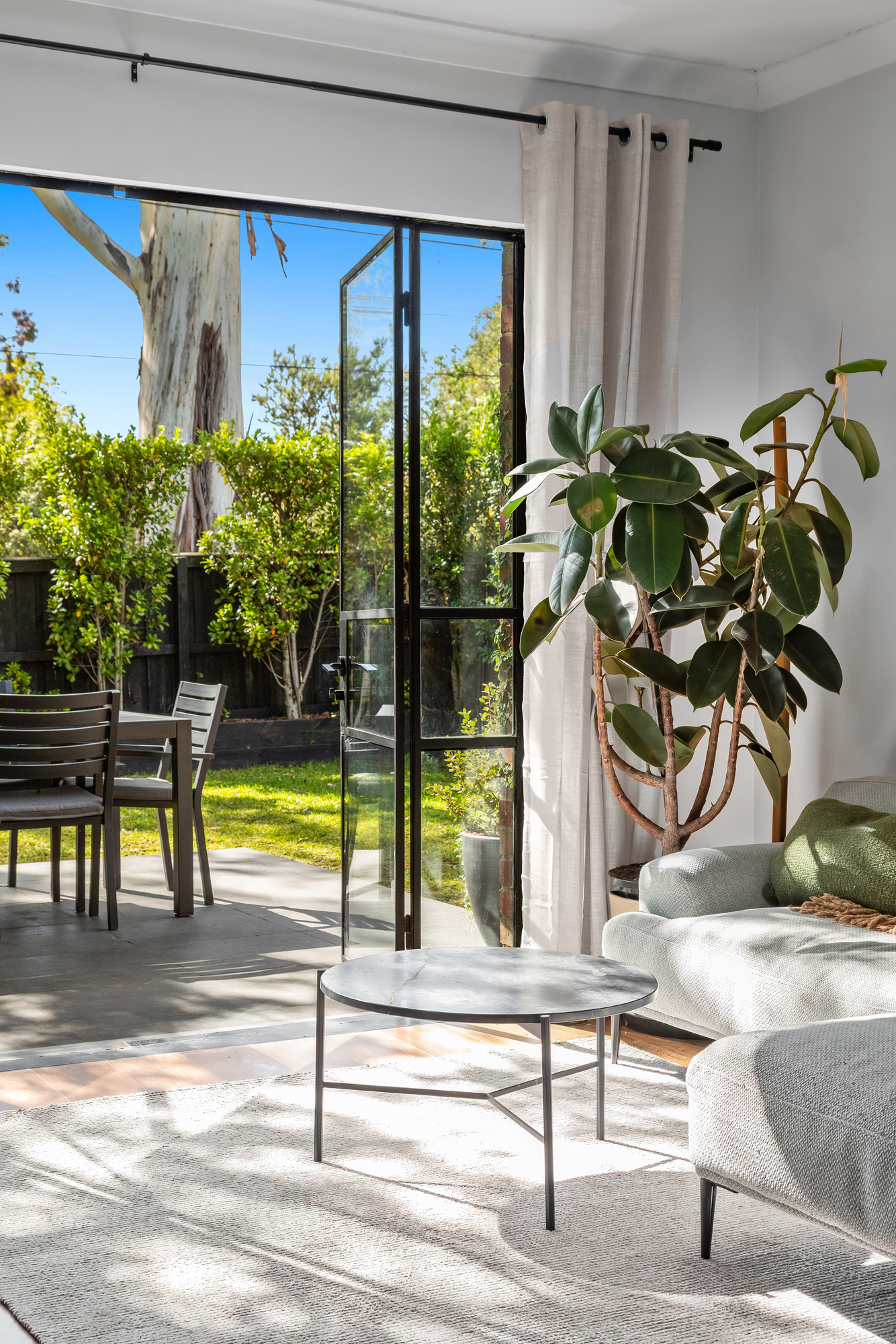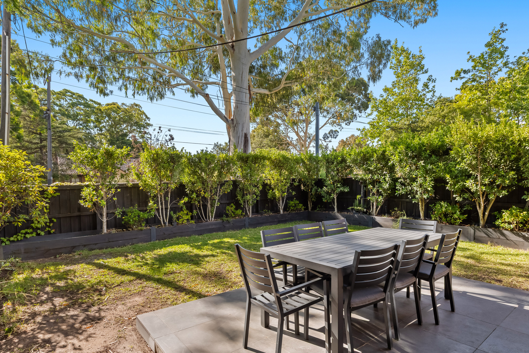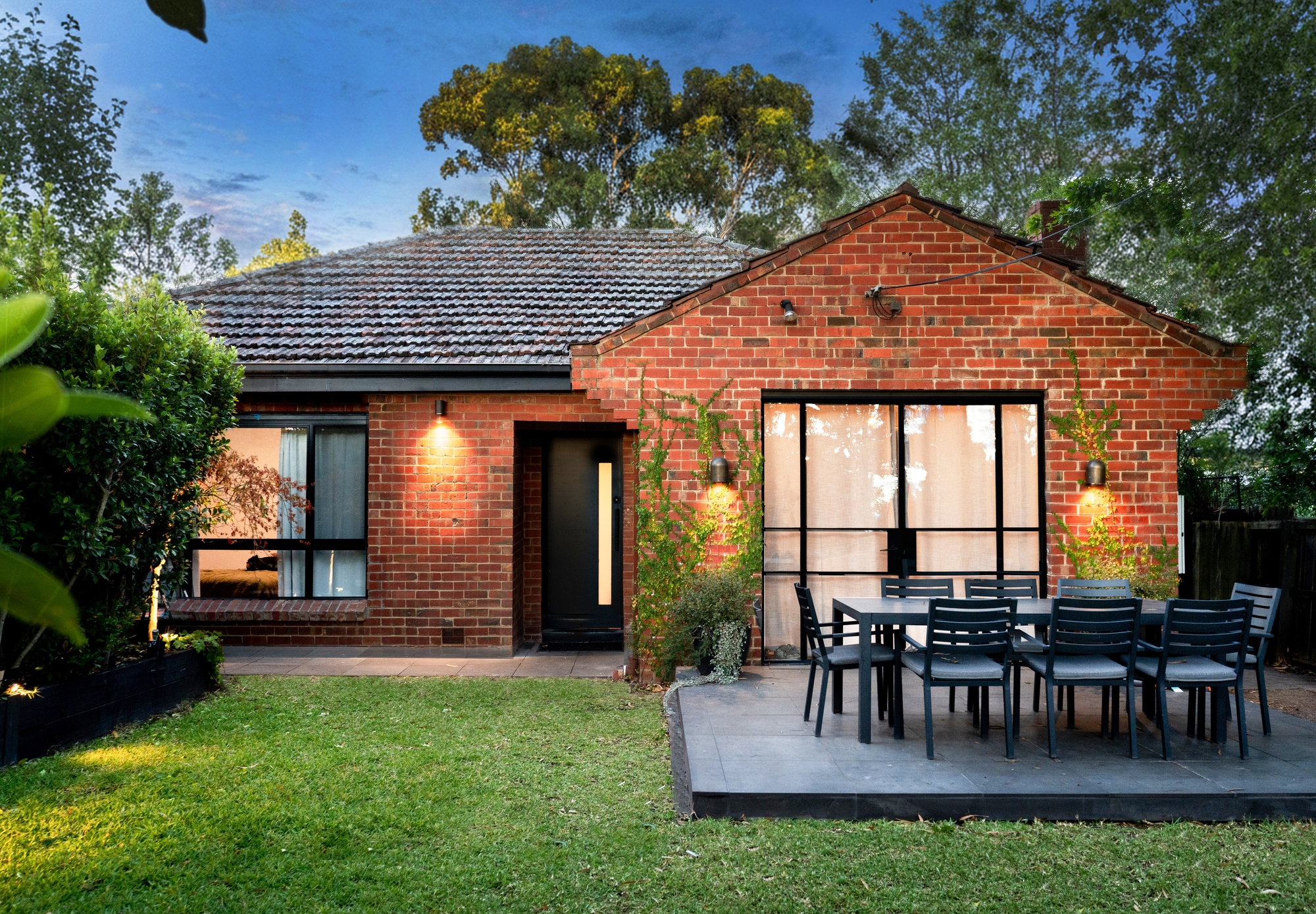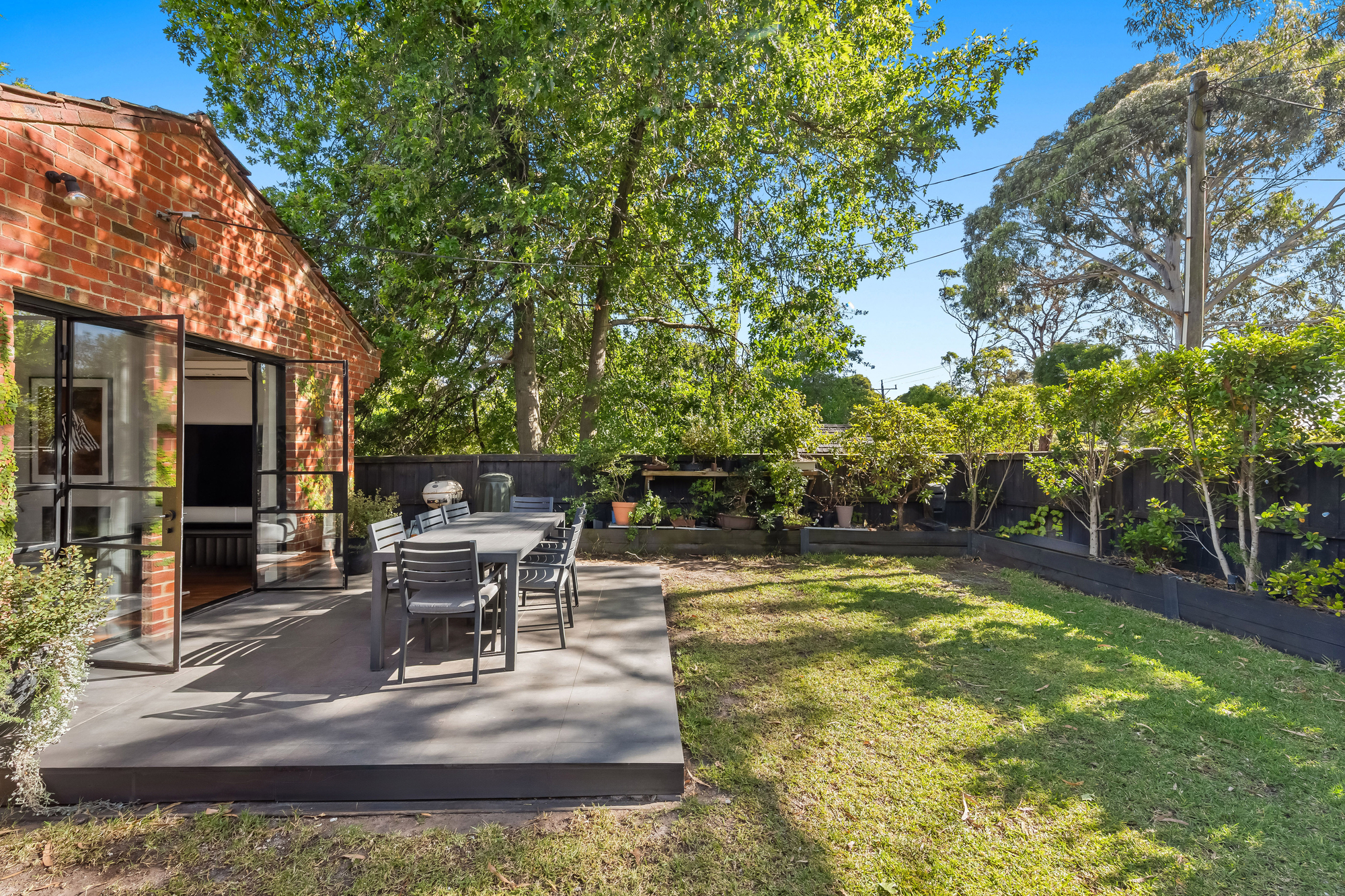 Outdoors, a bluestone patio overlooks a secluded and leafy backyard, framed by established greenery along the garden borders. This private setting provides an ideal space for relaxed outdoor living or entertaining without the burden of high maintenance.