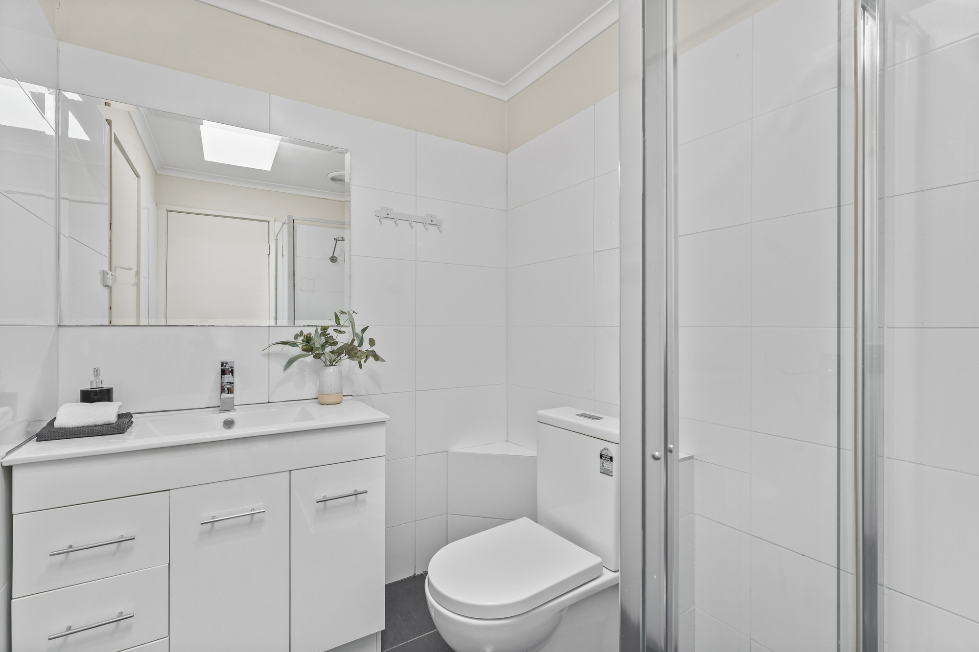 Each bedroom is well-appointed, with built-in robes in the master and the additional rooms, and a shared ensuite-style bathroom accessible from the master. The bathroom features a skylight that fills the space with natural light and a laminate vanity with dual access doors. A separate laundry also opens to the backyard for added convenience.