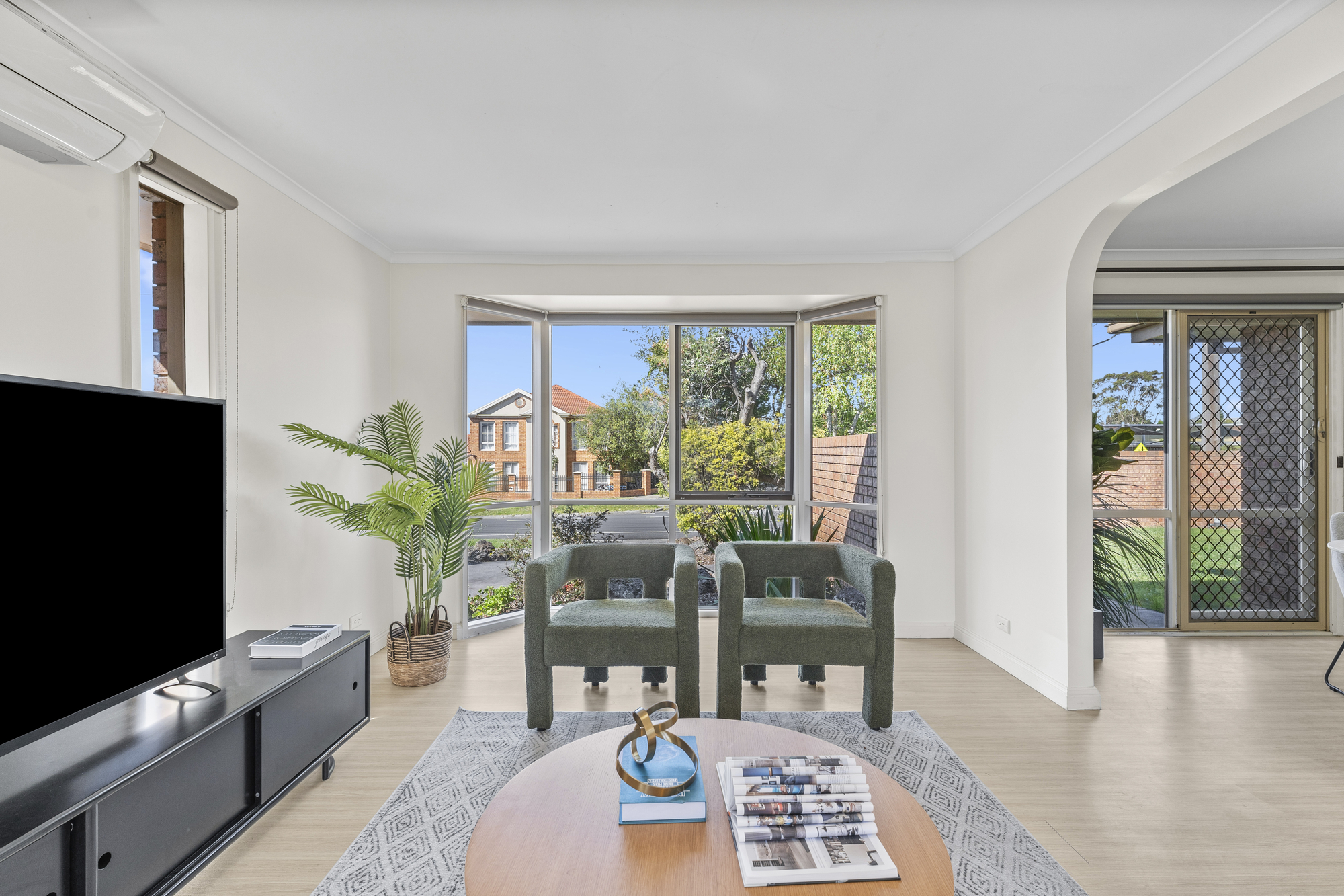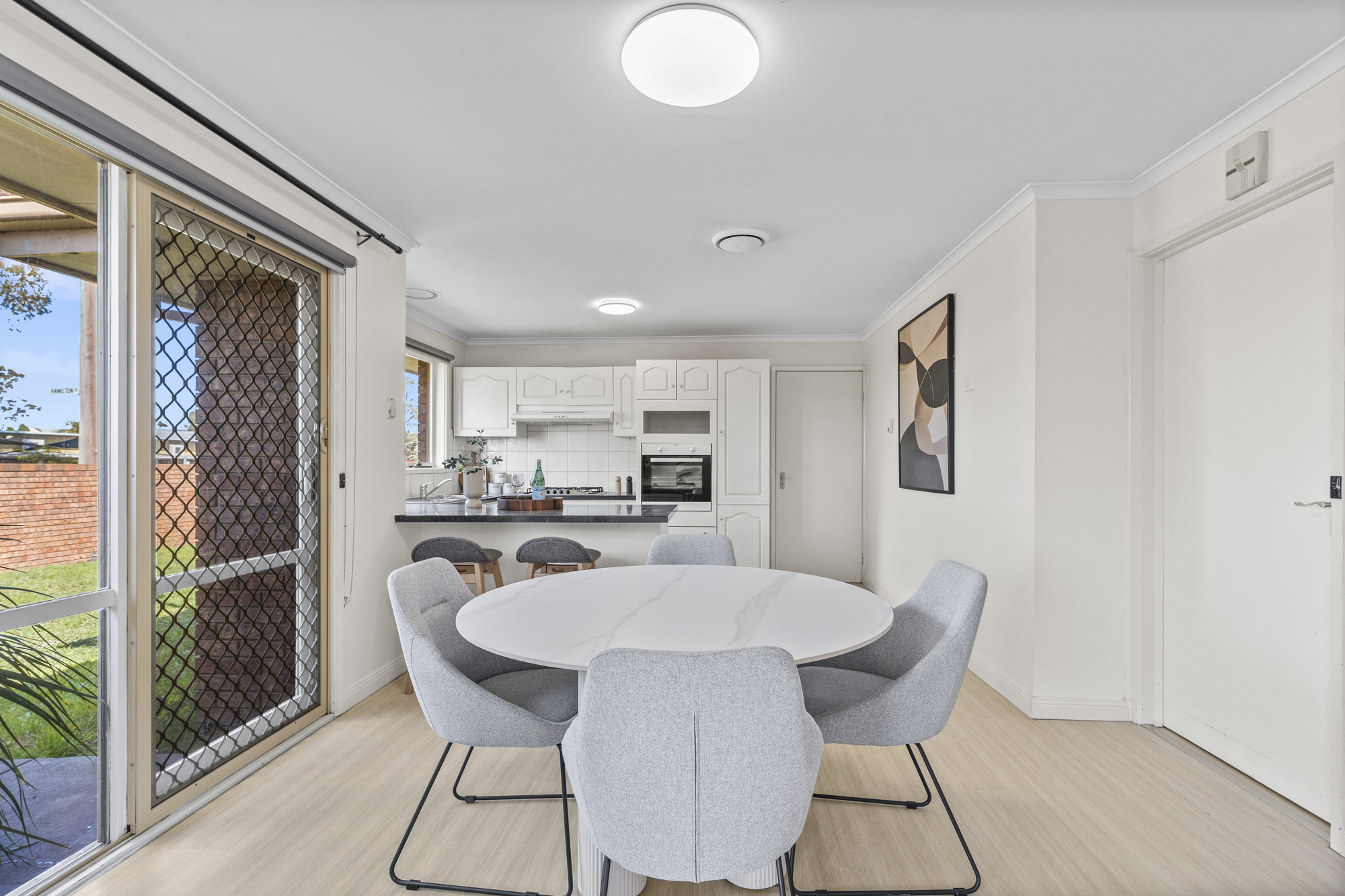 The living and dining area is bright and inviting, featuring timber floors, a bay window, and a split system air conditioner for year-round comfort. A sliding door from the dining space opens directly to the backyard, allowing seamless indoor-outdoor flow. The kitchen includes a laminate countertop, a four-burner gas stove, a dual sink, and generous over and under bench storage, all framed by a window overlooking the backyard.