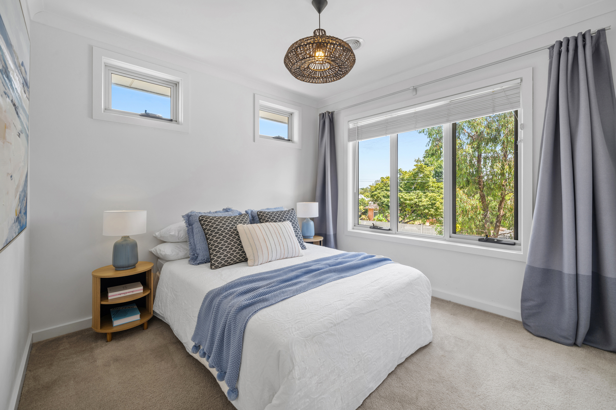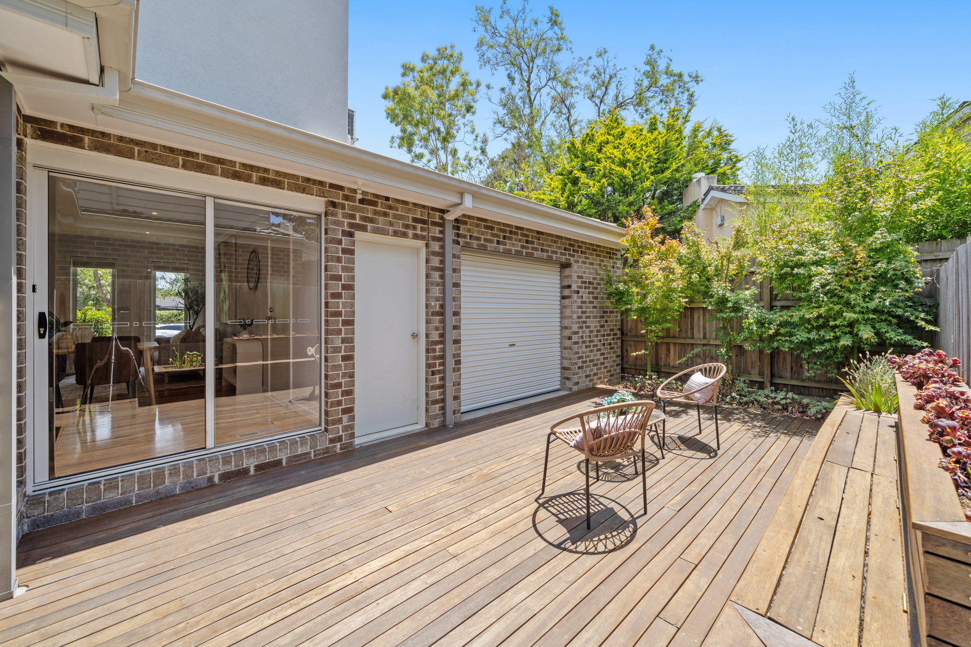 Outdoors, a large timber deck provides an excellent setting for entertaining, complete with built-in bench seating and low-maintenance garden surrounds. The private courtyard connects directly to the living area, creating a seamless extension of the home.