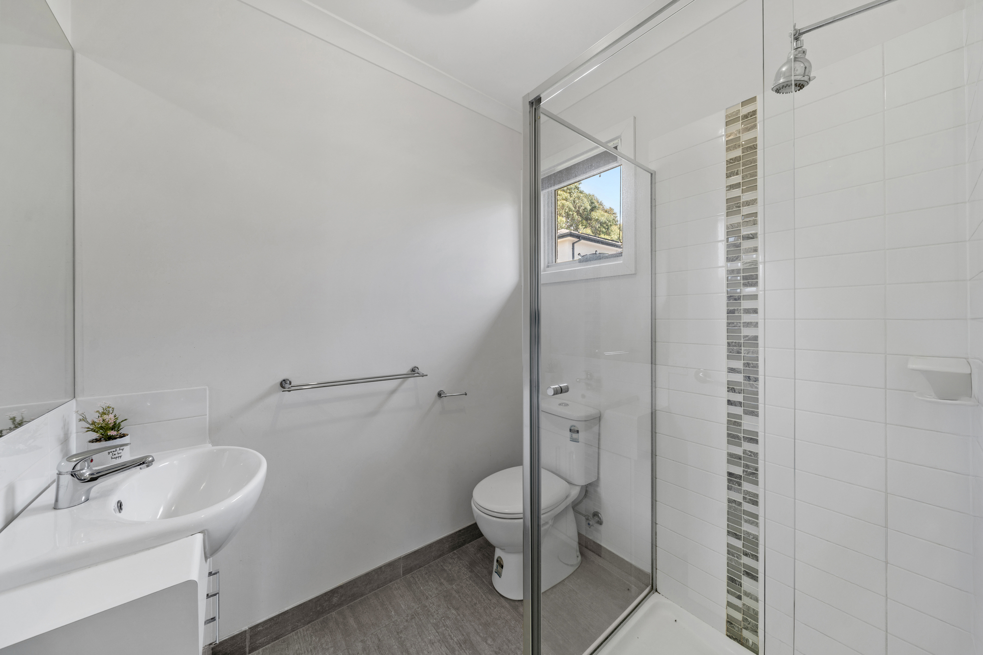 Accommodation is positioned across the upper level, with all bedrooms carpeted and enjoying excellent natural light. The master bedroom includes a private ensuite, while the remaining bedrooms are well proportioned and suited to family living or guests. A central bathroom services the home and includes a separate bath and shower, modern neutral tiling, vanity storage, and a large frosted window for light and privacy. The ensuite features a walk-in glass shower and clean, contemporary finishes.