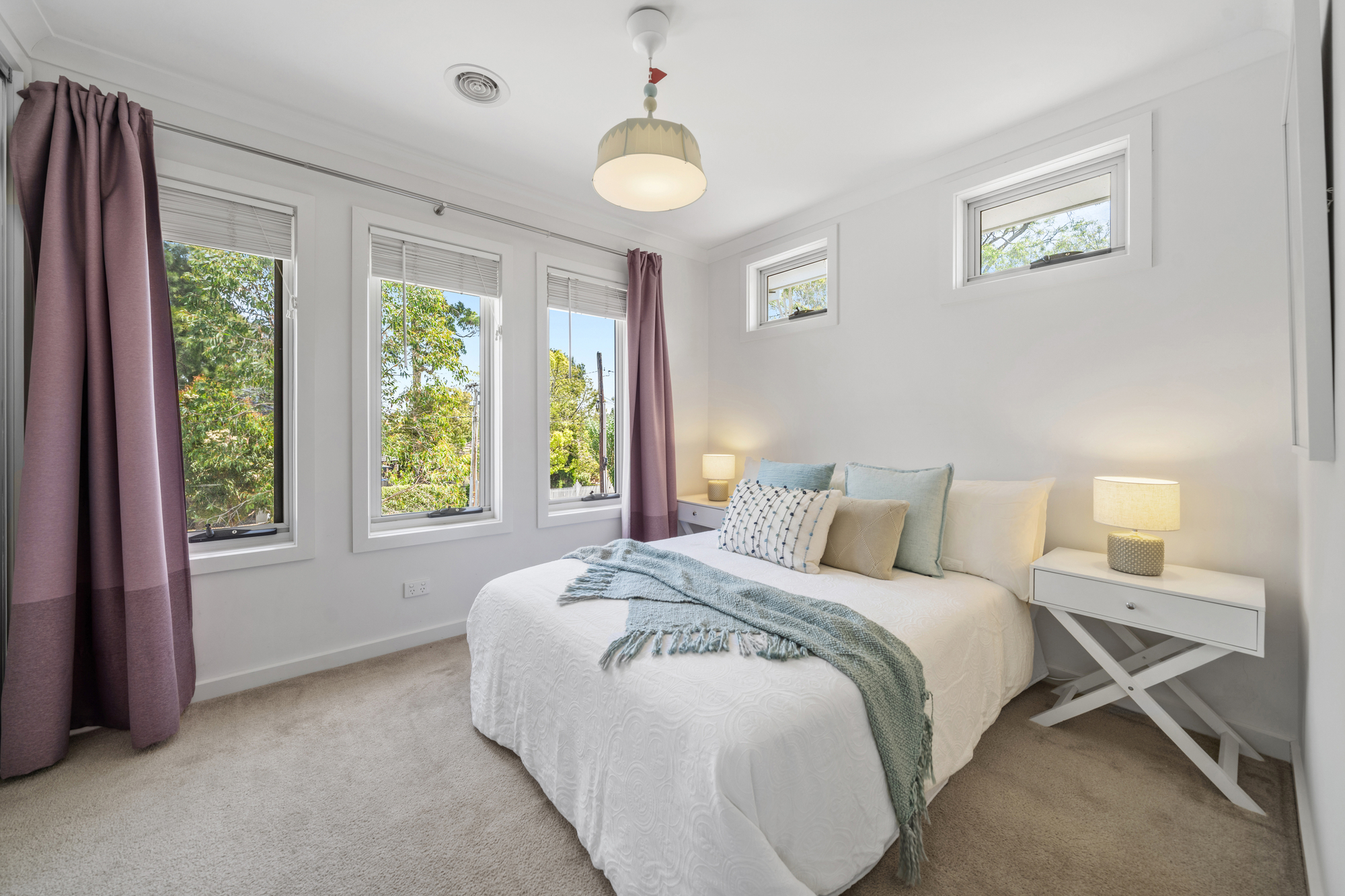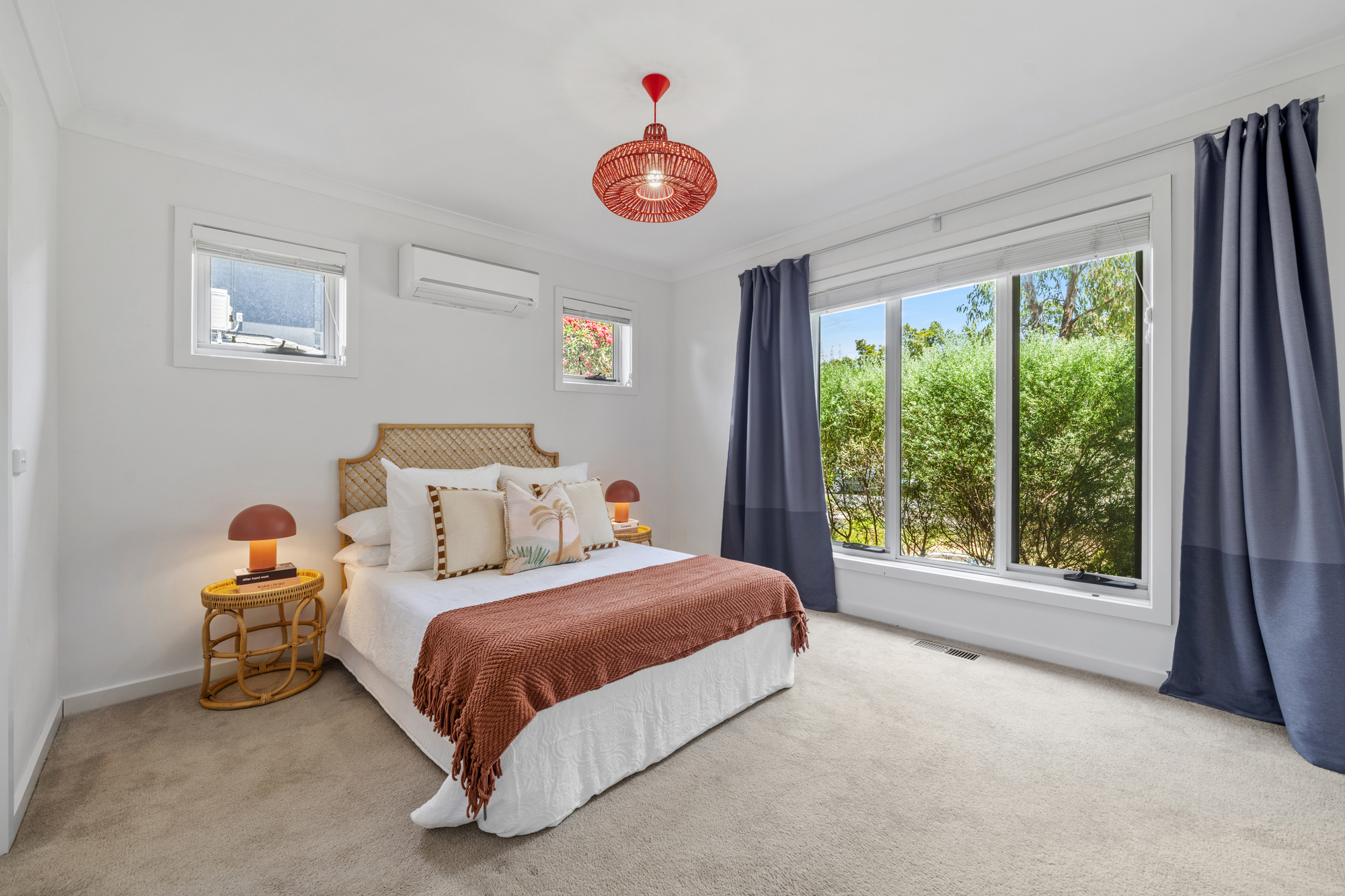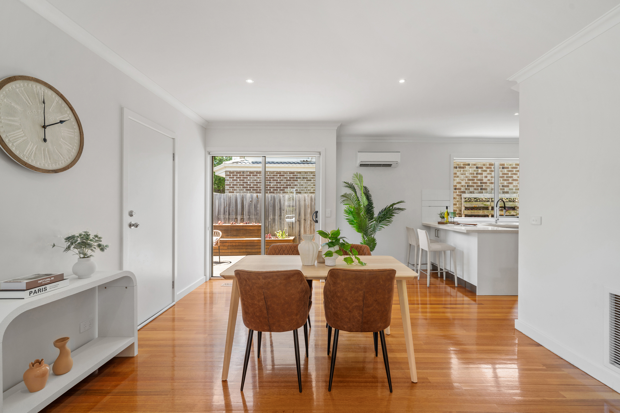 The main living and dining zones are warm and inviting, featuring polished timber flooring, a light-filled open-plan layout, and tall windows that draw in natural light and leafy outlooks. Soft neutral tones and considered styling create a modern, homely feel, while sliding glass doors open directly to the outdoor deck, enhancing everyday indoor–outdoor flow. Split-system heating and cooling ensure year-round comfort.