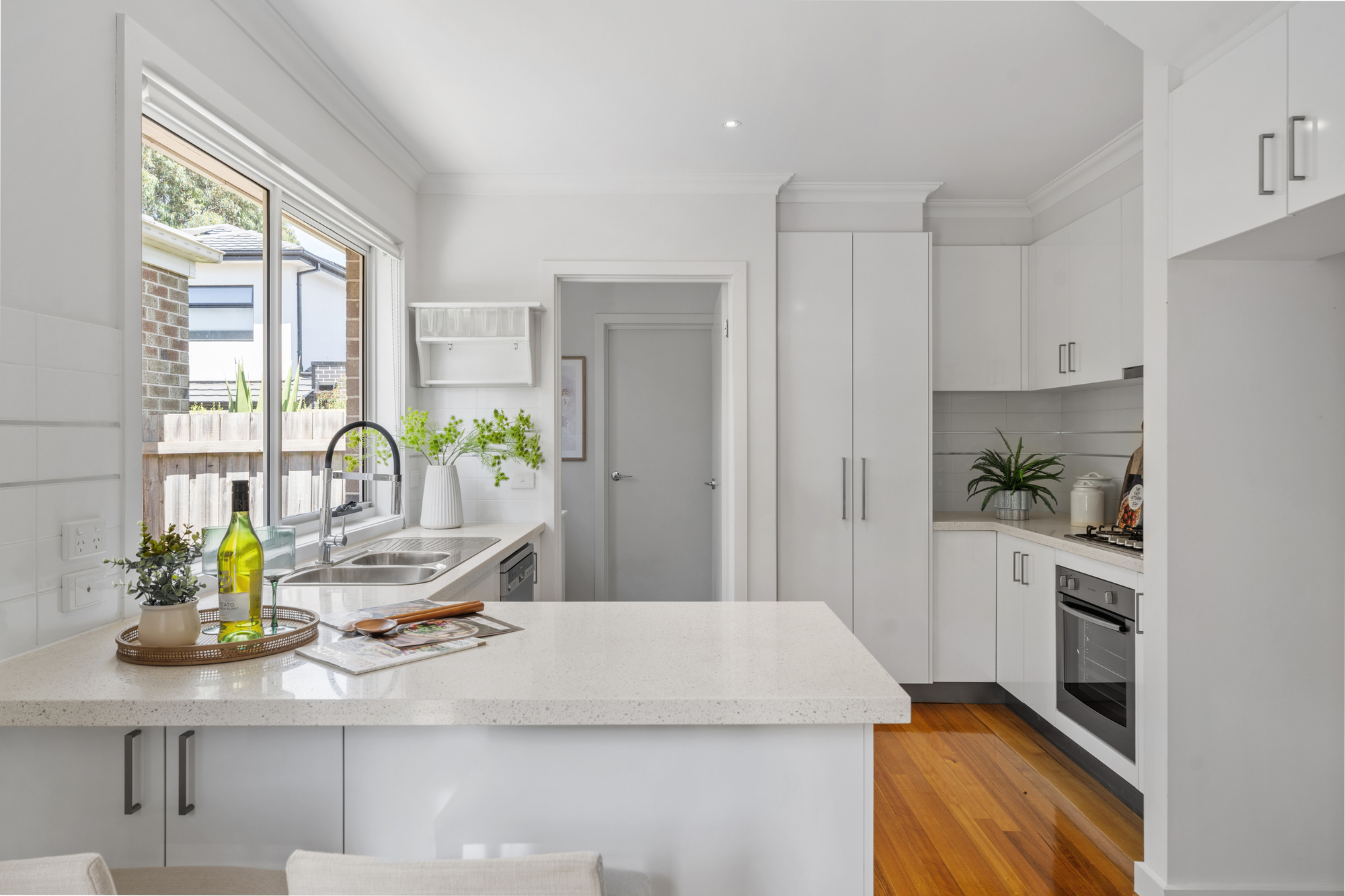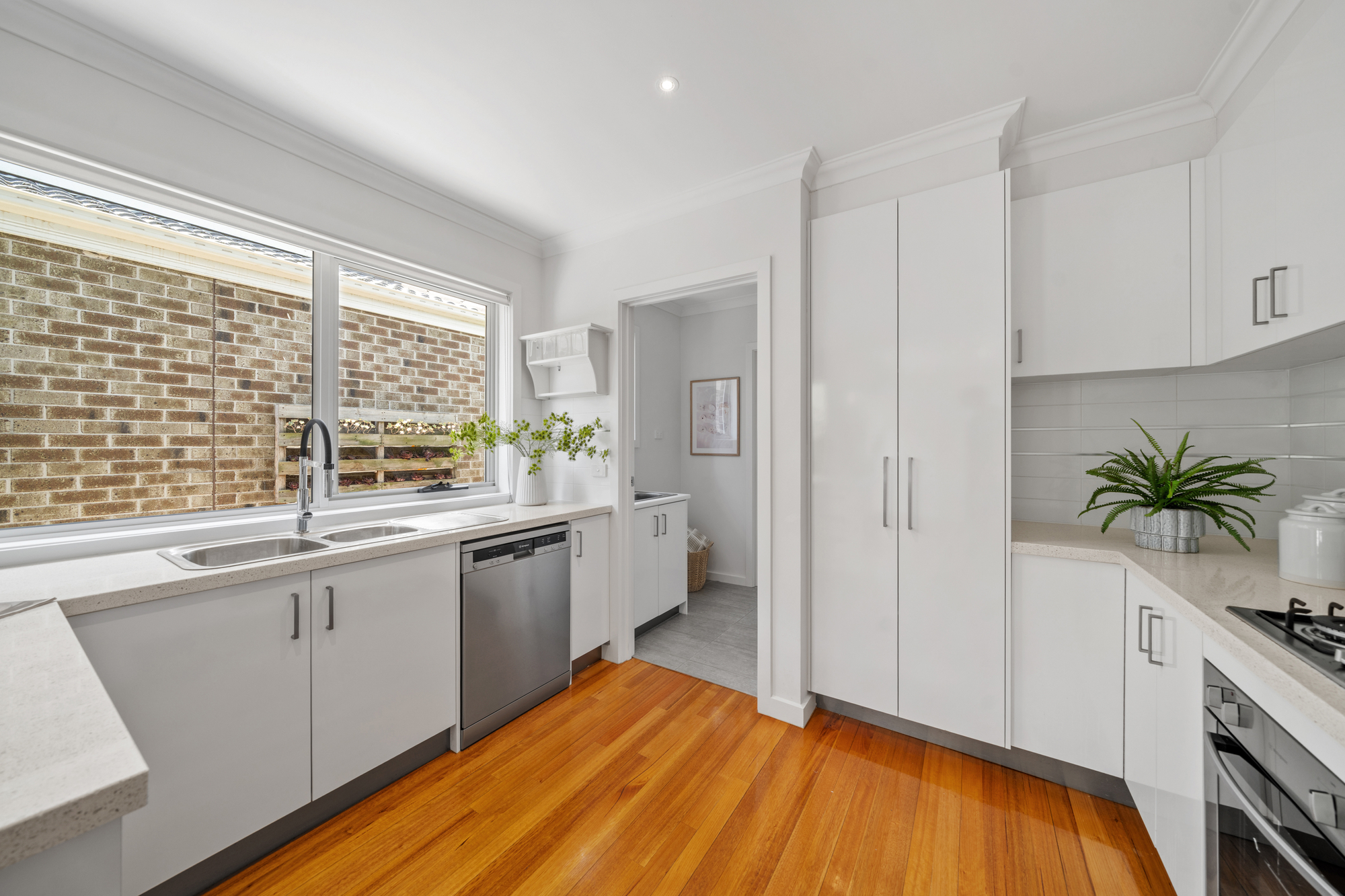 The kitchen is bright and functional, finished with crisp white cabinetry and stone benchtops, including breakfast bar seating. Stainless steel appliances comprise a built-in oven and gas cooktop, while a double sink beneath a window provides natural light and ventilation. Ample storage, including overhead cabinetry and a full-height pantry, completes the practical layout with easy connection to the dining and outdoor areas.