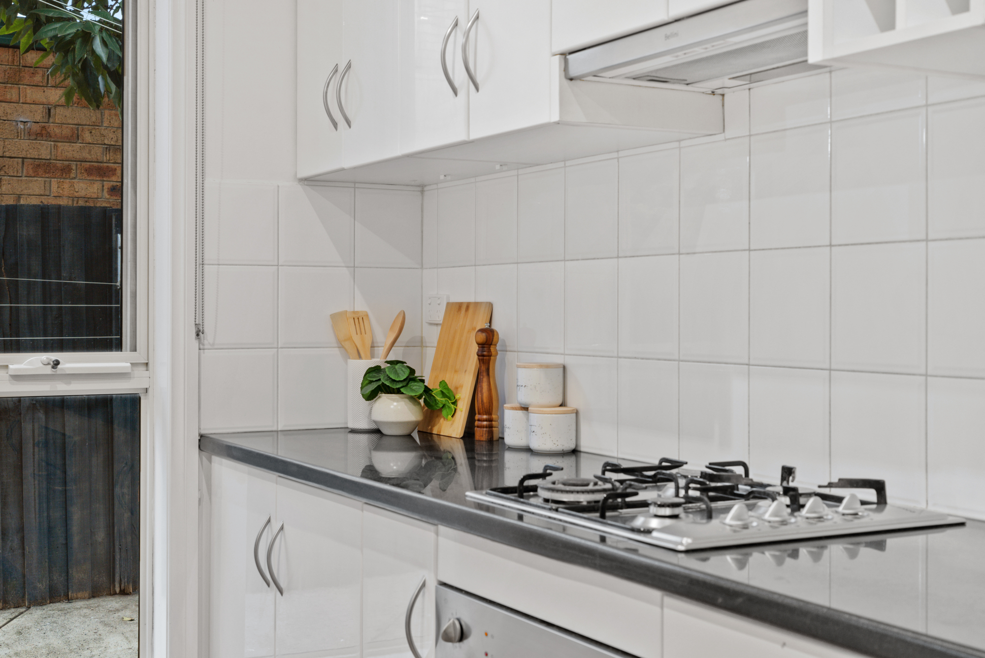 The heart of the home features a contemporary kitchen adorned with stone and wooden benchtops, equipped with quality Blanco appliances including a gas stove and oven. The open-plan living area is flooded with natural light, creating a warm and inviting atmosphere for gatherings with loved ones.