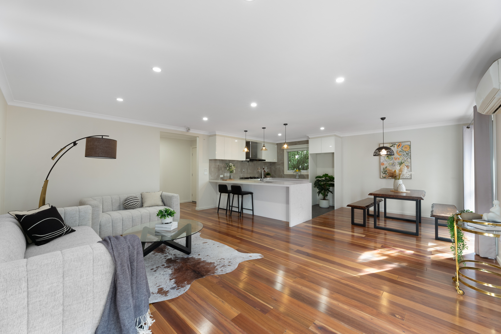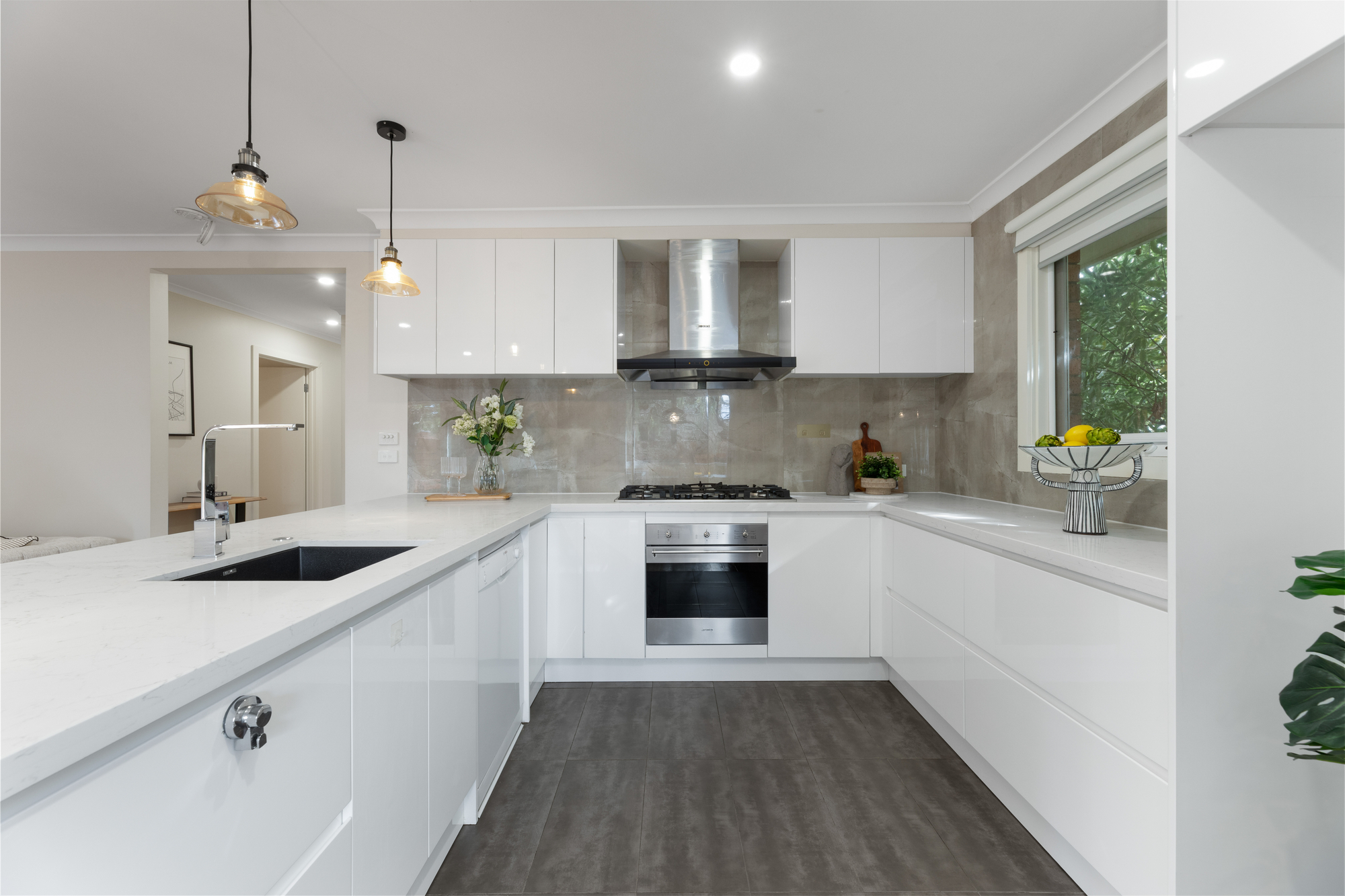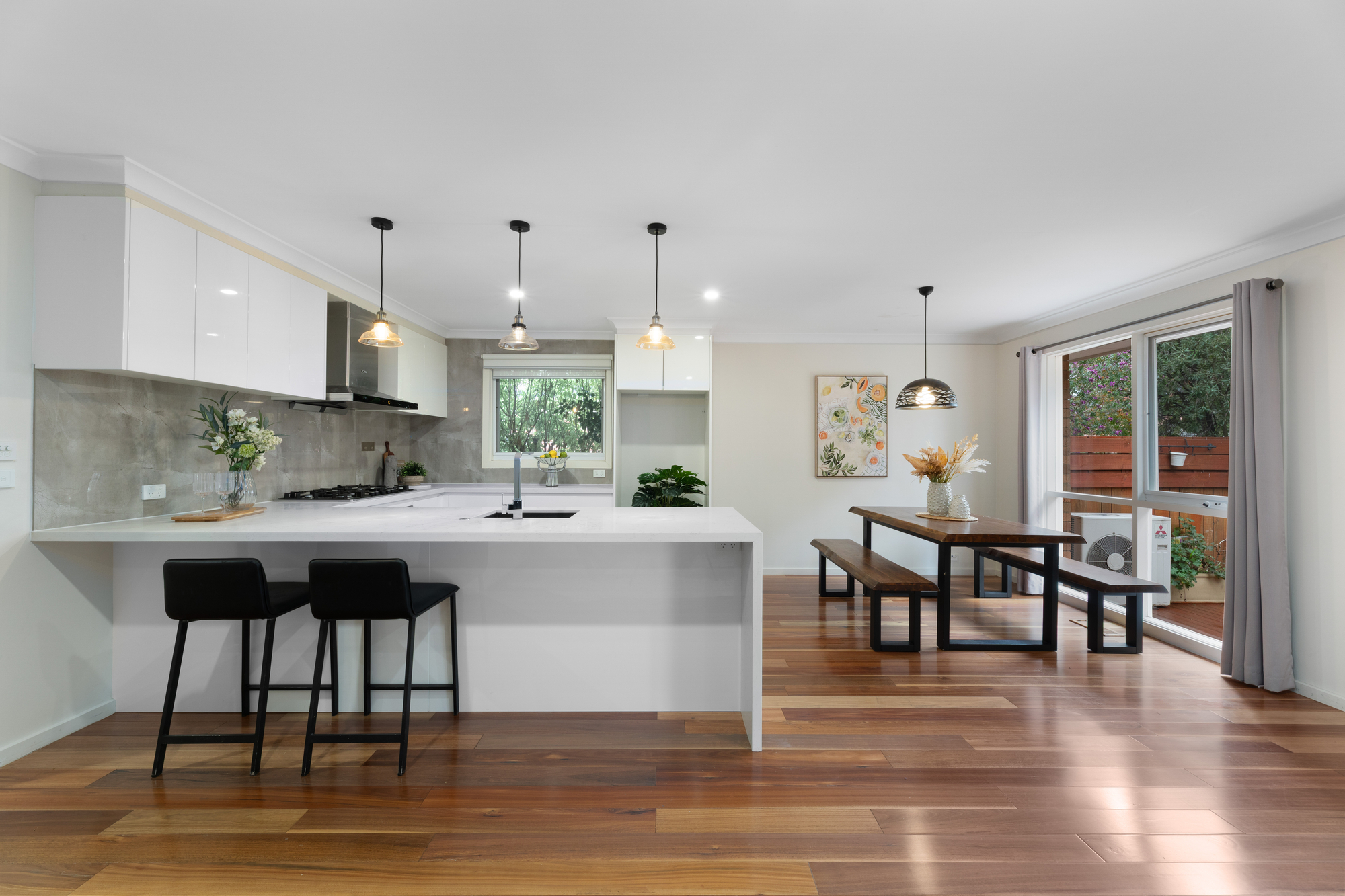 Stepping inside, you are welcomed by an open-plan design that invites natural sunlight throughout the day. The kitchen is a true centerpiece — sleek and stylish with a Bosch dishwasher and cooktop, a Smeg oven, and a premium Fotile range hood — blending performance with sophistication. Flowing seamlessly into the living and dining areas, the home creates a warm and social atmosphere, further enhanced by Mitsubishi air conditioning in both the living space and master suite.