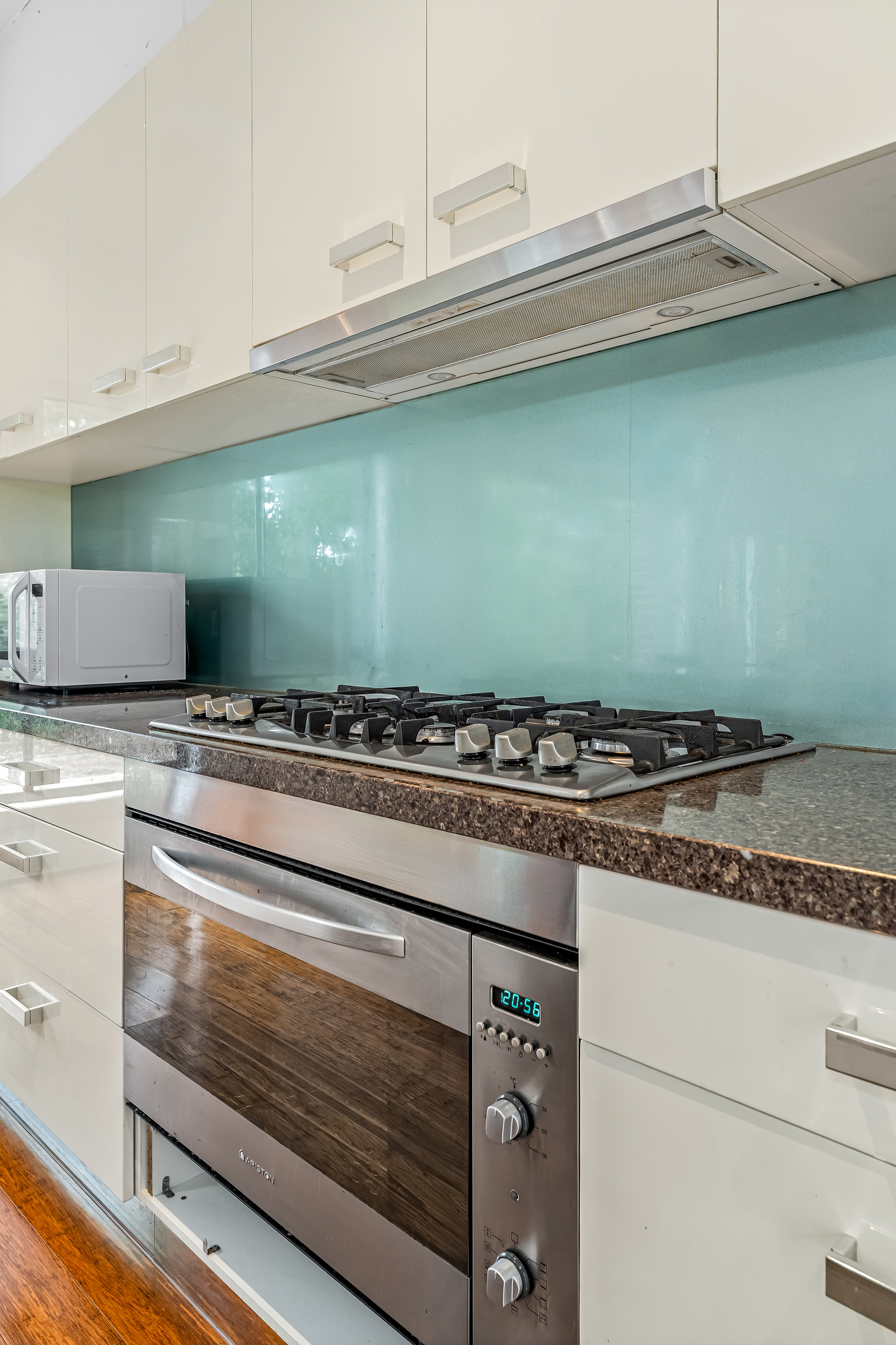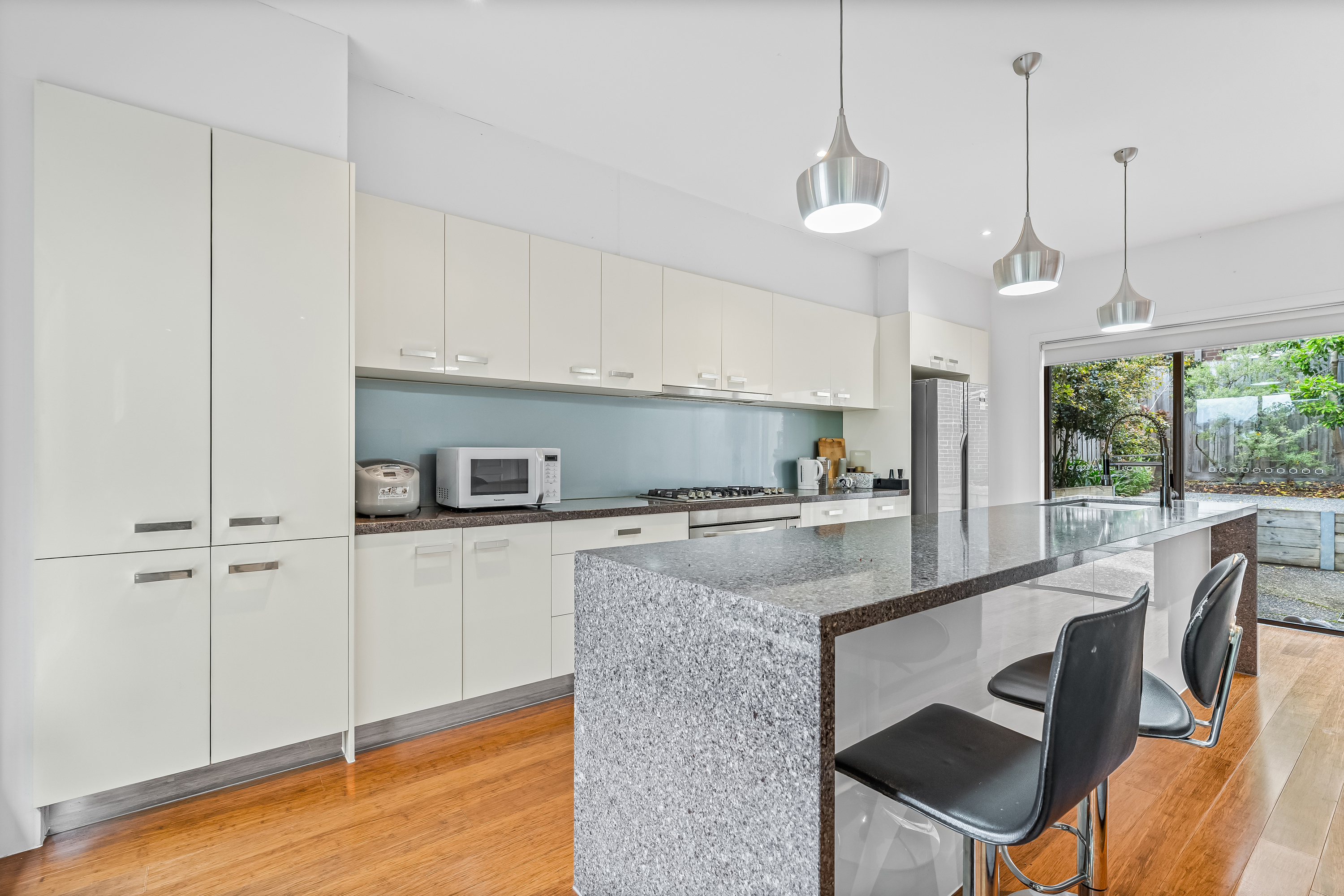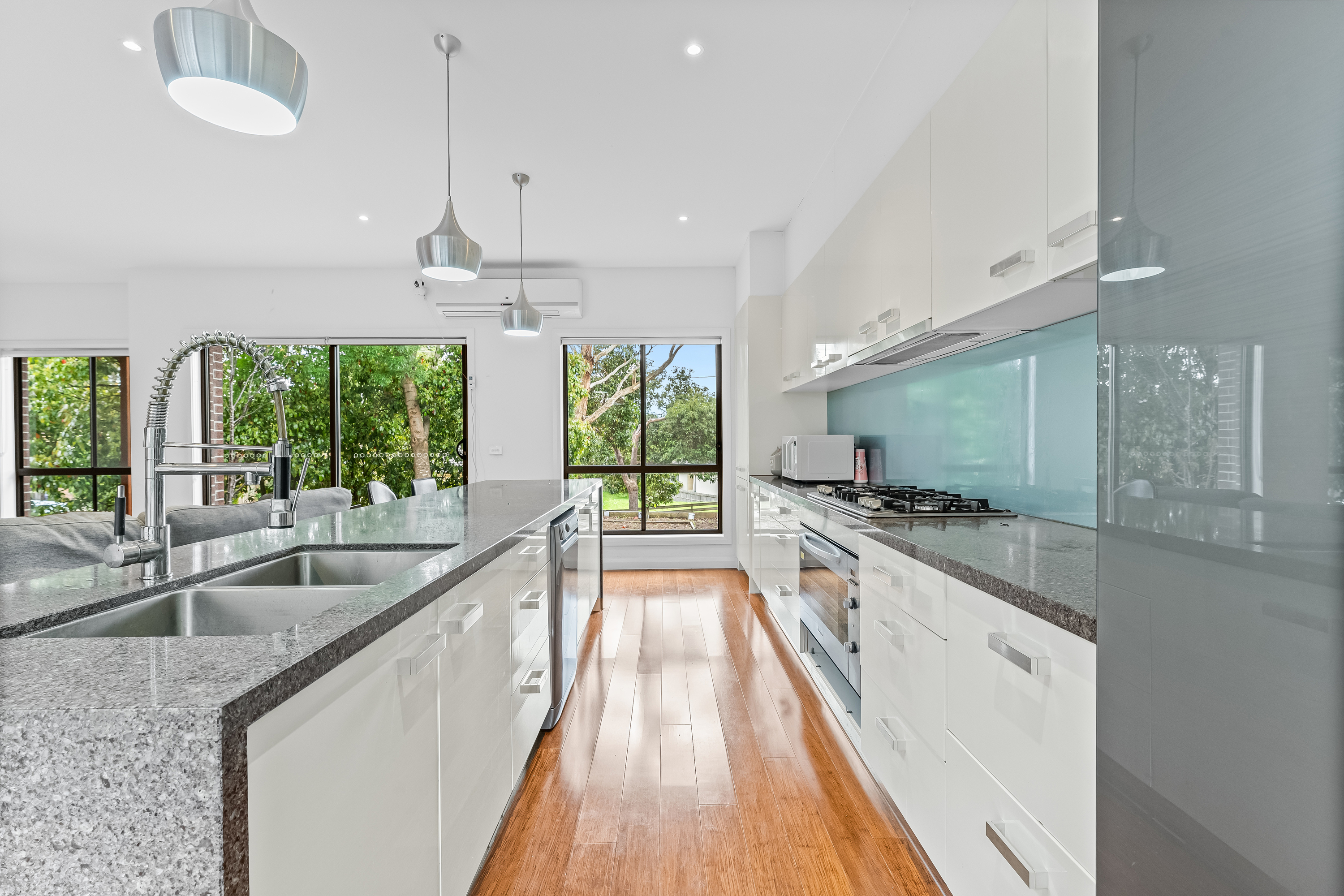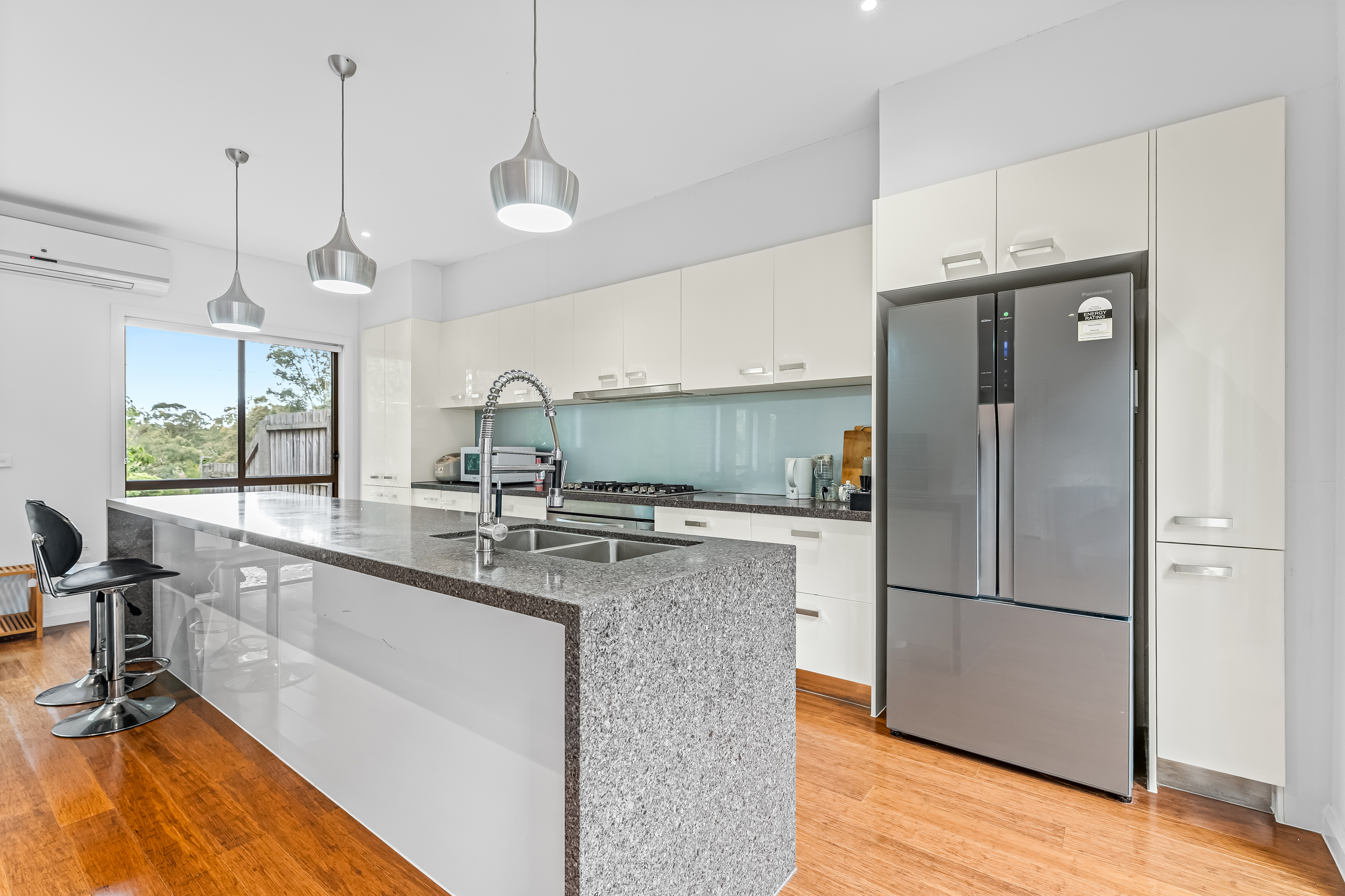 • Contemporary kitchen with stone benchtops, stainless steel appliances & ample storage