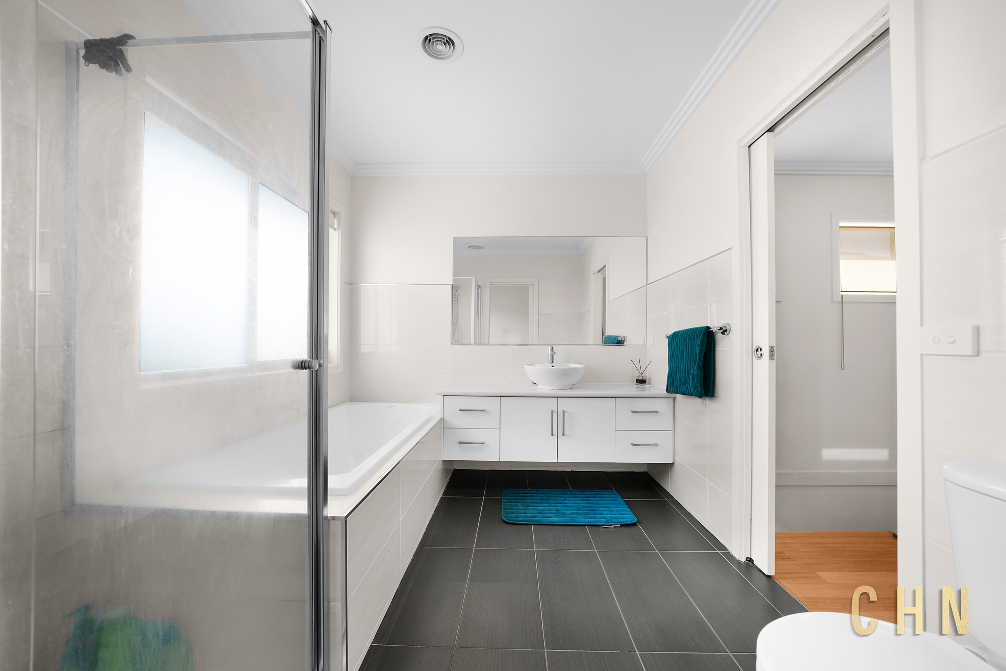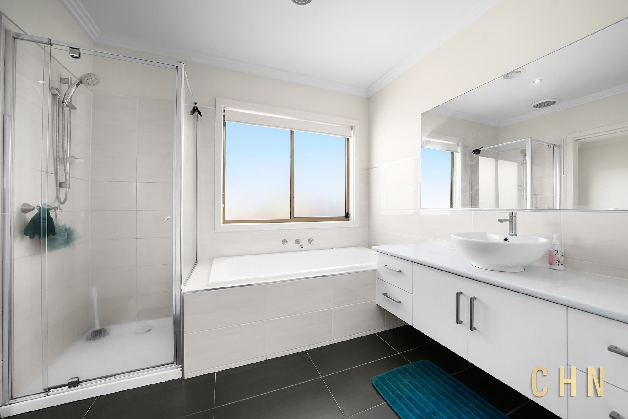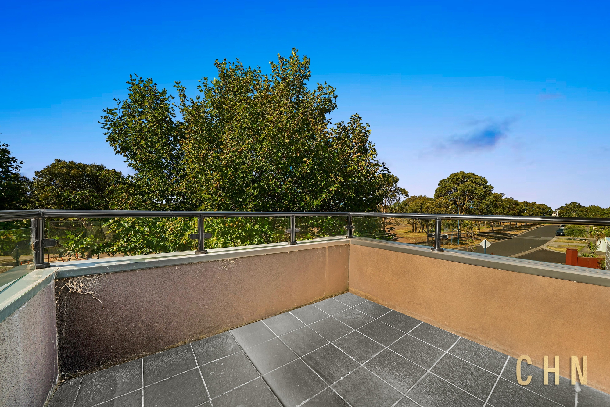 Upstairs accommodation comprises two generously sized bedrooms with mirrored built-in wardrobes, including one with private access to the central bathroom. A balcony overlooking the street captures calming waterway views, enhancing the sense of space and serenity. The upstairs bathroom features privacy glass windows, while a downstairs powder room adds everyday convenience.