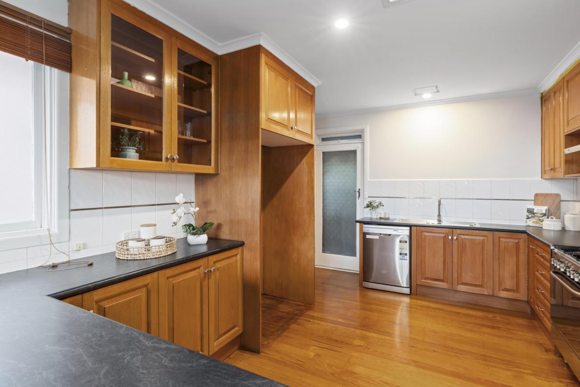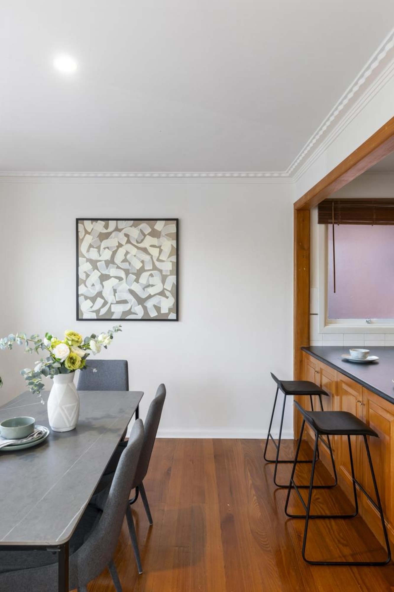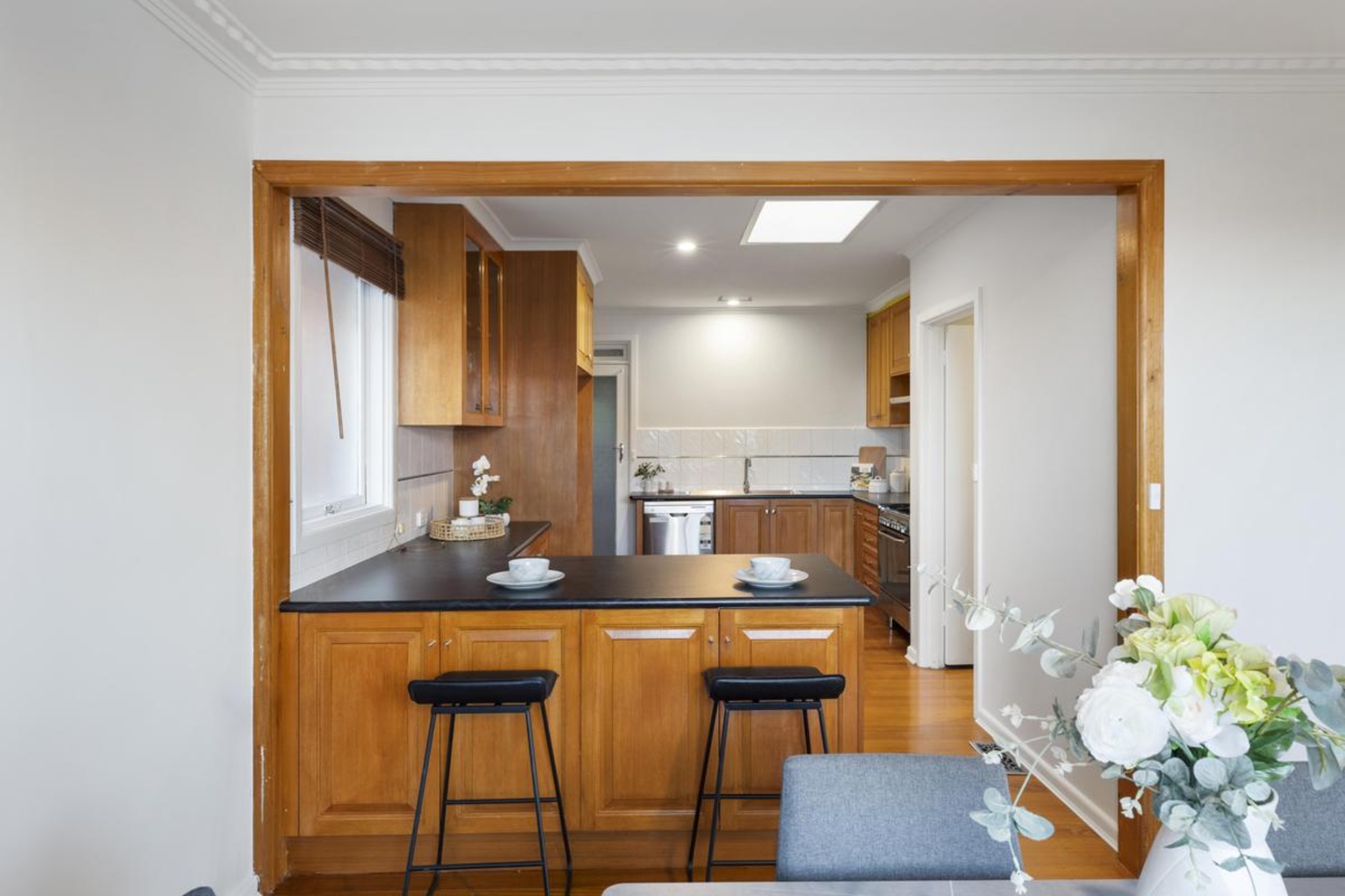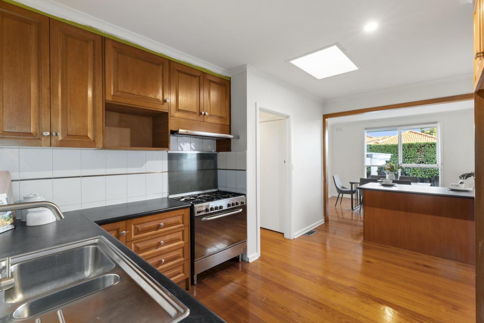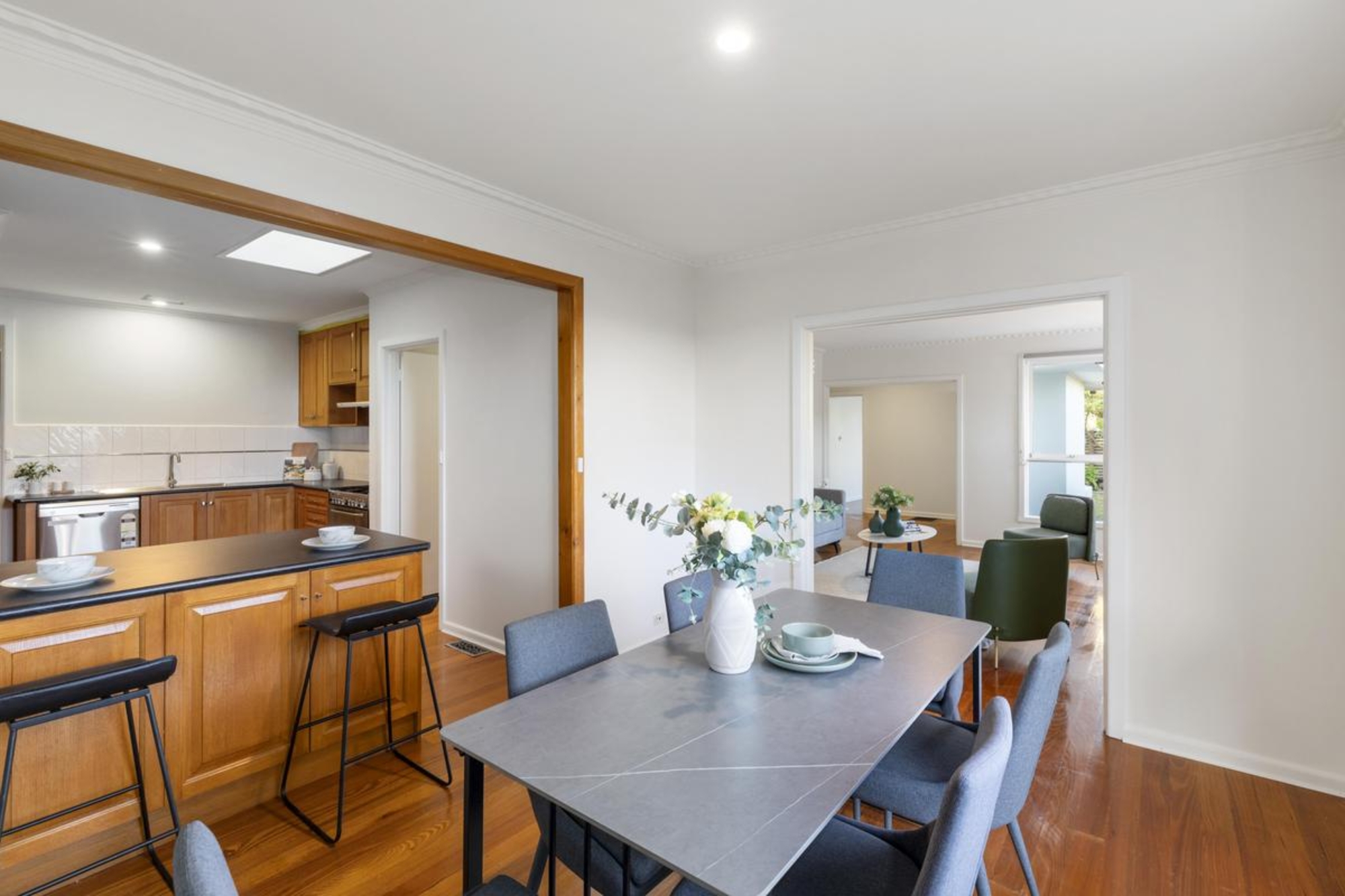 Richly polished timber floors flow throughout, leading to a skylit kitchen and dining domain where stainless steel appliances, timber cabinetry and a wraparound breakfast bar create a warm family hub. A semi-attached living area with ambient gas heating enhances the inviting atmosphere.