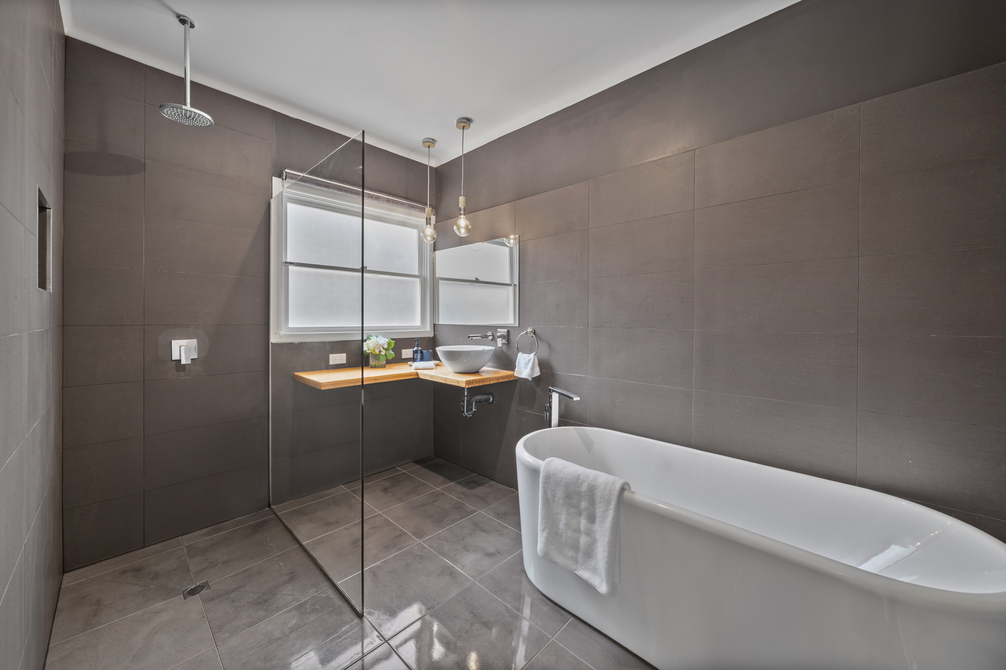 Accommodation includes a spacious master bedroom with walk-in robe and private ensuite, featuring a walk-in shower, floating vanity, and modern finishes. Three additional bedrooms are well proportioned and filled with natural light, serviced by a central bathroom complete with freestanding bathtub, separate shower, and contemporary vanity.