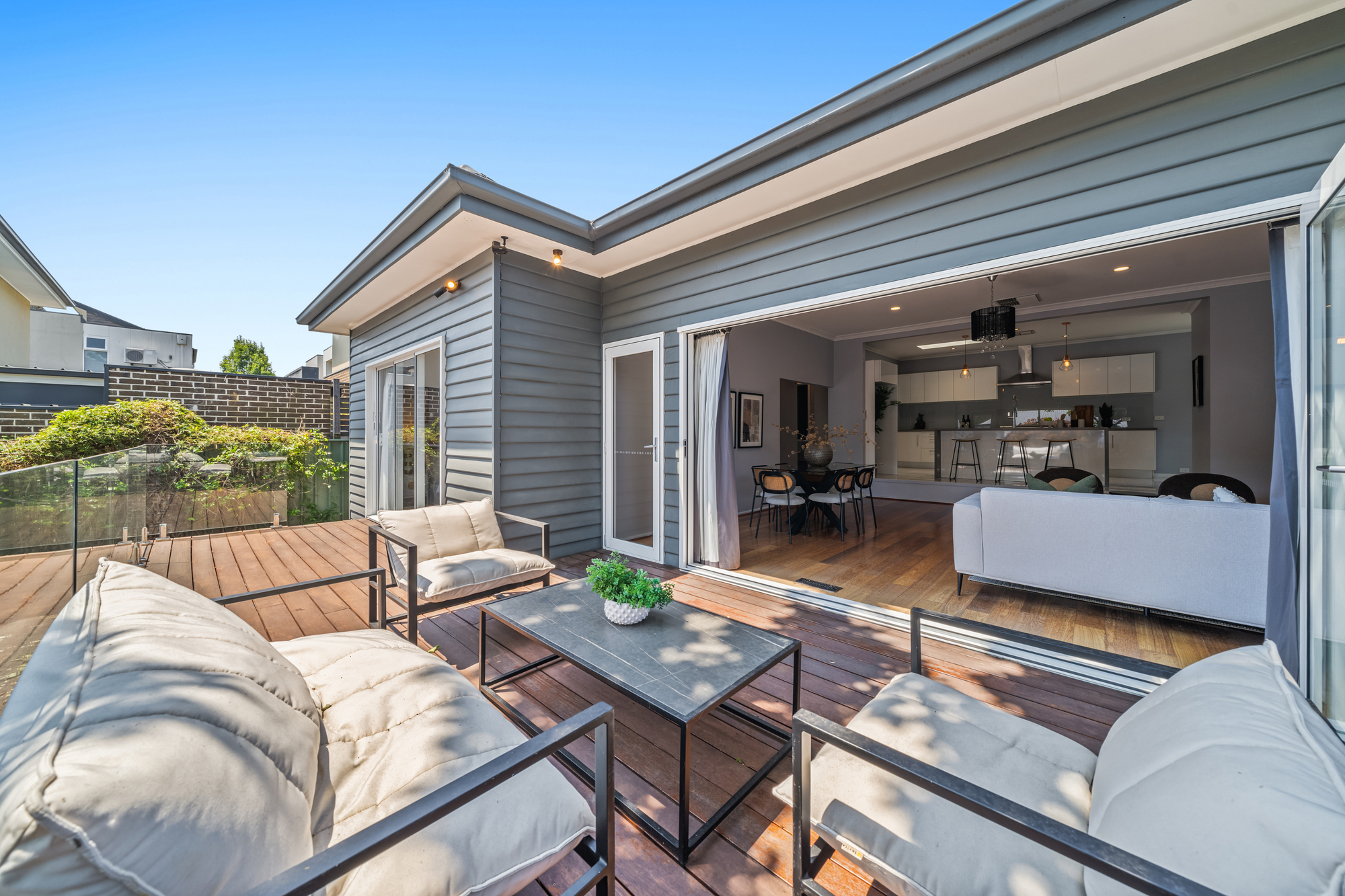 Outdoors, an expansive timber deck extends from the main living area, creating an ideal setting for entertaining or relaxed everyday use. Glass balustrades maintain openness and light, while the elevated, leafy outlook provides privacy and a strong connection to the surrounding greenery.