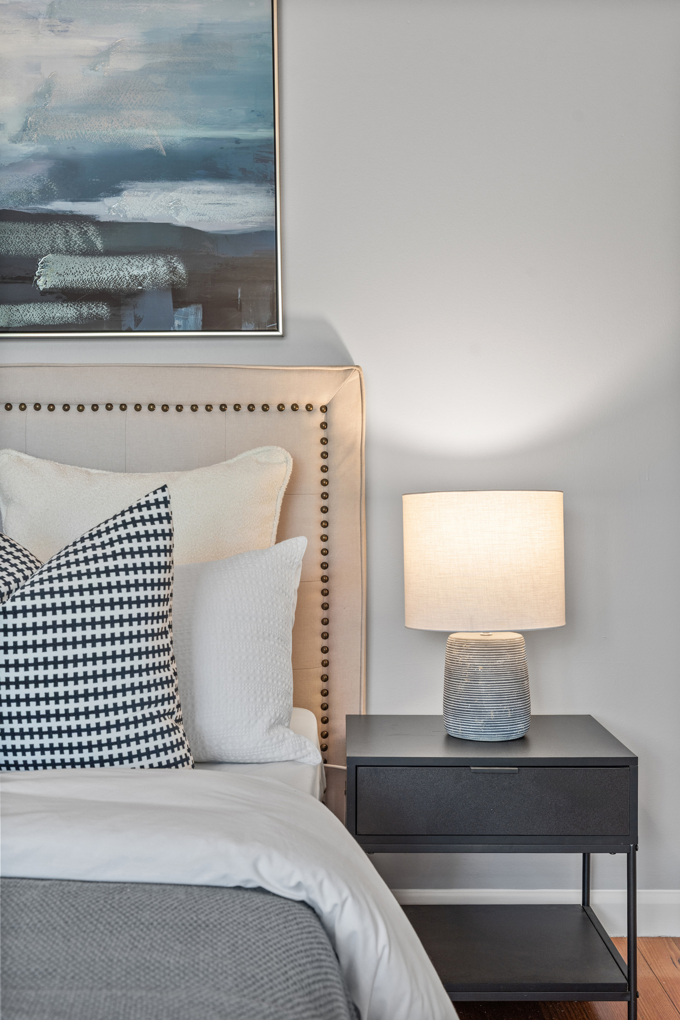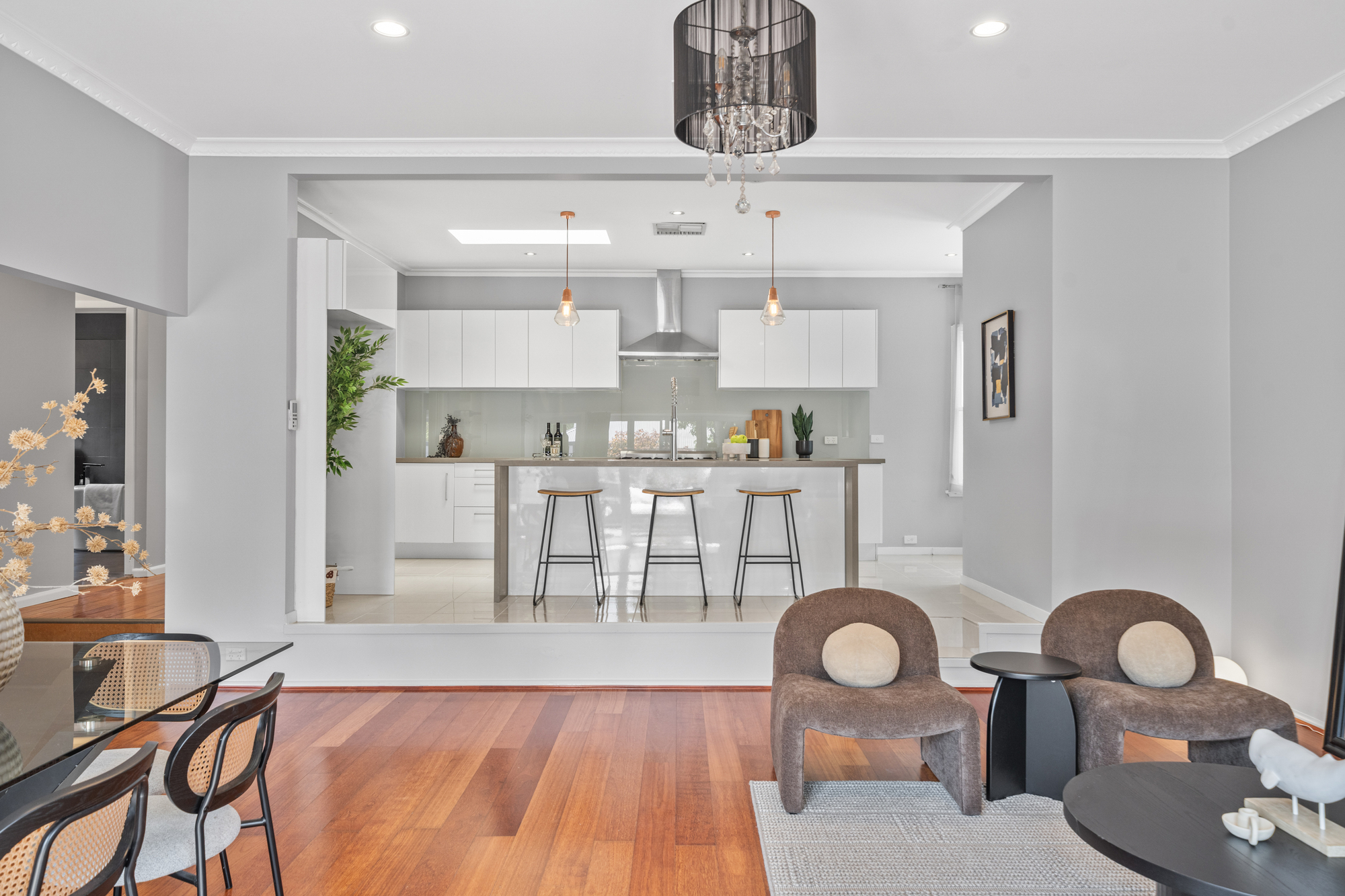 The expansive open-plan living and dining zone is filled with natural light and features warm timber flooring throughout, generous proportions, and a neutral colour palette. Large windows and sliding doors enhance the indoor–outdoor connection, while feature pendant lighting adds character and definition. Evaporative cooling and ducted heating ensure year-round comfort.