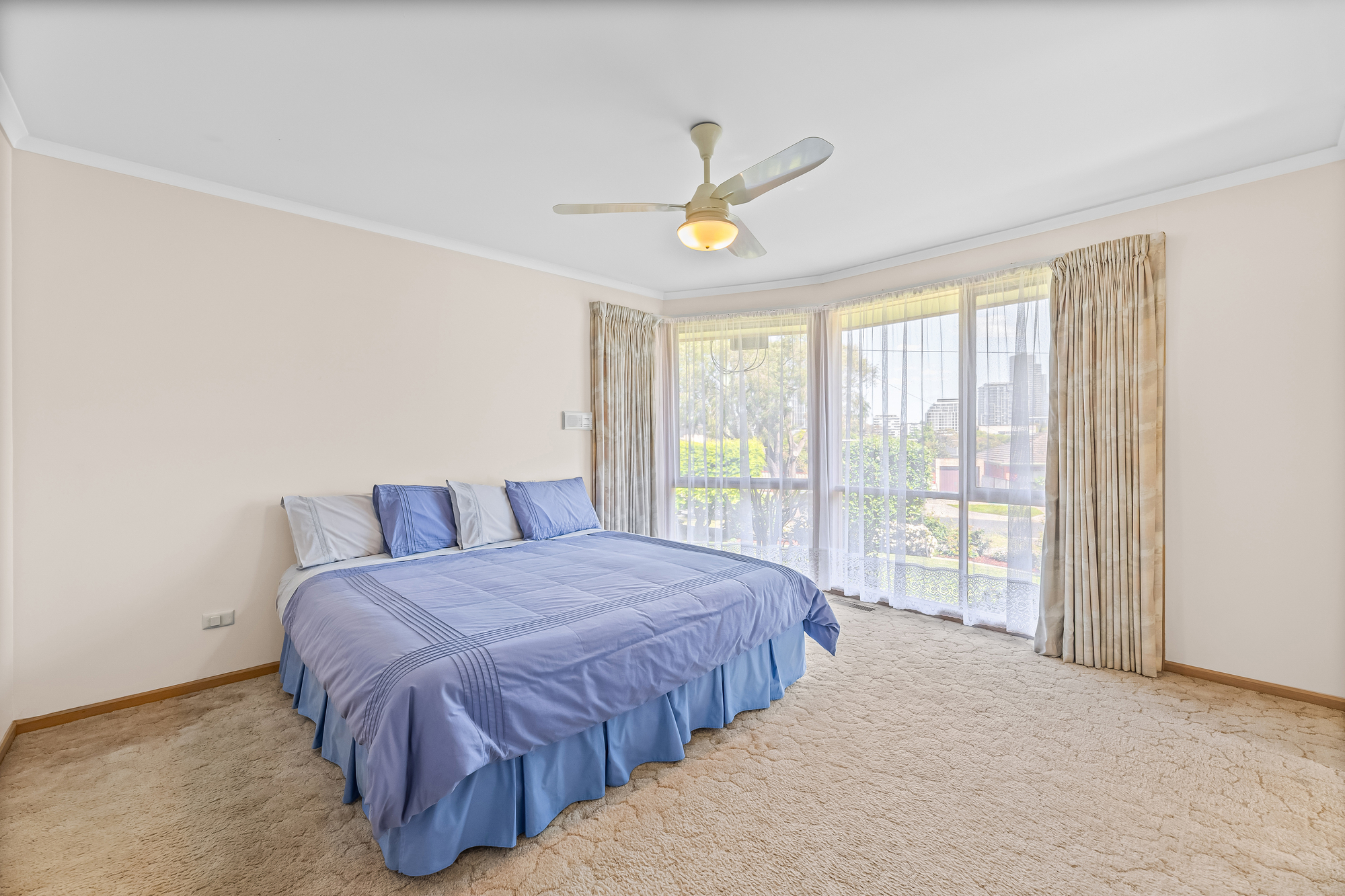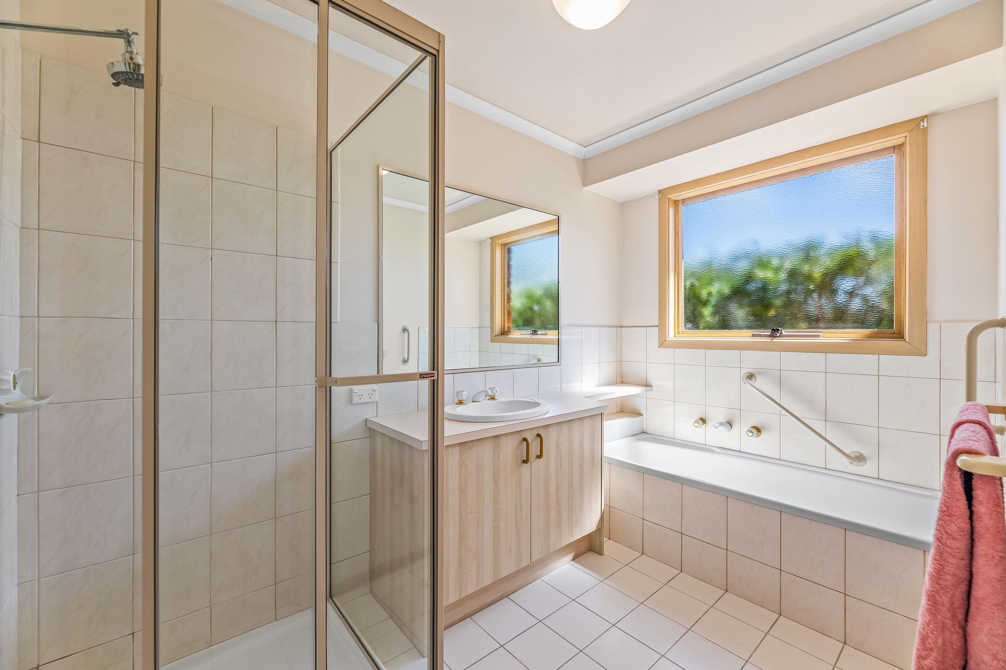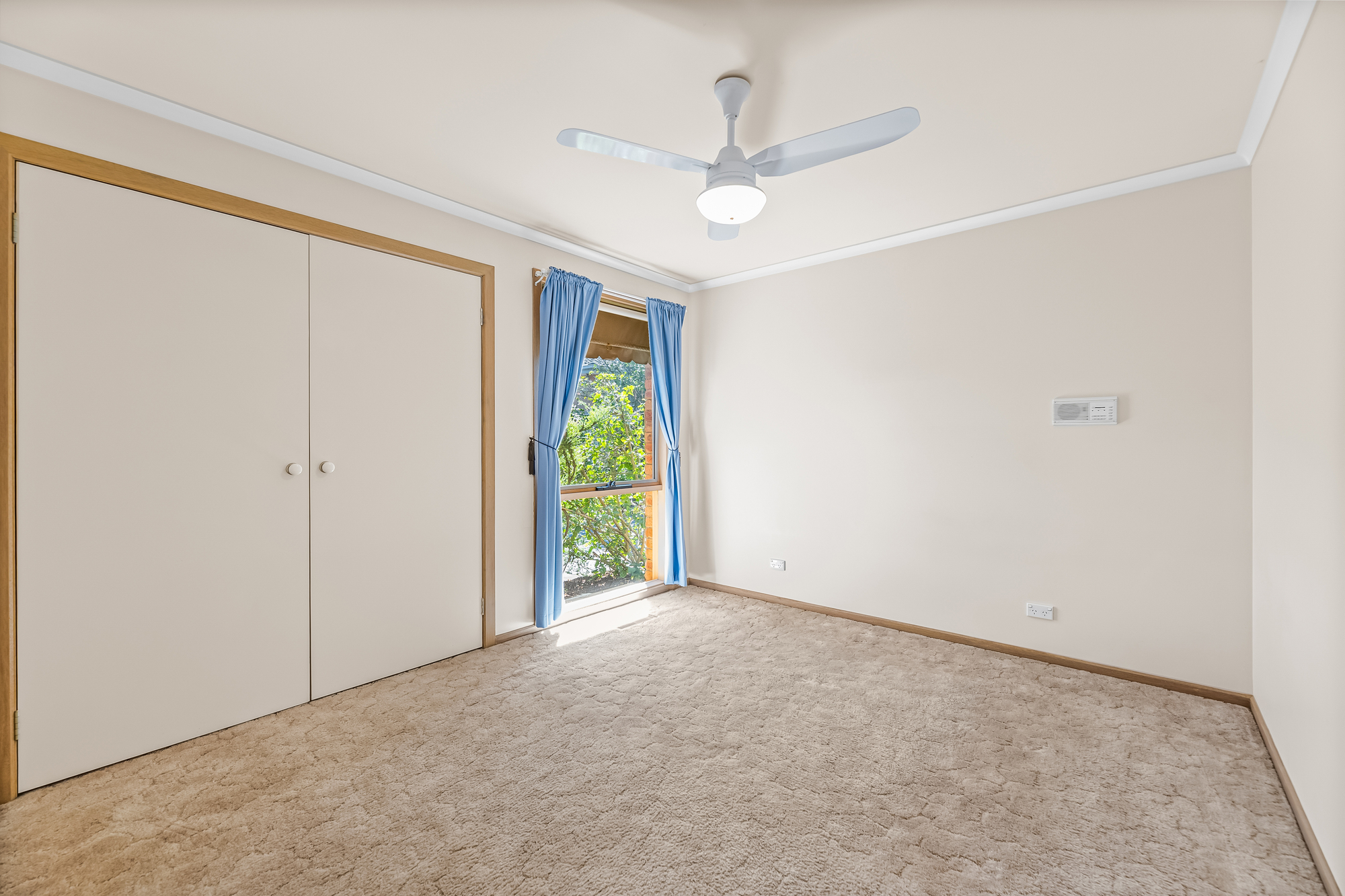 Three well-appointed bedrooms provide comfort for the whole family. The main bedroom features a bay window, walk-in robe, and ensuite, while the remaining bedrooms each include built-in robes, ceiling fans, and carpeted floors. The central bathroom includes tiled floors, a full bath, separate shower, and half-height tiled walls.