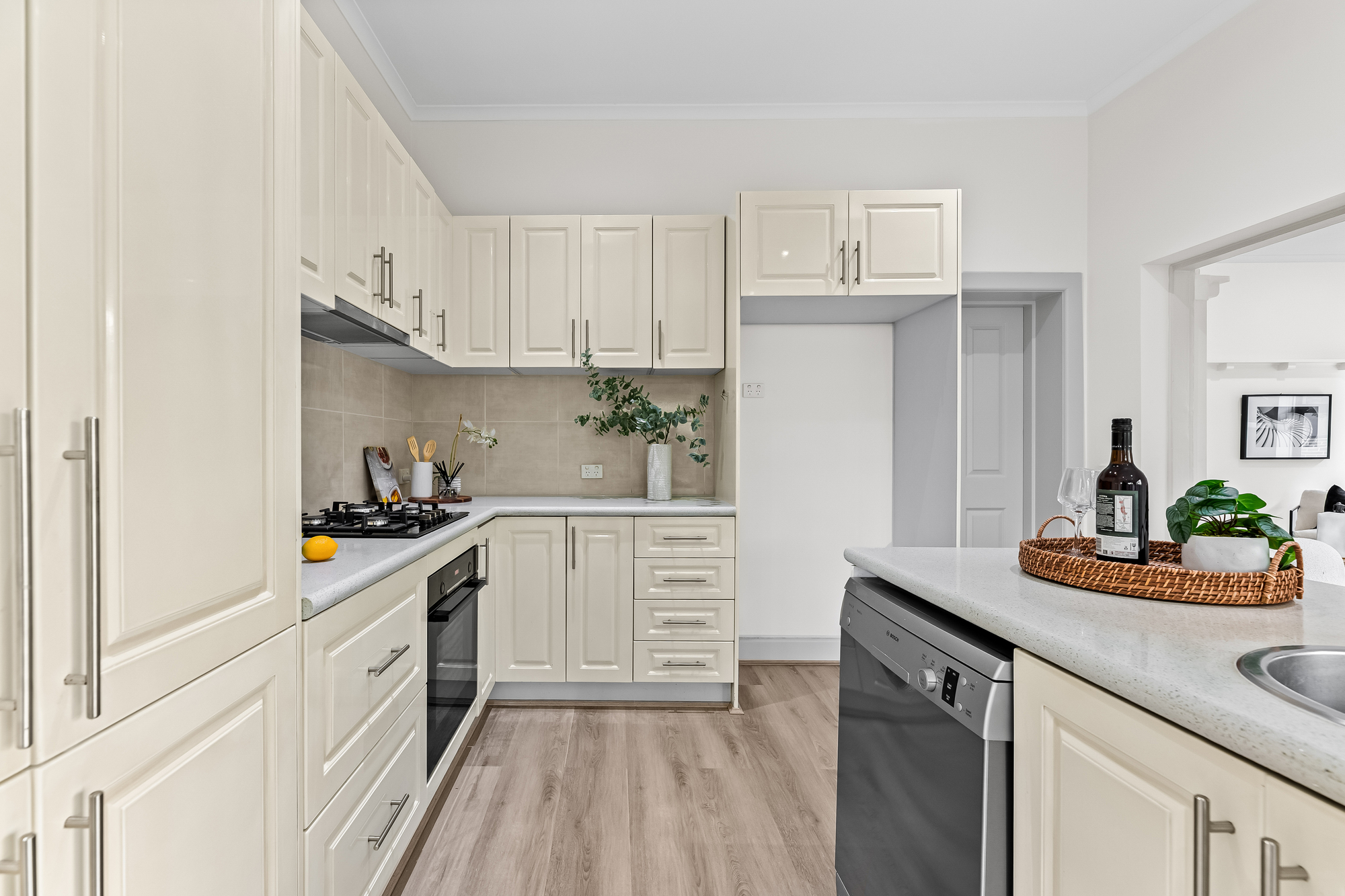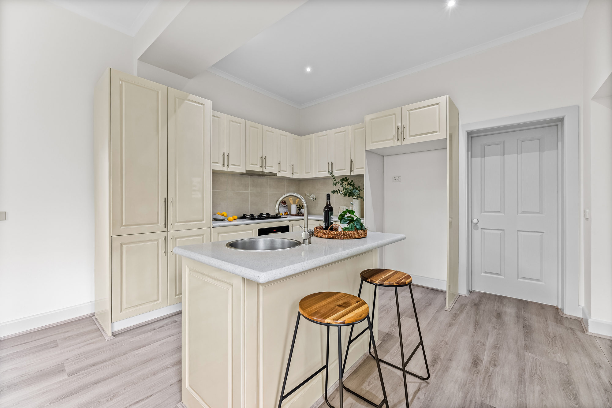 The kitchen is well-appointed with stone benchtops and a stone island bench, all new appliances including a Bosch oven, Bosch gas stove, Bosch dishwasher, a single undermount sink, and overhead storage.