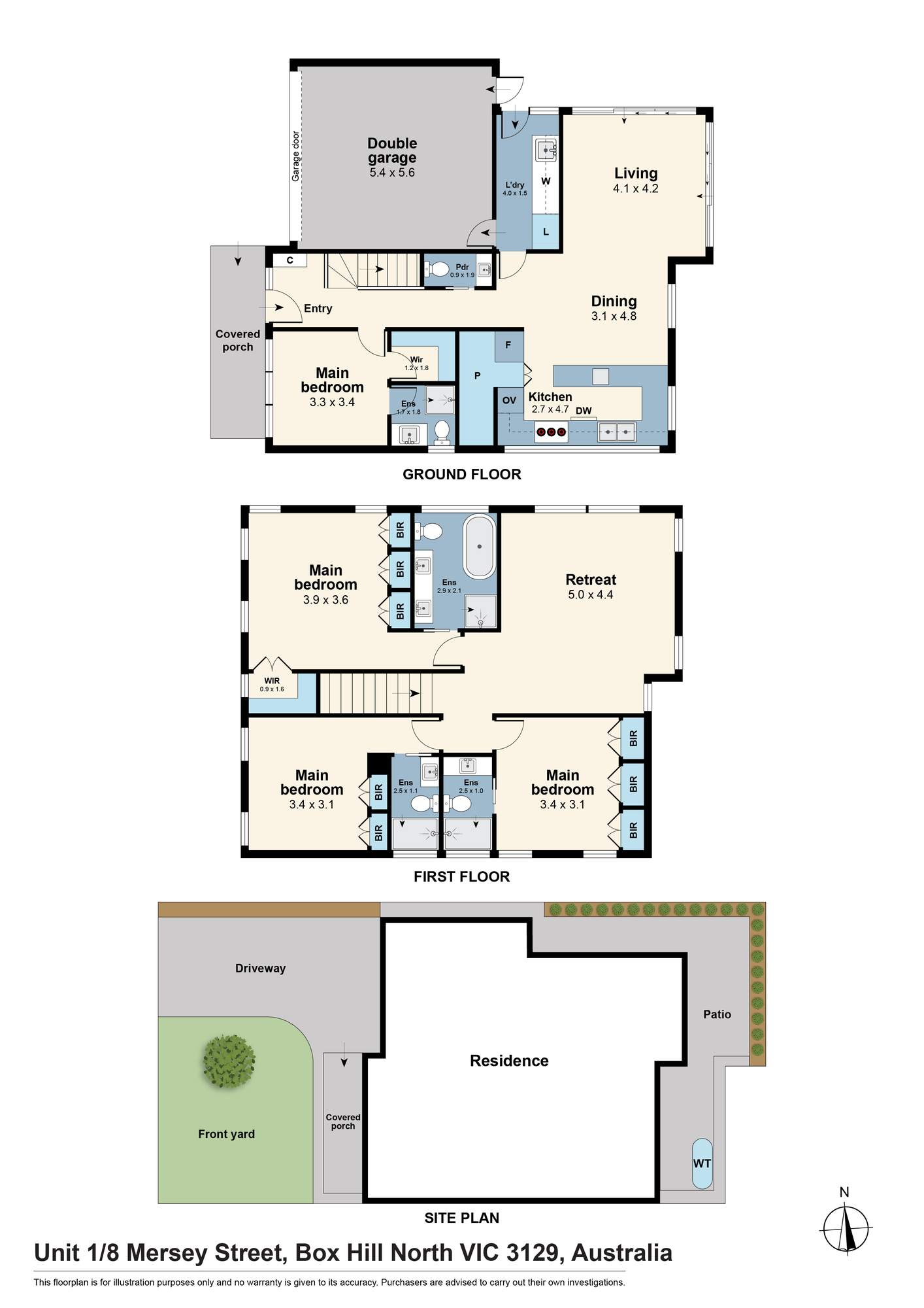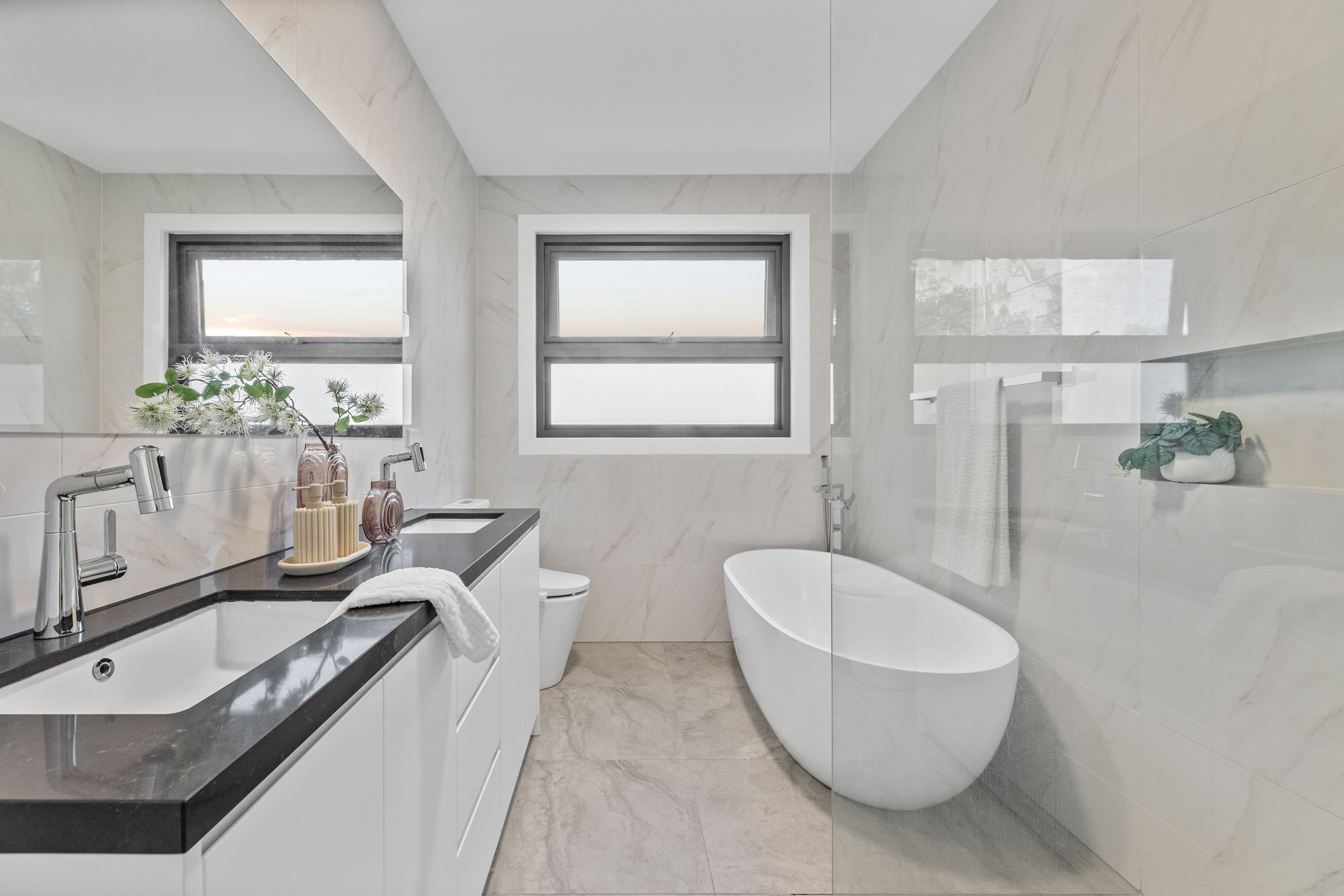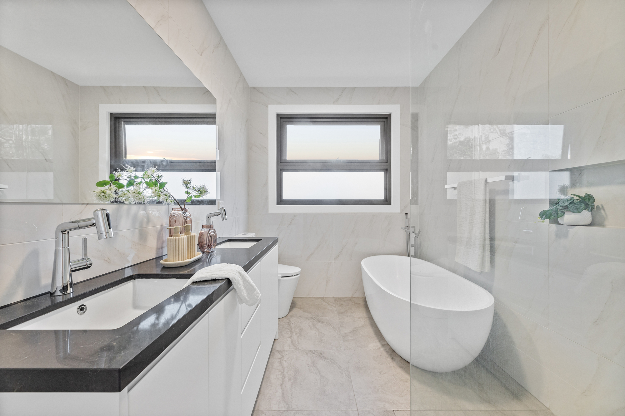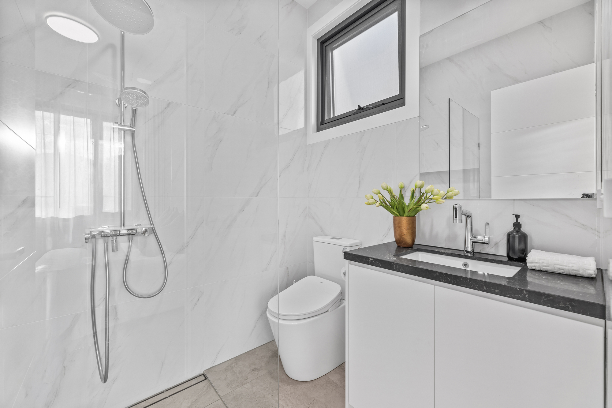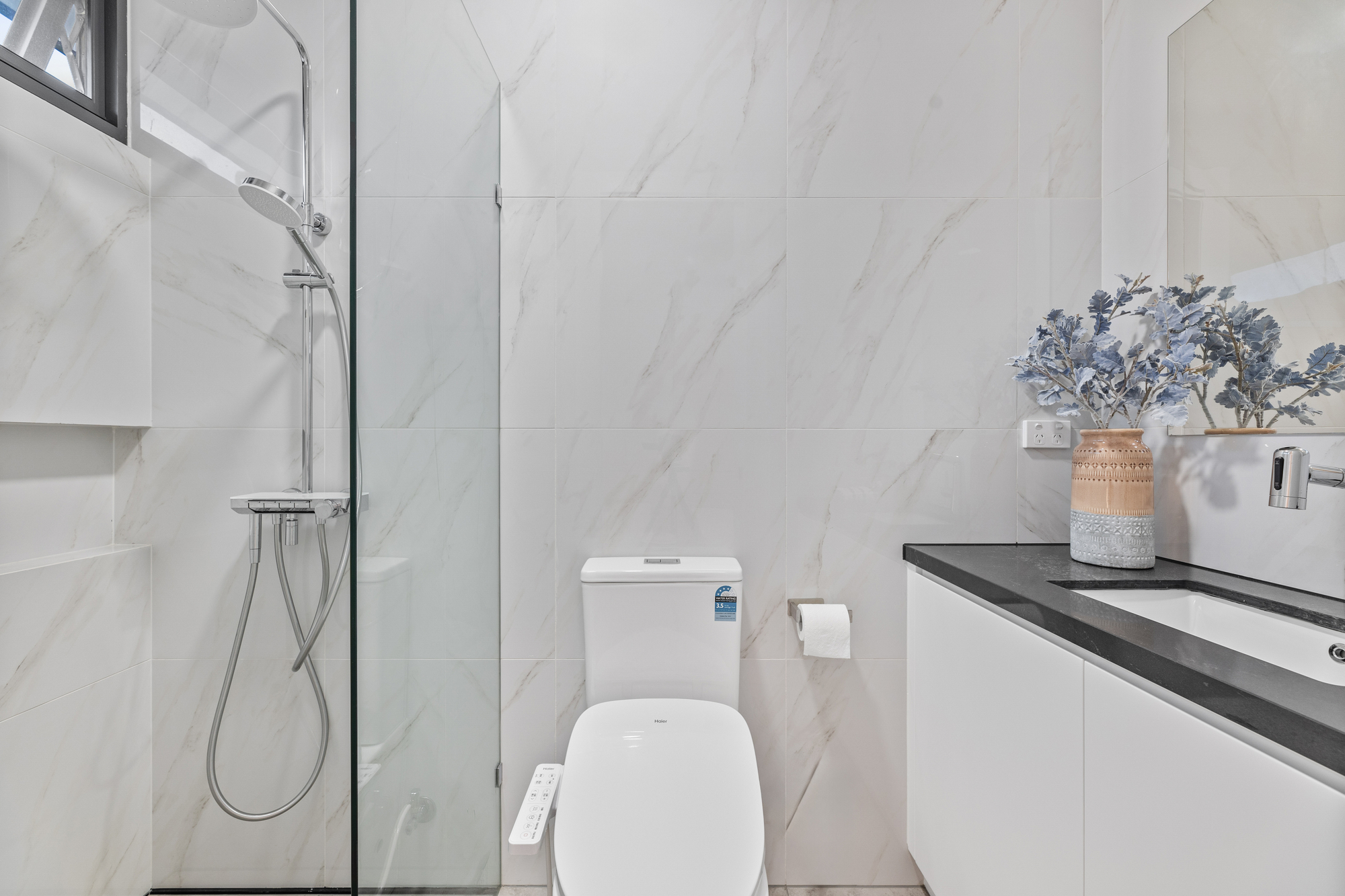 Accommodation comprises four spacious bedrooms, each with built-in wardrobes and private ensuites. The downstairs suite includes timber floors and a walk-in robe, while the main bedroom upstairs adds both a small walk-in and a built-in robe. The main ensuite showcases a full bath, separate shower, double vanity, and floor-to-ceiling tiles.