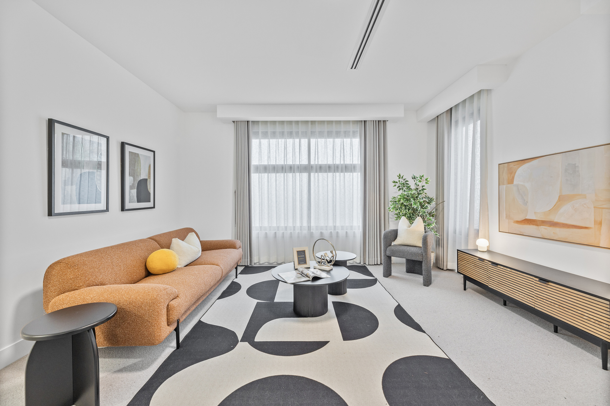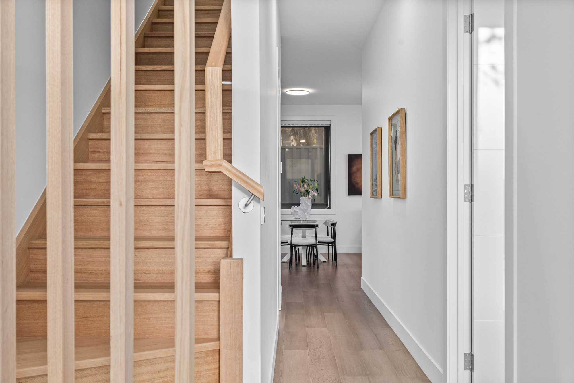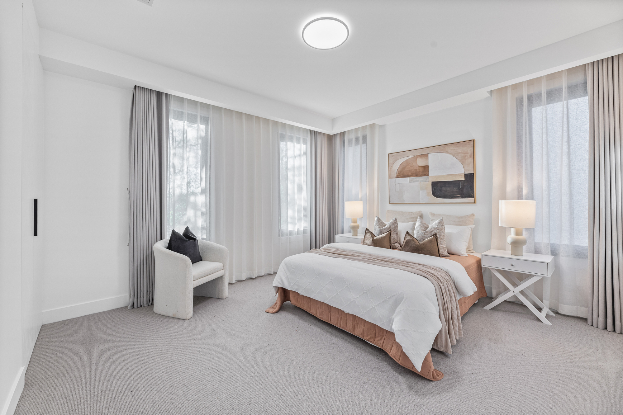 Upstairs, a generous retreat provides an additional living area surrounded by three carpeted bedrooms. Further features include a wide and extra-high entrance door, 3.0m ceiling height on the ground level (2.7m upstairs), oak staircase with removable screen, boutique heavy-duty windows and sliding doors, square-set cornices, and double curtains with pelmets.