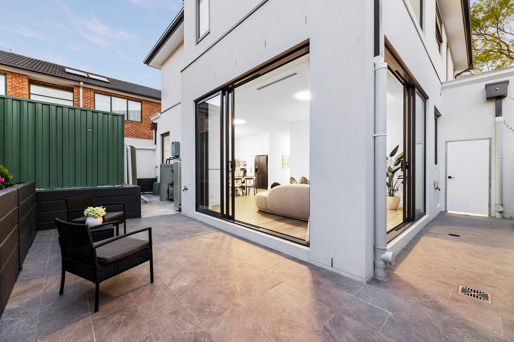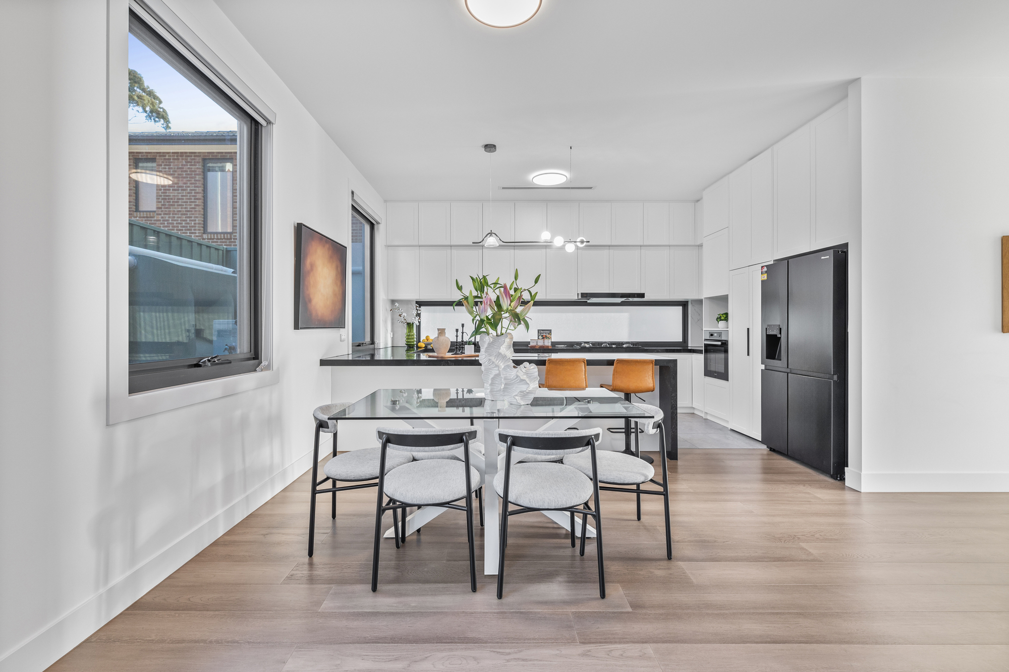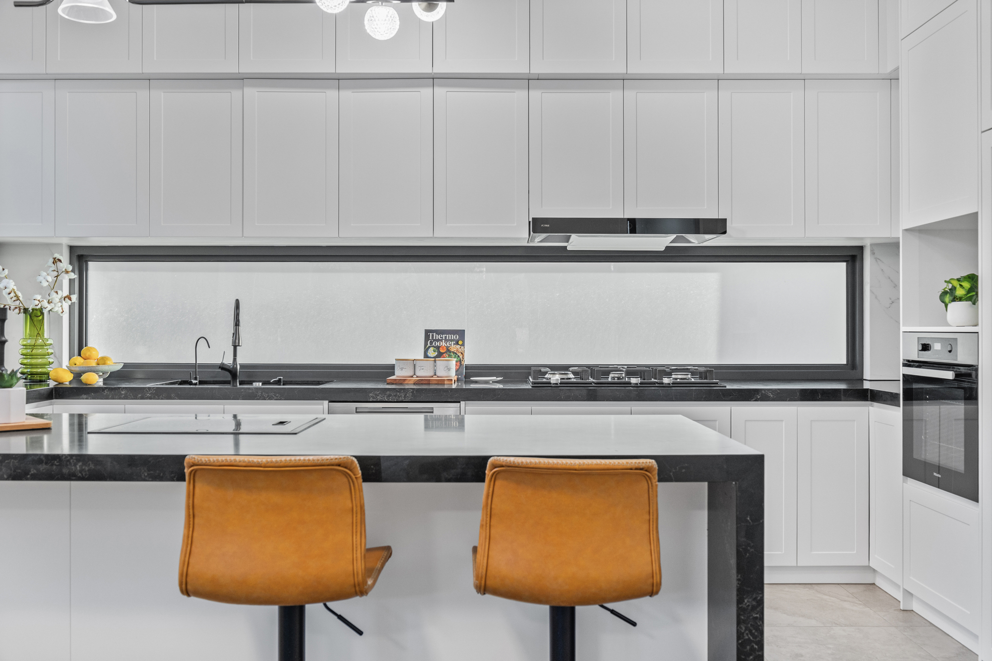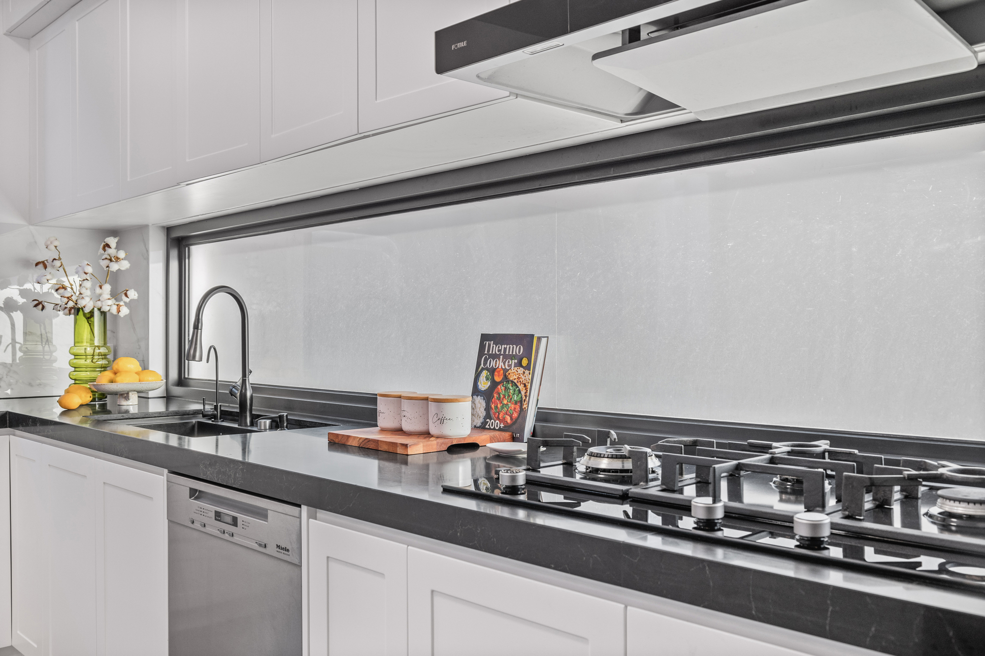 The open-plan living, dining, and kitchen area is bathed in natural light, enhanced by engineered timber flooring and dual stacker doors that open seamlessly to the landscaped backyard – perfect for indoor-outdoor entertaining. The kitchen combines function and sophistication, featuring stone benchtops, 2-pac white cabinetry, tiled floors, and a bench that comfortably seats five. Premium Miele appliances include a wall-mounted oven, dishwasher, and a Fotile gas stove with a Fotile rangehood. Further highlights include an extra hidden sink for washing vegetables, a concealed pantry, extensive overhead and under-bench storage, and a large single undermount sink with modern fittings.