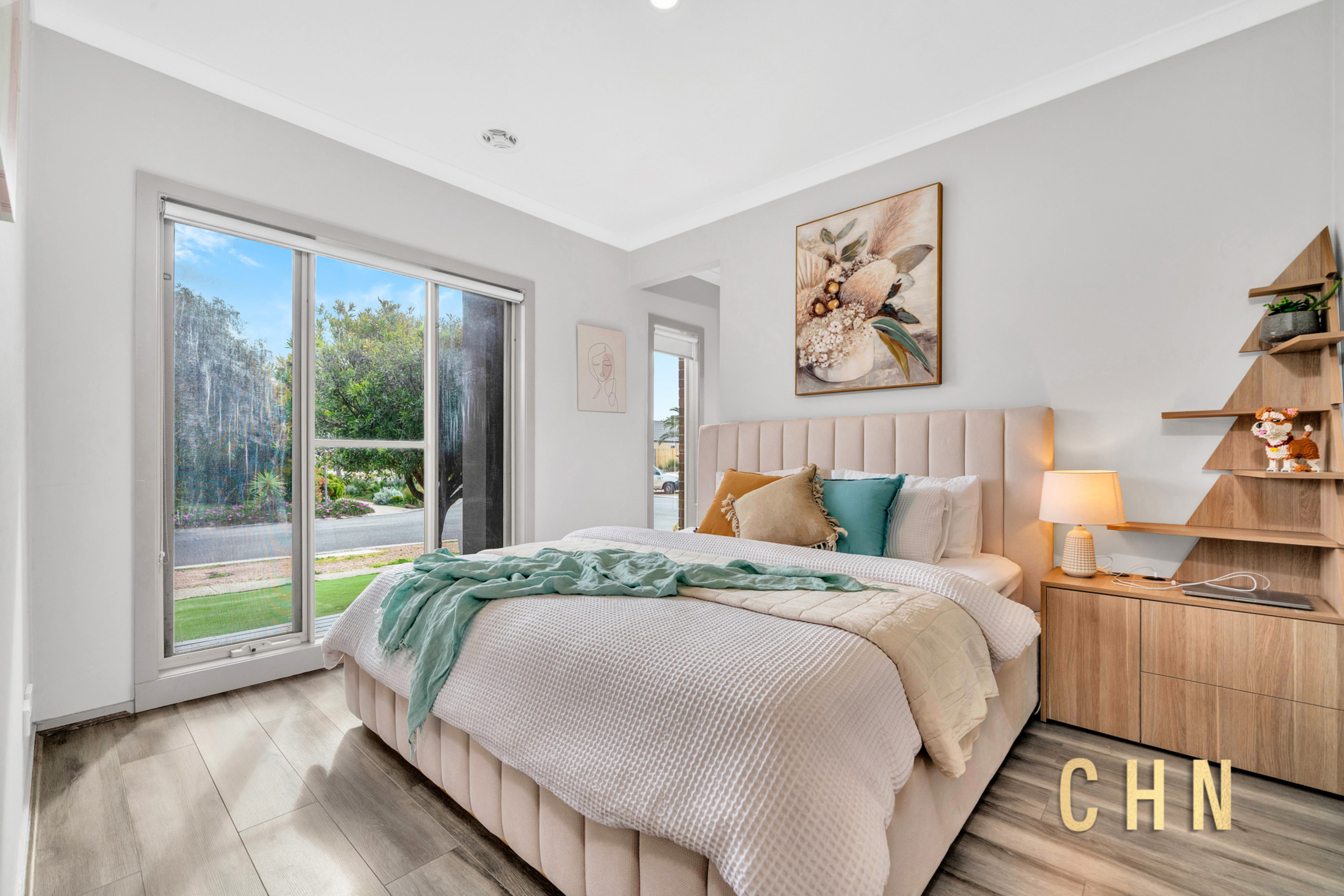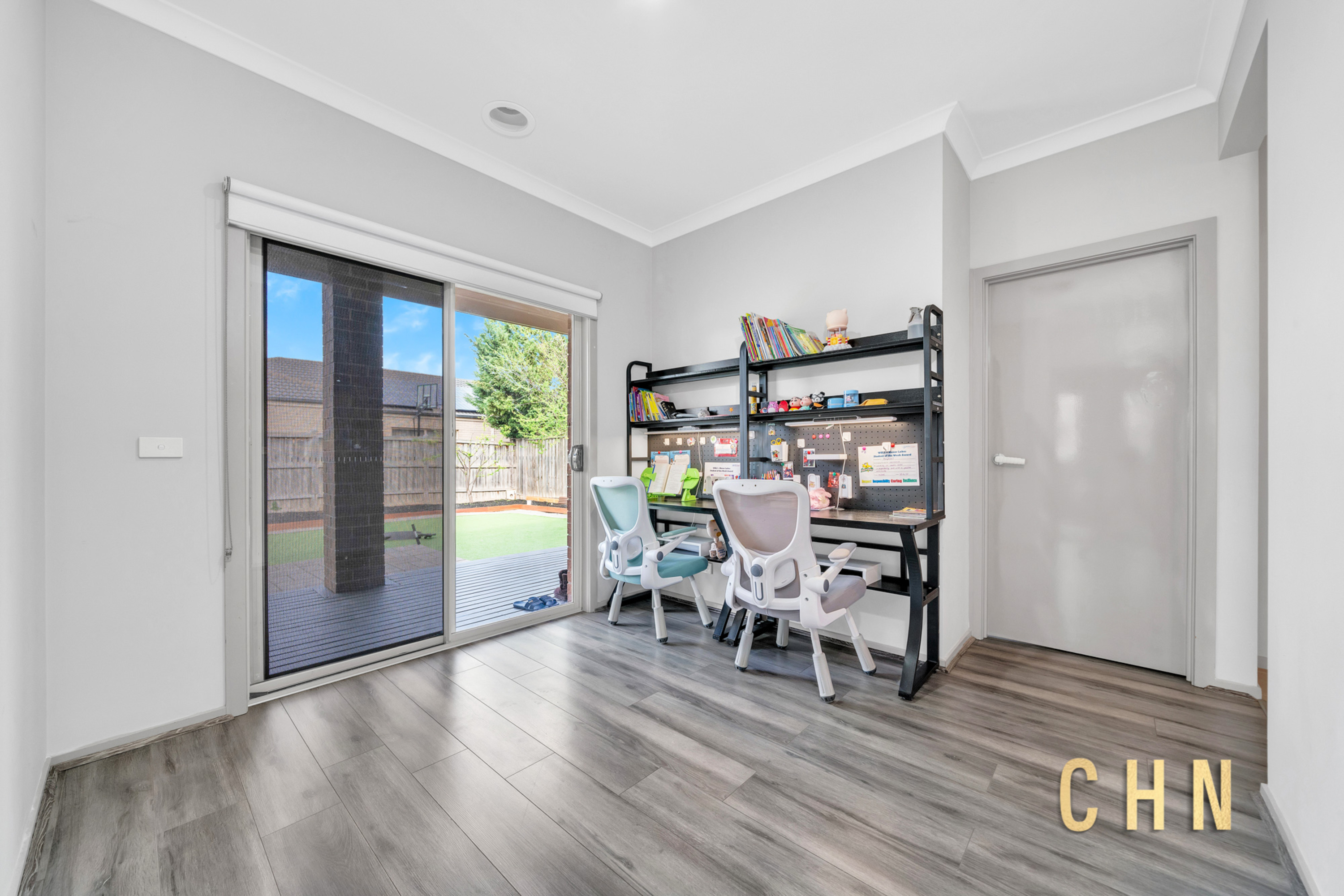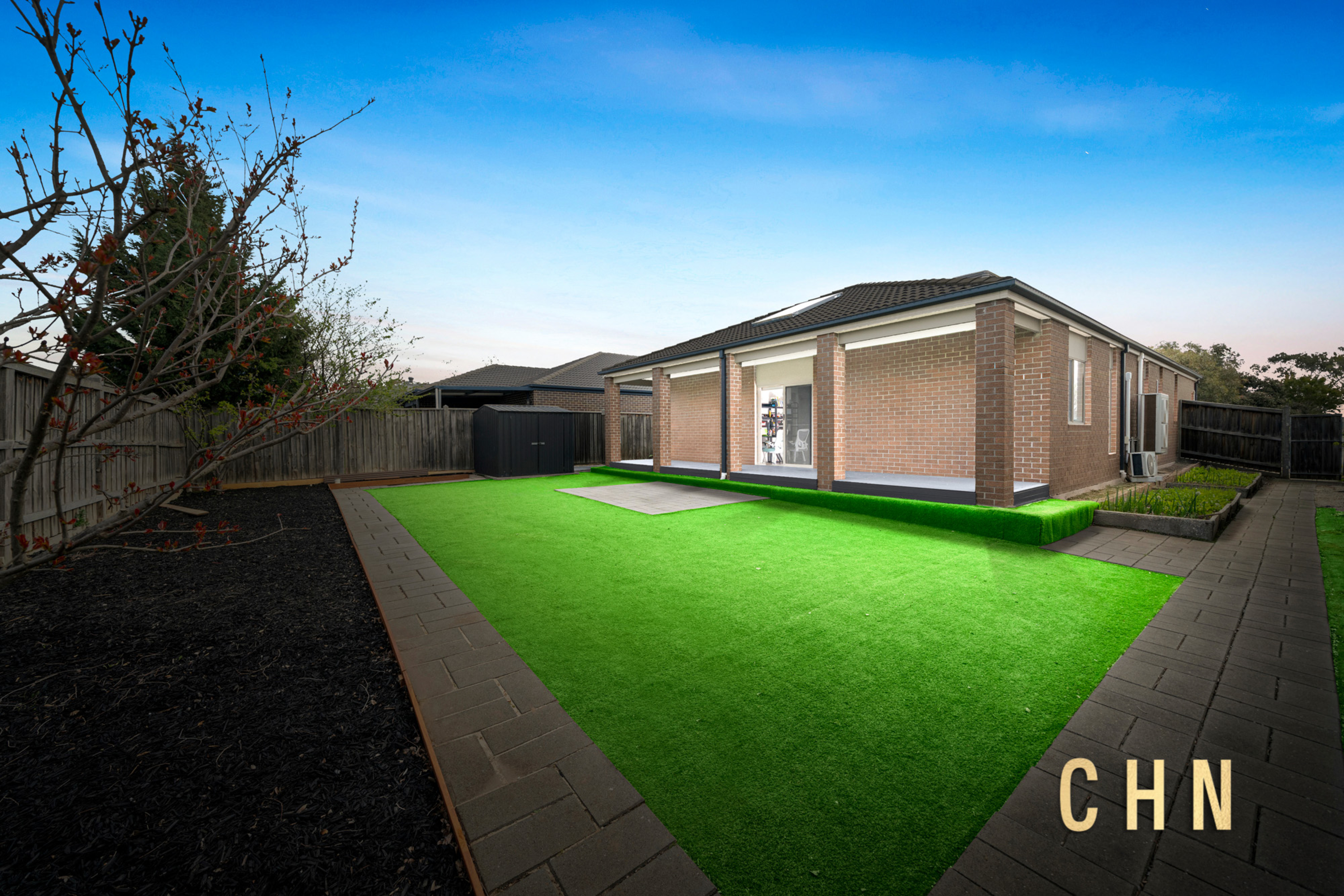 Step outside to the roofed alfresco with elevated decking, overlooking a spacious, artificial grass–paved backyard complete with a garden shed and boxed garden beds — perfect for gardening enthusiasts or families who love outdoor living without the maintenance.