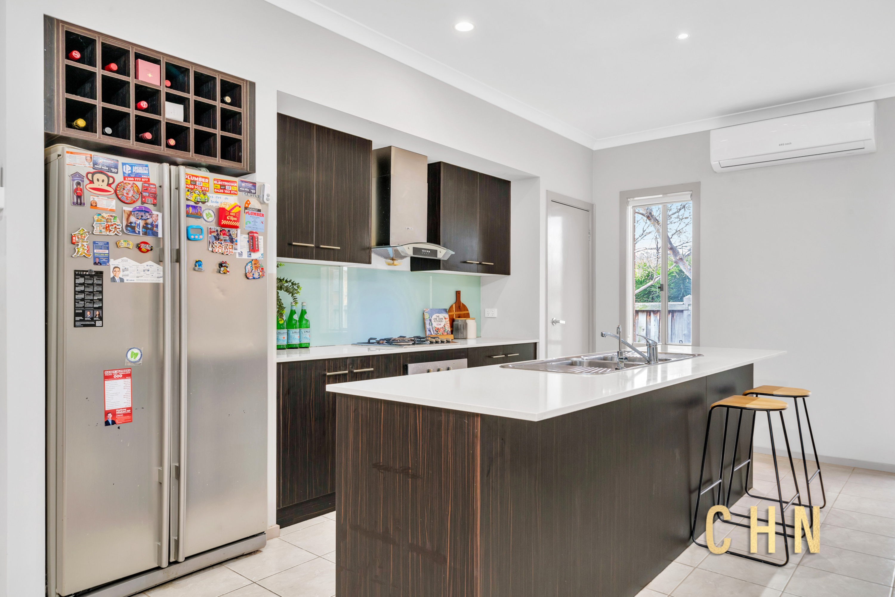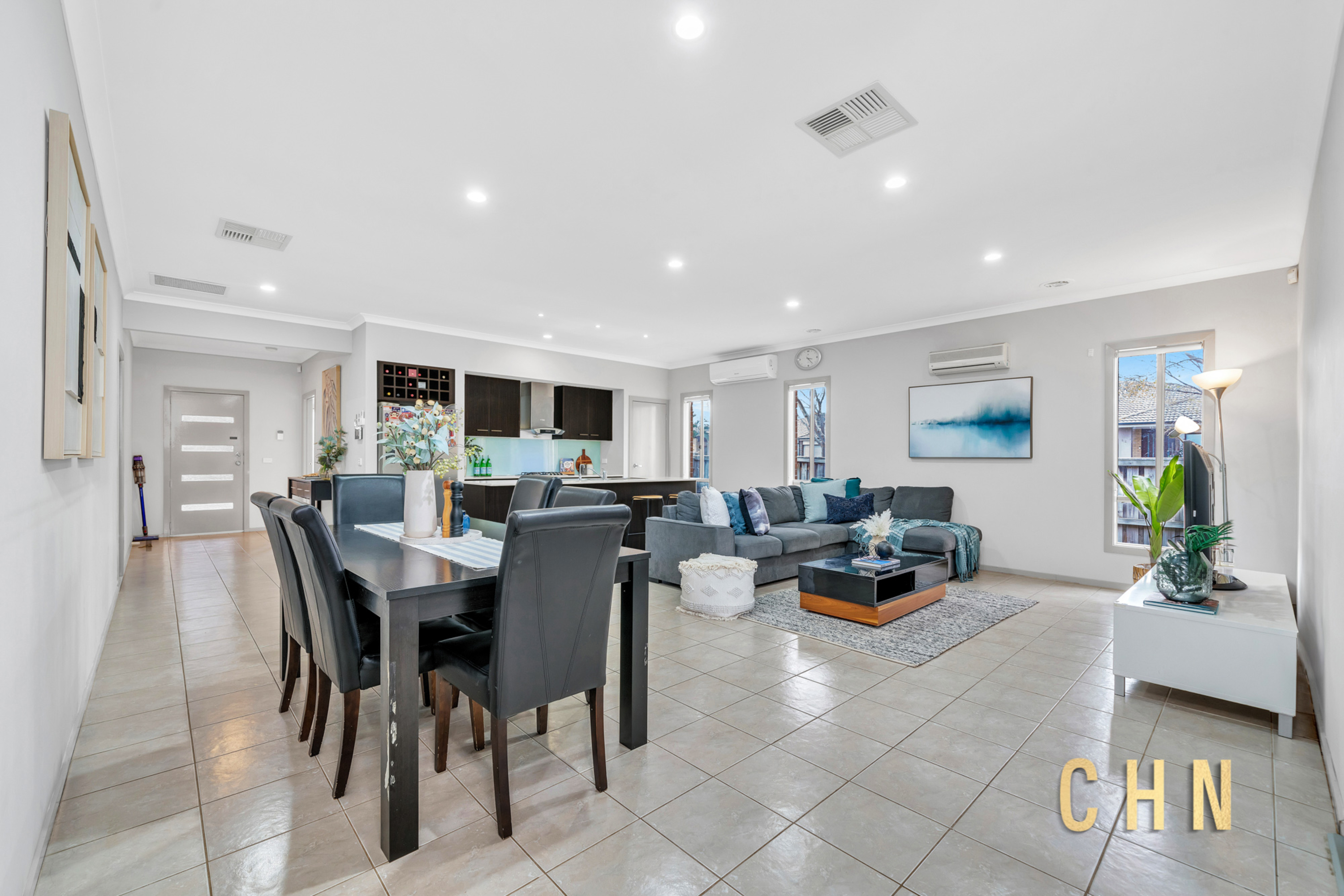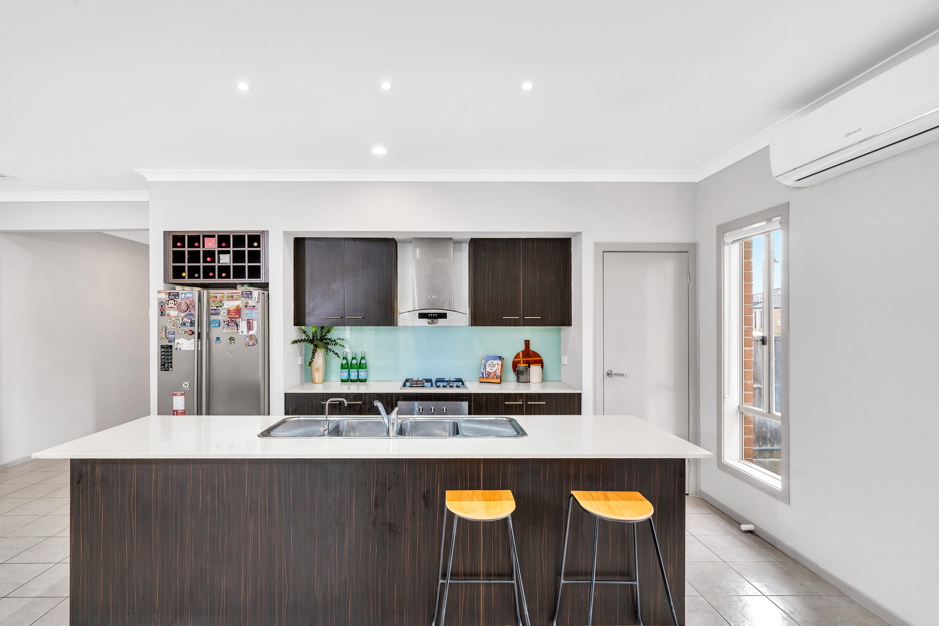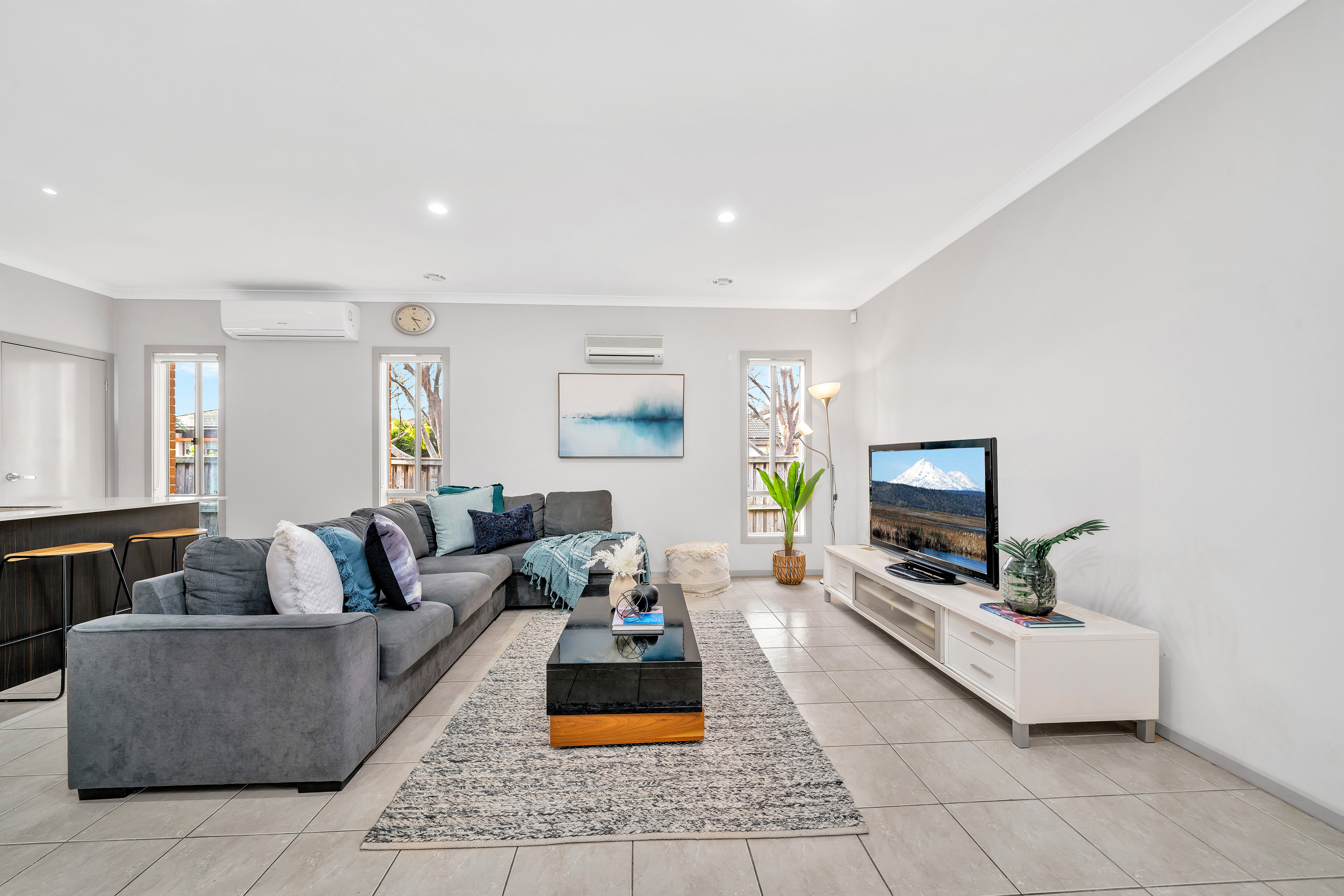 The light-filled main living area is the heart of the home, enhanced by dual split system cooling and seamless flow to the dining and kitchen zones. The modern kitchen is appointed with a stone island/breakfast bar, gas appliances, dishwasher, built-in pantry, and ample storage. A second living area at the rear provides flexibility as a home office or entertainment space, with direct backyard access through glass sliding doors with flyscreens.
