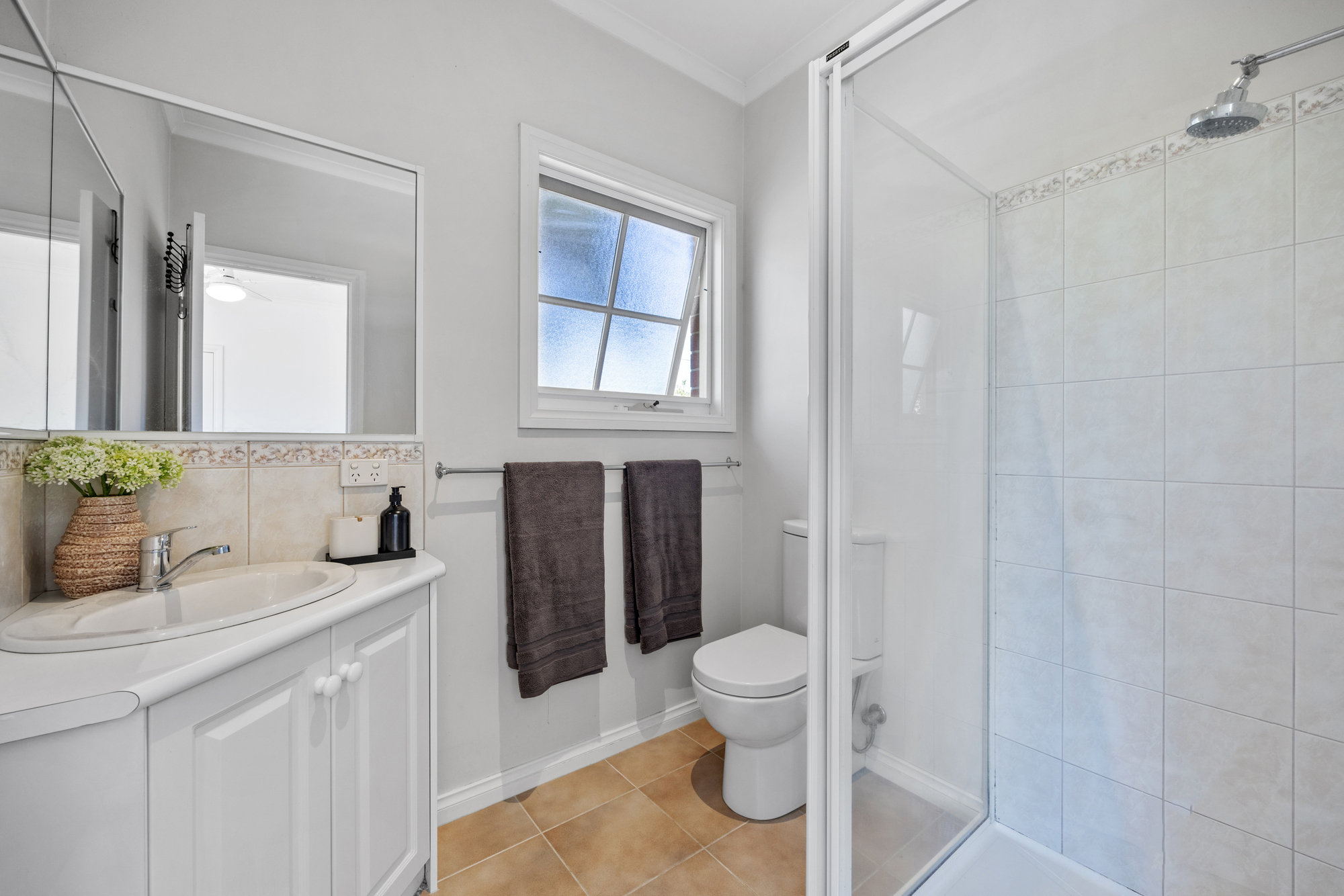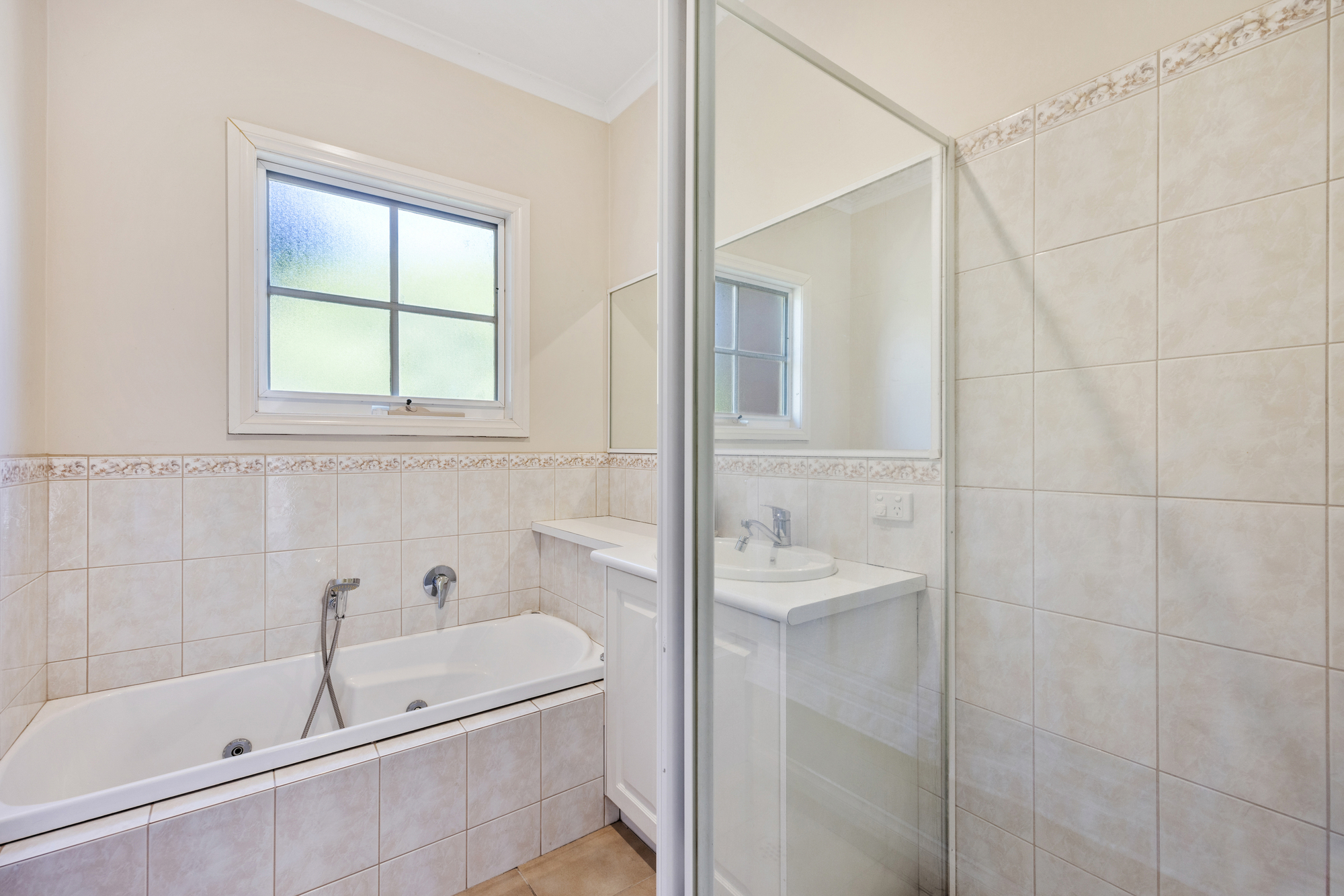 Both bathrooms are tiled and include single vanities with laminate benchtops, while the central bathroom features a bathtub and separate WC for family practicality. A fitted-out laundry with external access adds everyday functionality.
