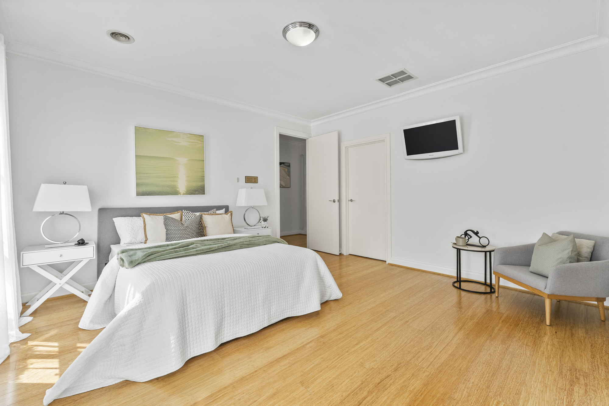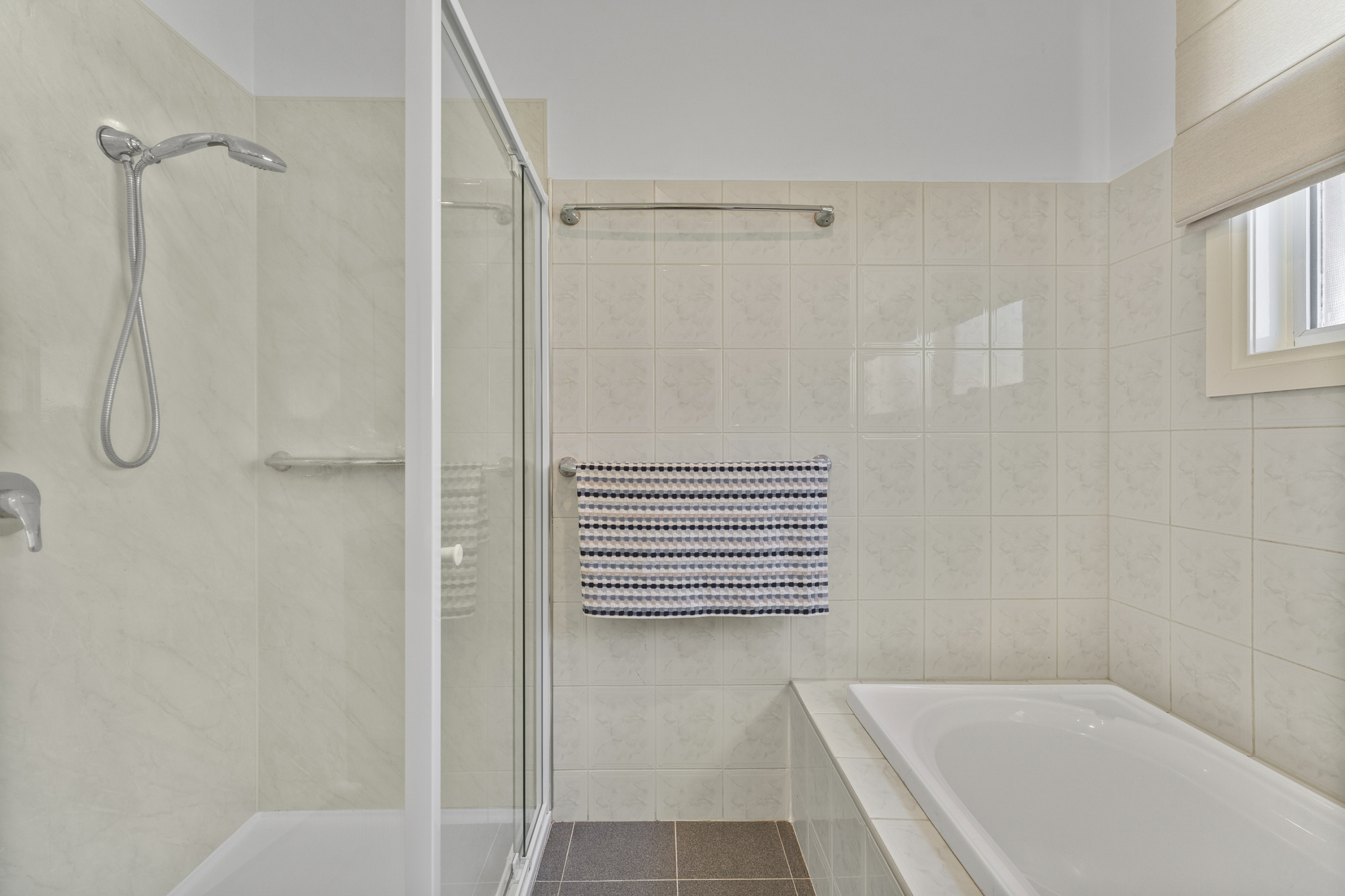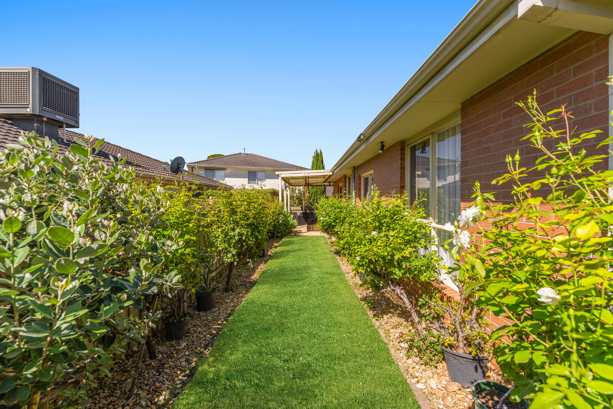 Accommodation includes four generously sized bedrooms, all with built-in robes. The master is a true retreat, with a walk-in robe and private ensuite featuring a spa bathtub, dual vanity, and large storage underneath. The main bathroom services the remaining bedrooms and includes a bathtub, shower, and single vanity, while a separate powder room adds convenience for family living. Additional features of the home include split system heating and cooling throughout (with one unit in each bedroom and main living areas), ducted heating, evaporative cooling, and an intercom system. A full-sized laundry with external access and ample storage throughout the home add to its practicality.
