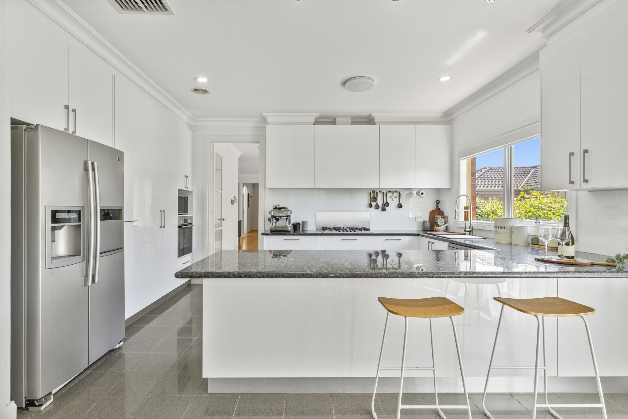 The open-plan living, dining, and kitchen zone provides a spacious, light-filled area perfect for both everyday living and entertaining. The kitchen is a standout feature with ample bench space, a breakfast bar, marble stone benchtops, a gas cooktop, electric oven, dishwasher and a walk-in pantry, making it the ideal space for cooking and hosting guests. The formal dining and living rooms provide additional flexibility, offering separation for more formal or quiet family time.
