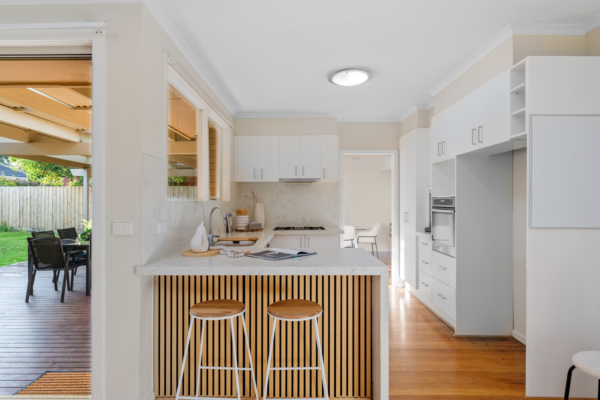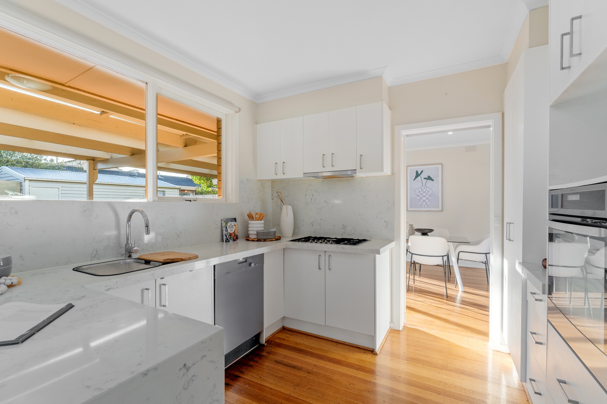 For culinary enthusiasts, the stone-renovated kitchen is a standout feature, boasting Miele appliances and ample space for meal preparation and casual dining. It connects seamlessly to the large outdoor entertaining area on the deck – ideal for hosting friends and family during those warm summer evenings.