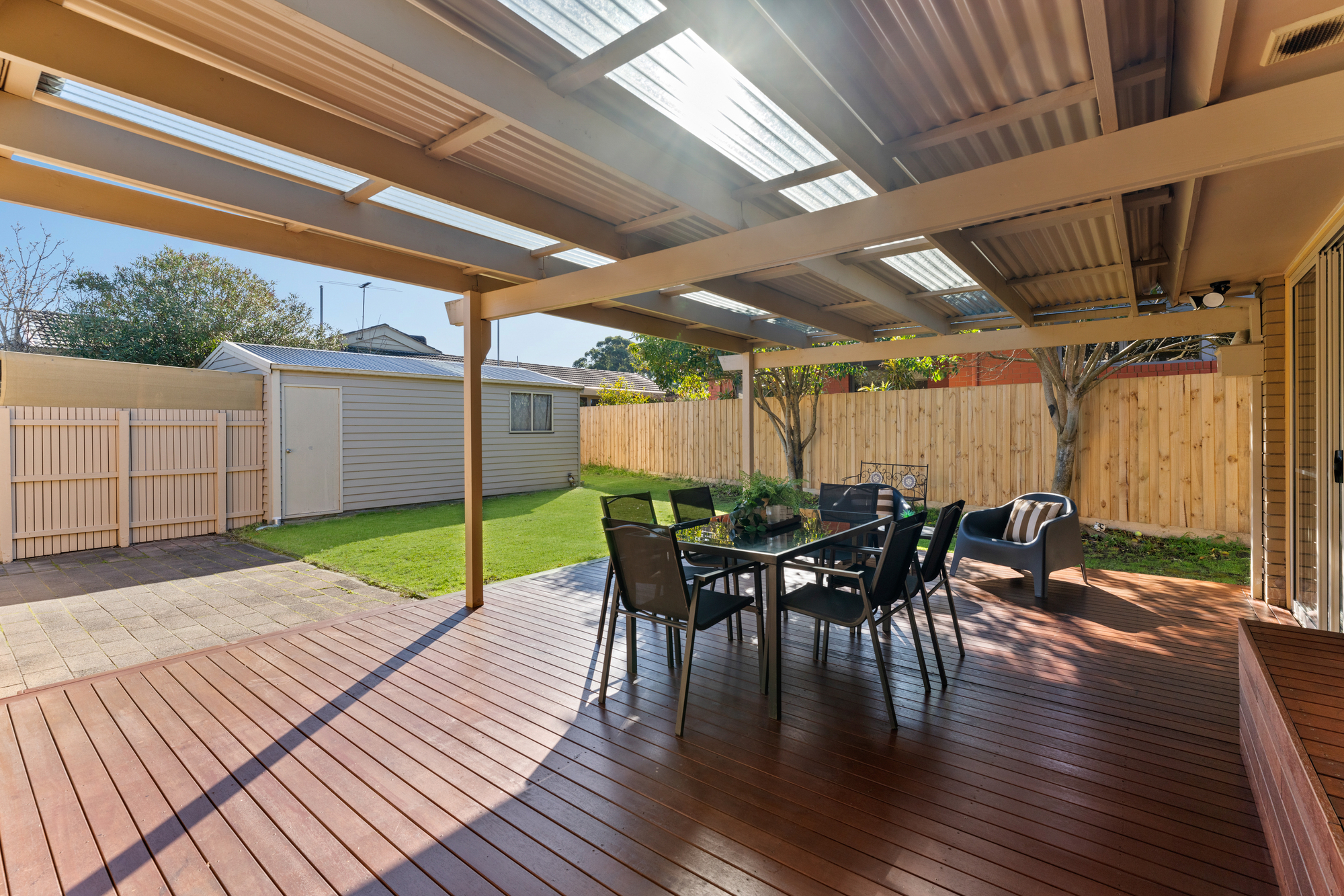 New LED ceiling lights illuminate the living spaces, enhancing the home’s contemporary appeal. Practicality meets convenience with additional features including a large shed that can be utilised as an extra family room or for storage needs. The carport with a garage or workshop offers versatile use, while undercover parking for two cars ensures security. Moreover, the home is equipped with security cameras and an alarm system for added peace of mind.