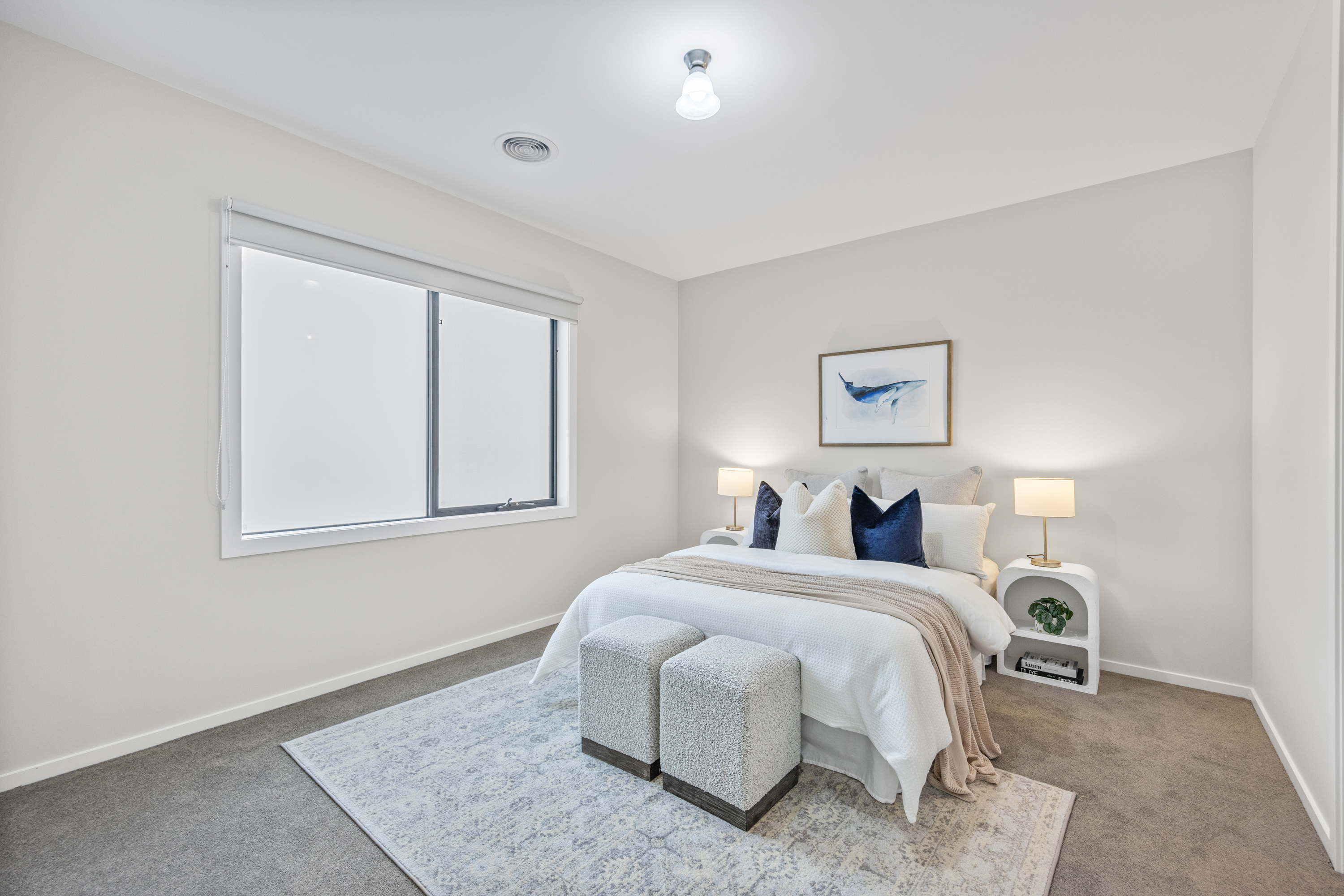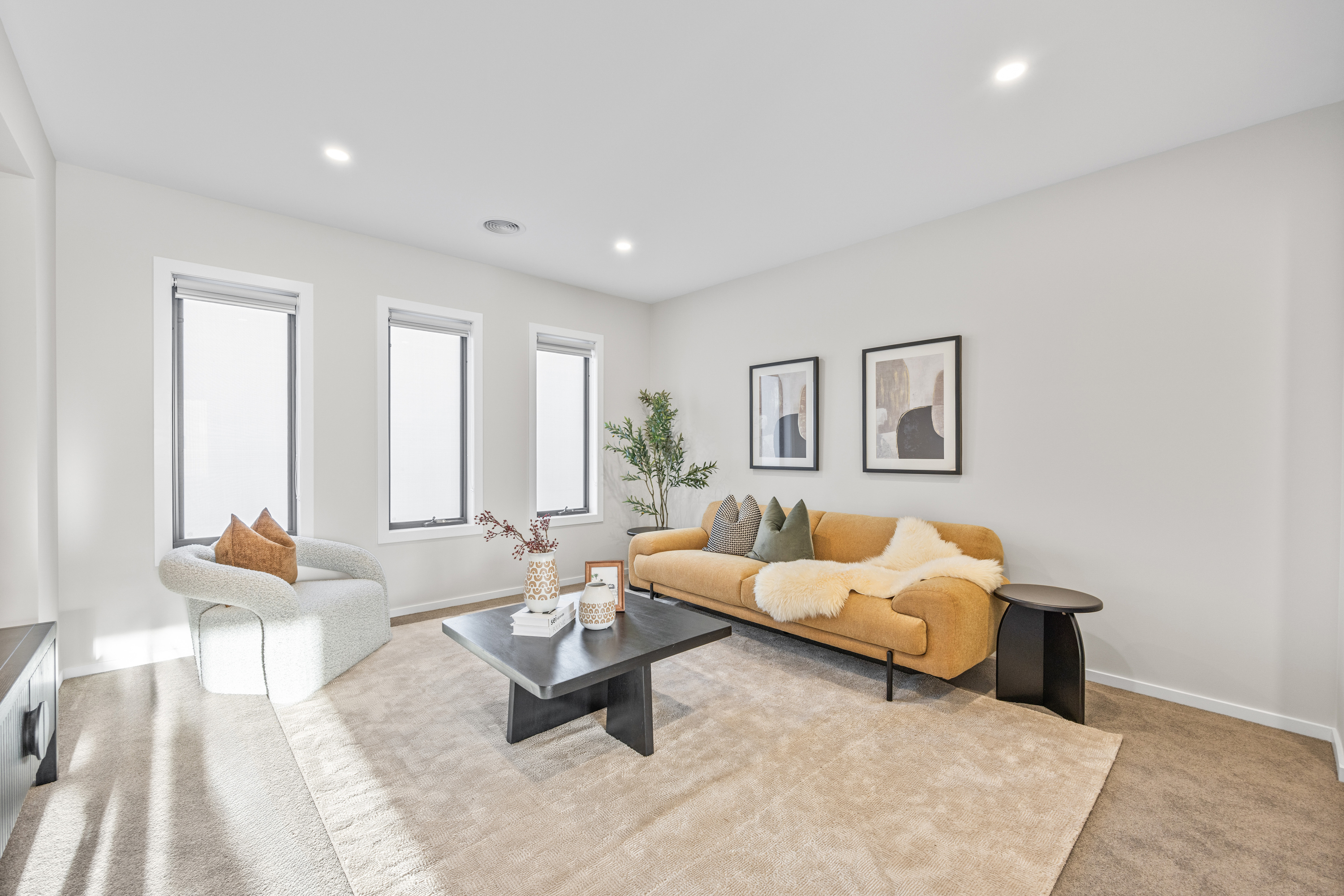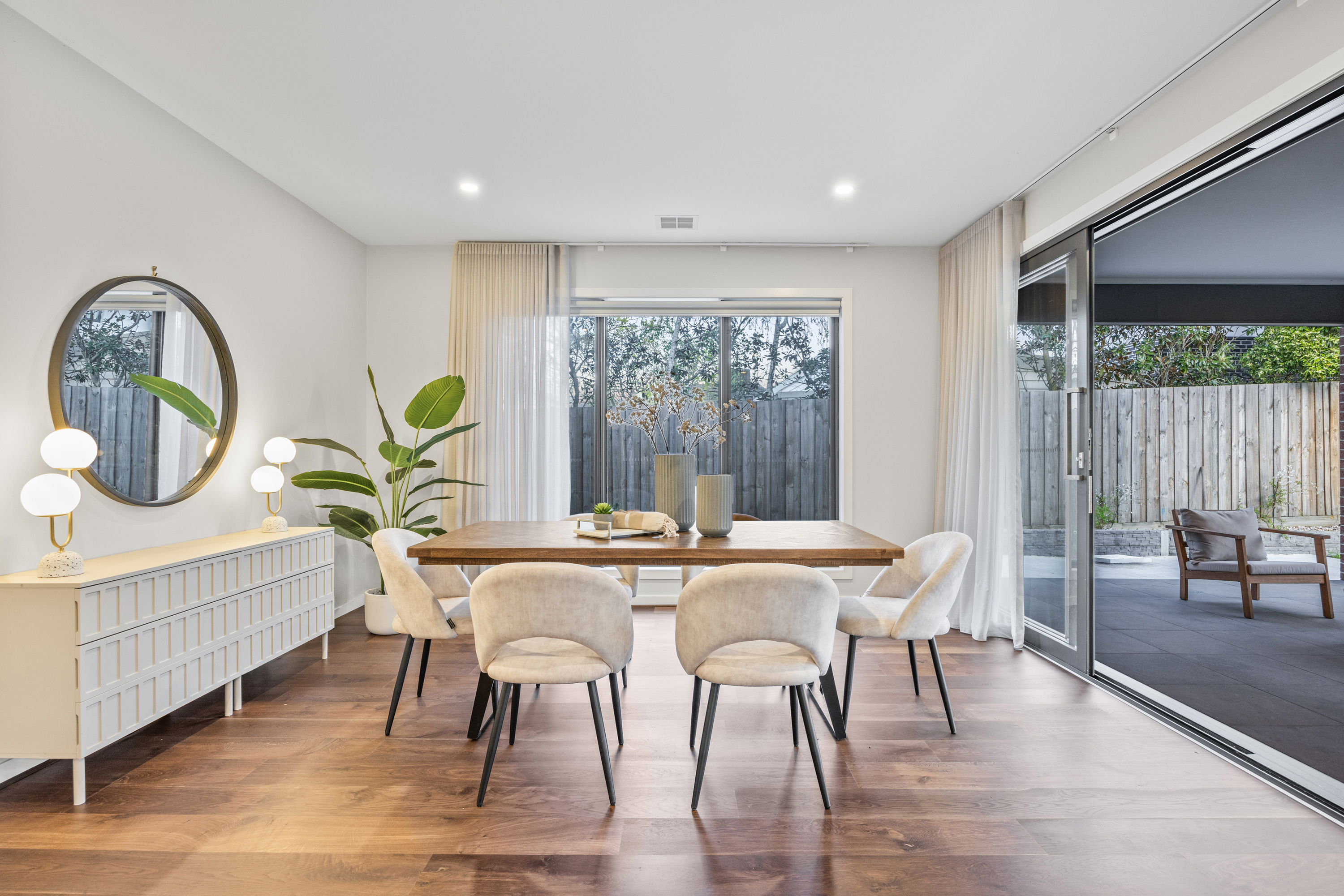 The open-plan living and dining areas feature floorboards, natural light, and seamless indoor-outdoor flow through double stacker doors leading to a covered alfresco. Sheer curtains and block-out blinds add versatility, while an additional upstairs retreat enhances living flexibility.