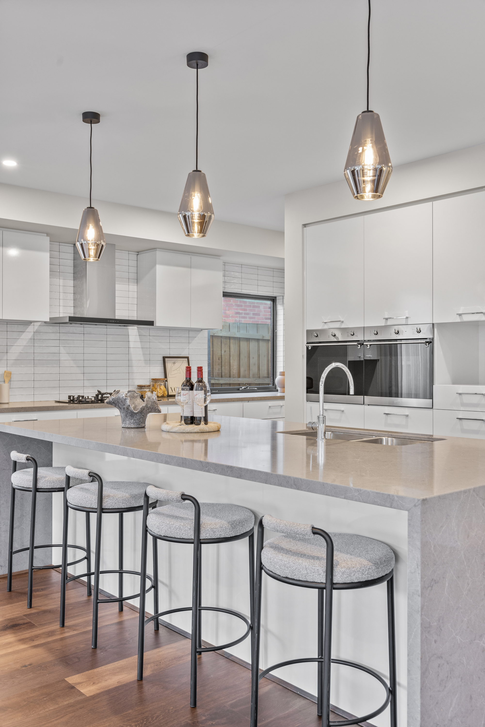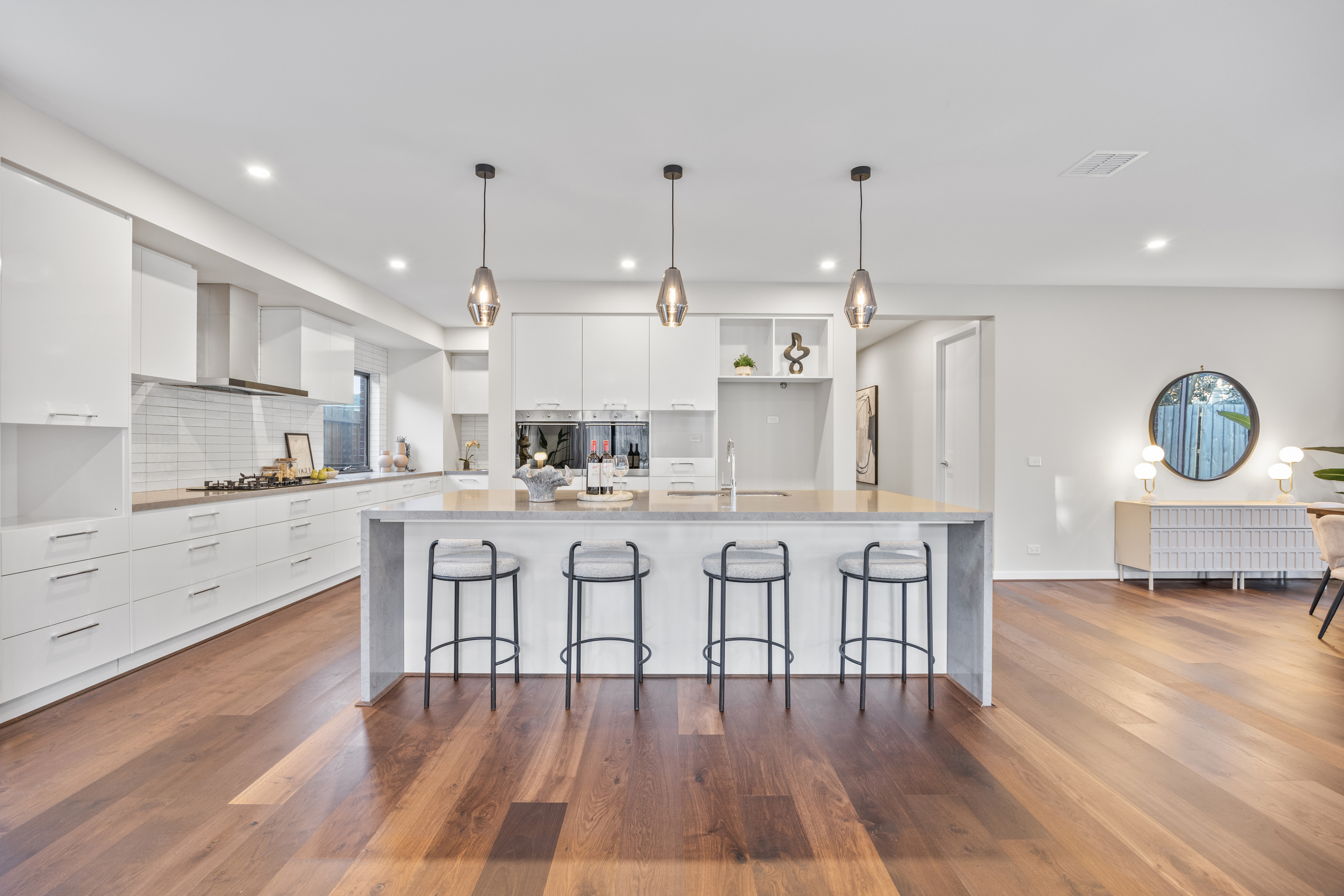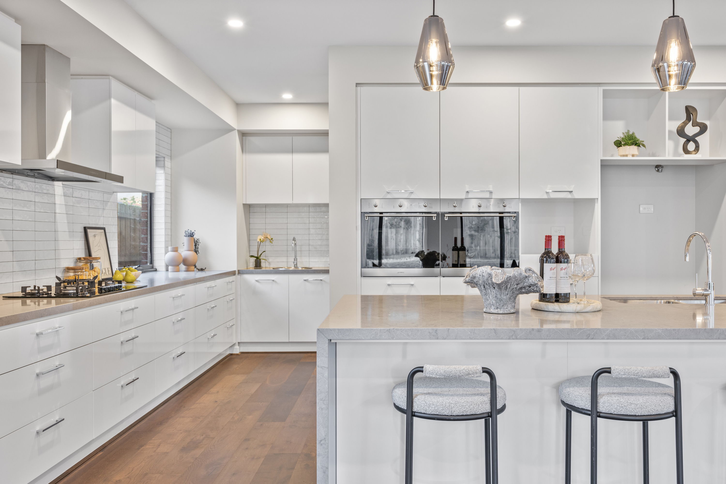 The kitchen is appointed with stone benchtops, a Technika gas stove, Smeg dishwasher, dual Smeg wall ovens, and an expansive island bench with waterfall ends. A generous butler’s pantry sits behind the kitchen, complete with a tiled splashback and additional sink.