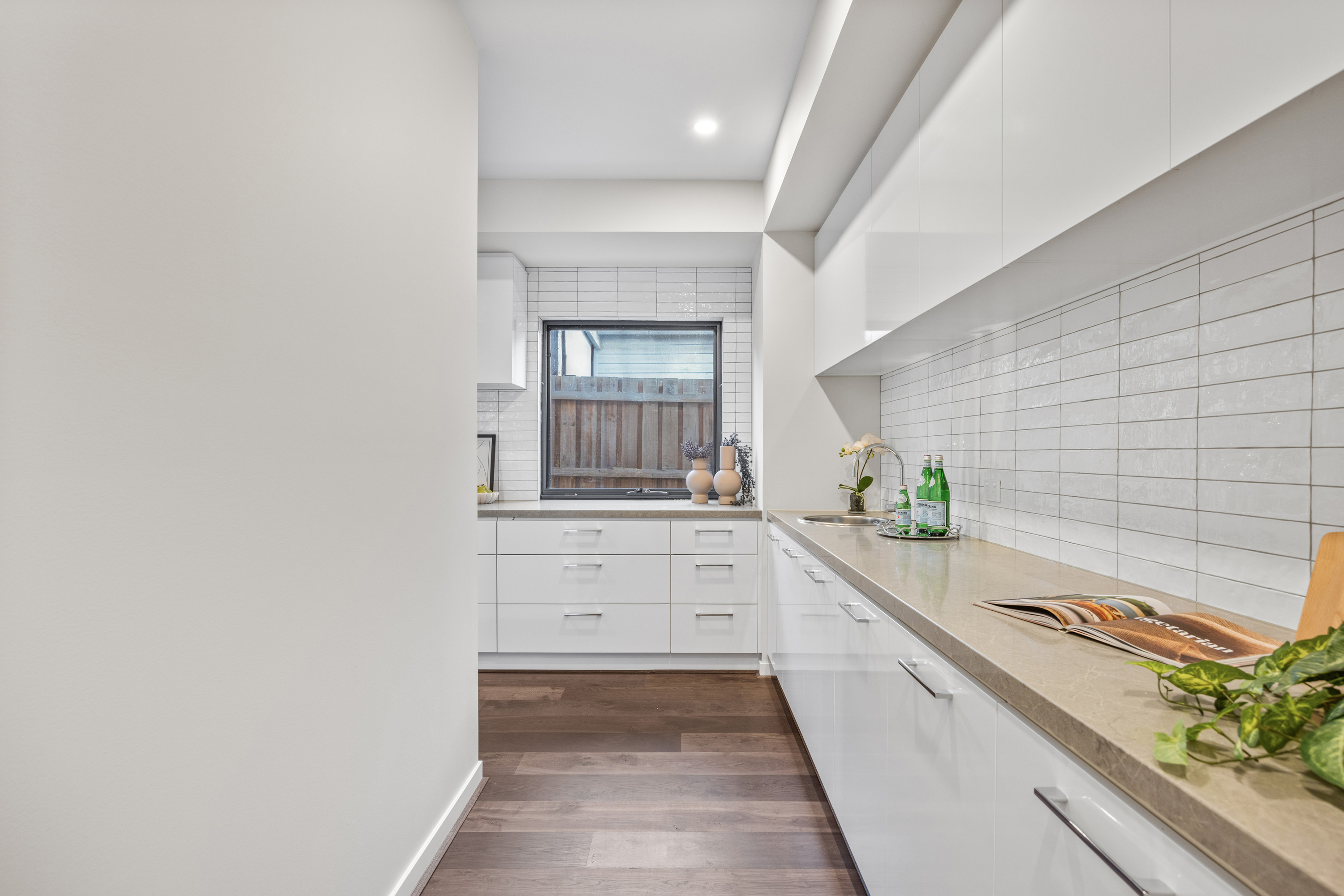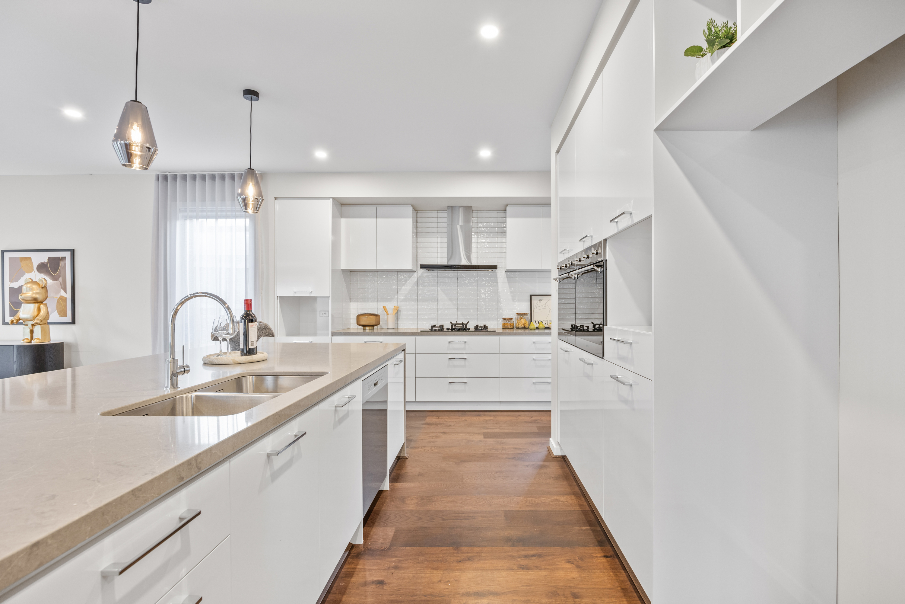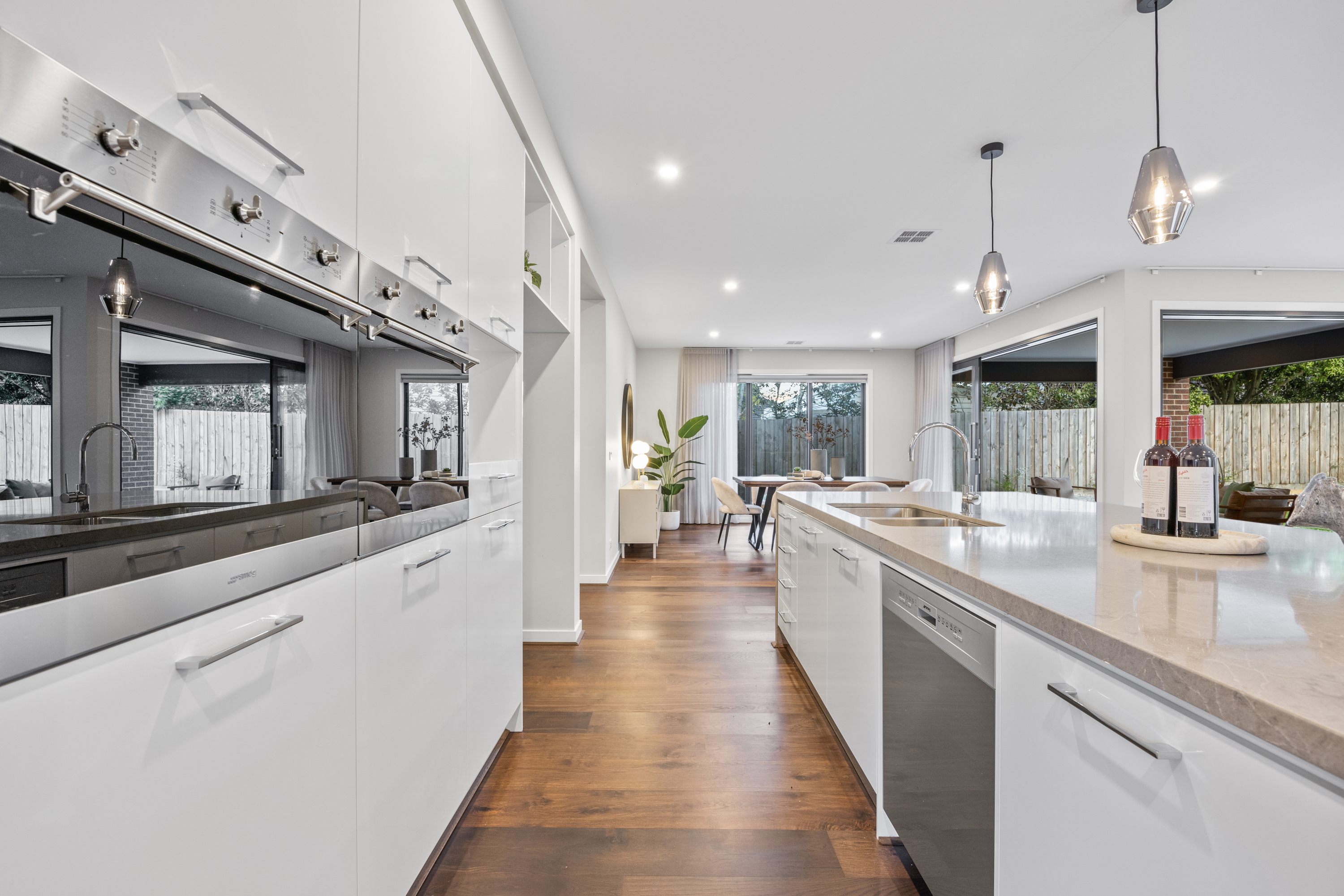 The kitchen is appointed with stone benchtops, a Technika gas stove, Smeg dishwasher, dual Smeg wall ovens, and an expansive island bench with waterfall ends. A generous butler’s pantry sits behind the kitchen, complete with a tiled splashback and additional sink.