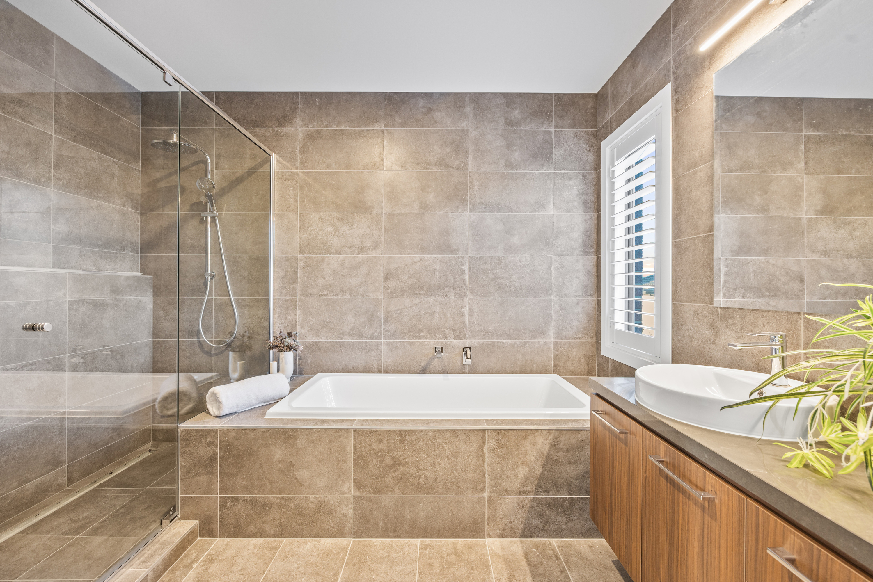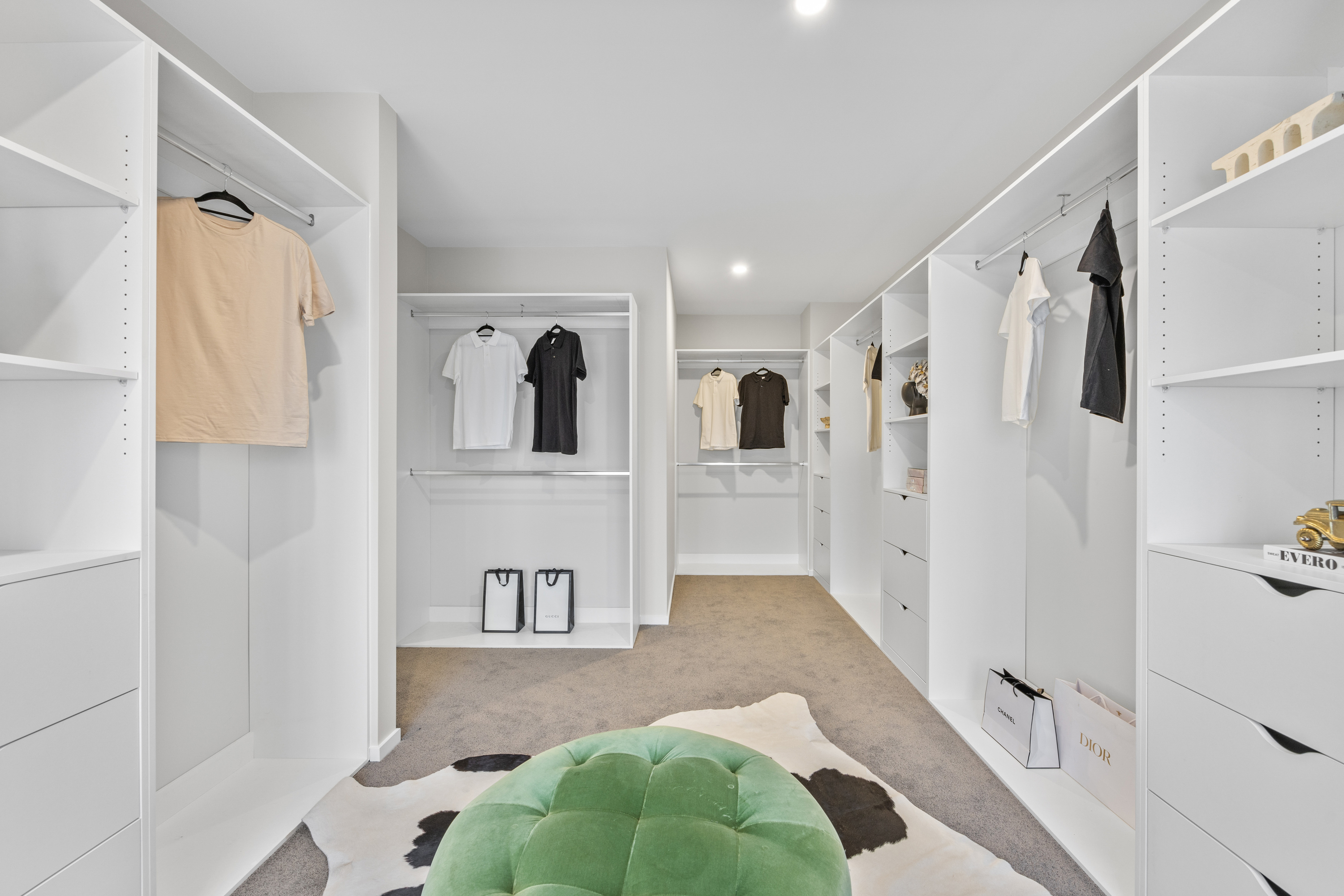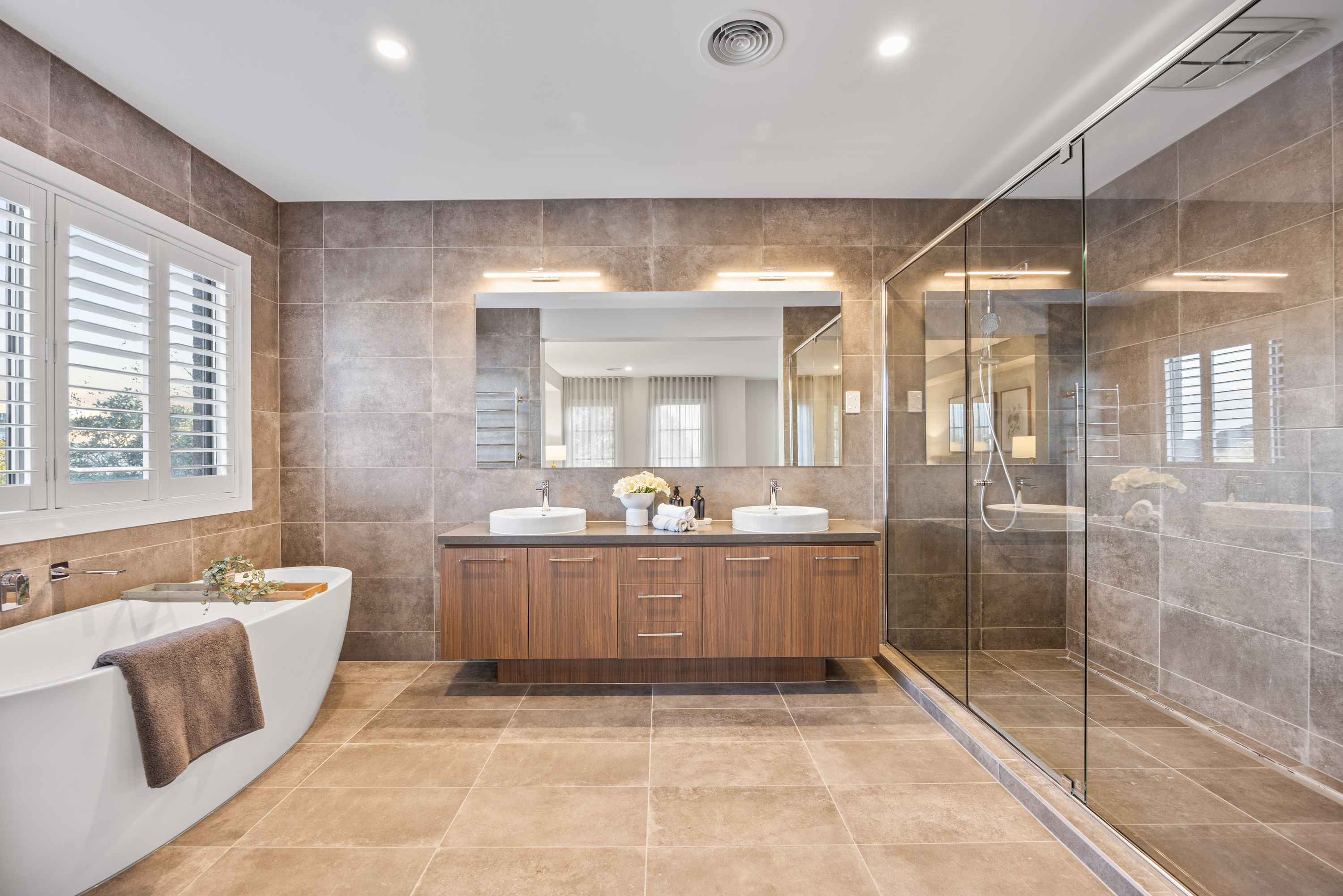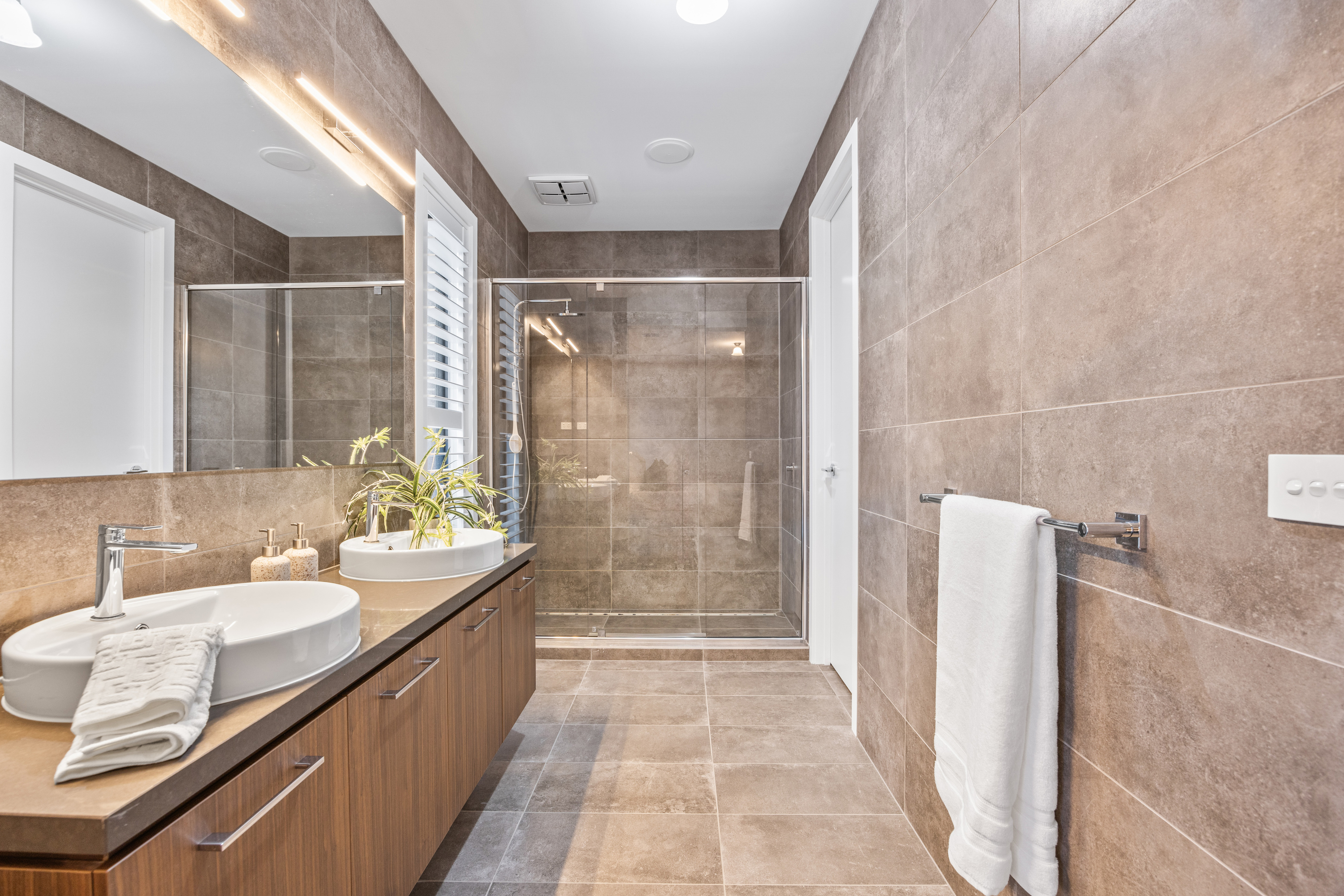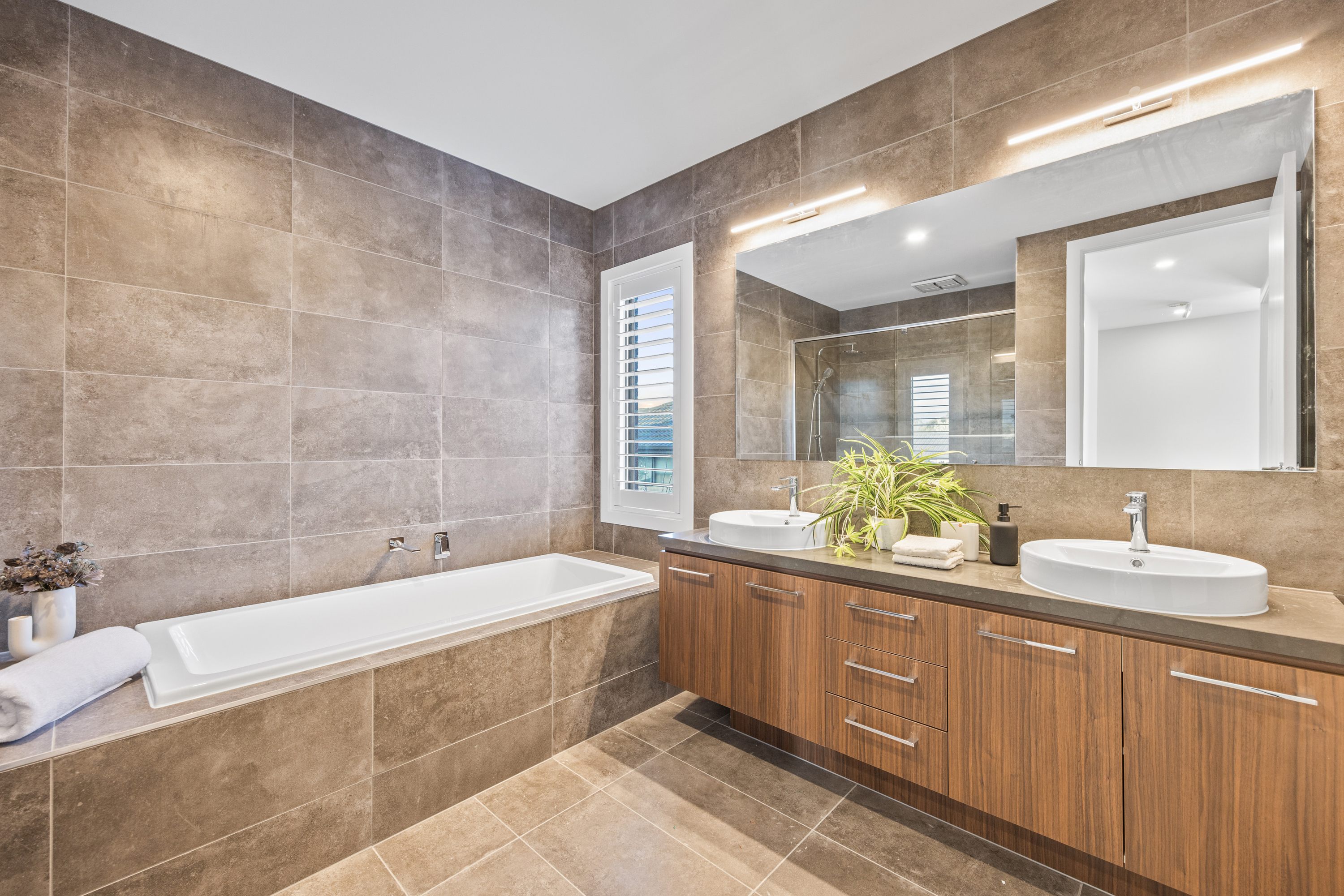 Five bedrooms are all fitted with walk-in robes and plush carpet. Two master suites, one on each level, feature ensuites, ideal for multigenerational living. The upstairs ensuite includes a bathtub, while the main bathroom also offers a bath. Each bathroom is finished with double vanities, floor-to-ceiling tiling, and a separate WC downstairs.