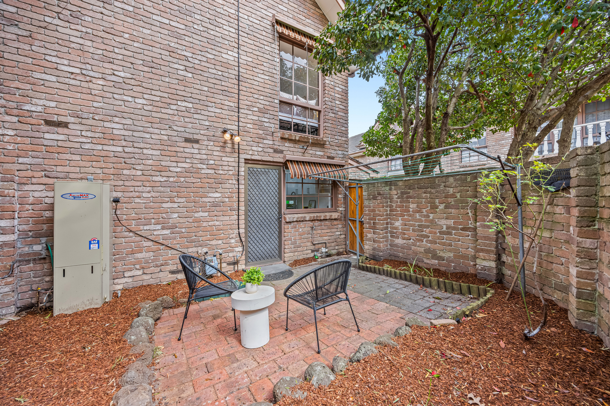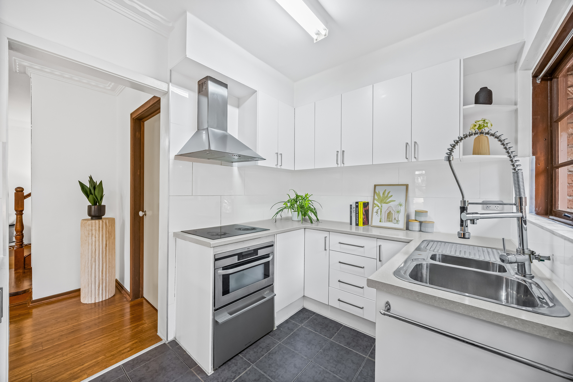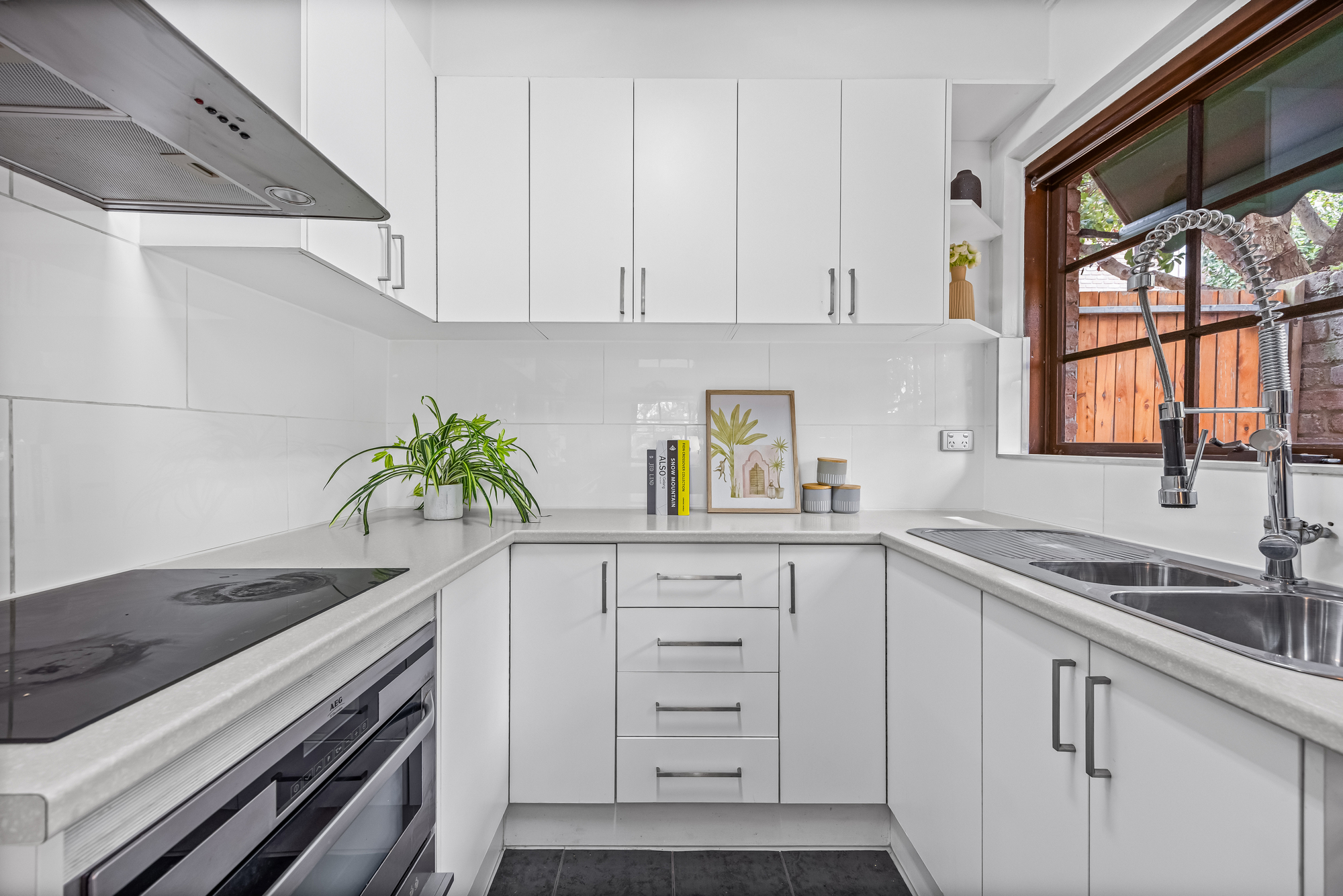 The kitchen is designed for practicality with laminate benchtops, overhead and undermount storage, a Fisher & Paykel single-drawer dishwasher, AEG electric oven and induction stove, plus direct access to a petite private paved courtyard where leafy green trees create a soothing canopy.
