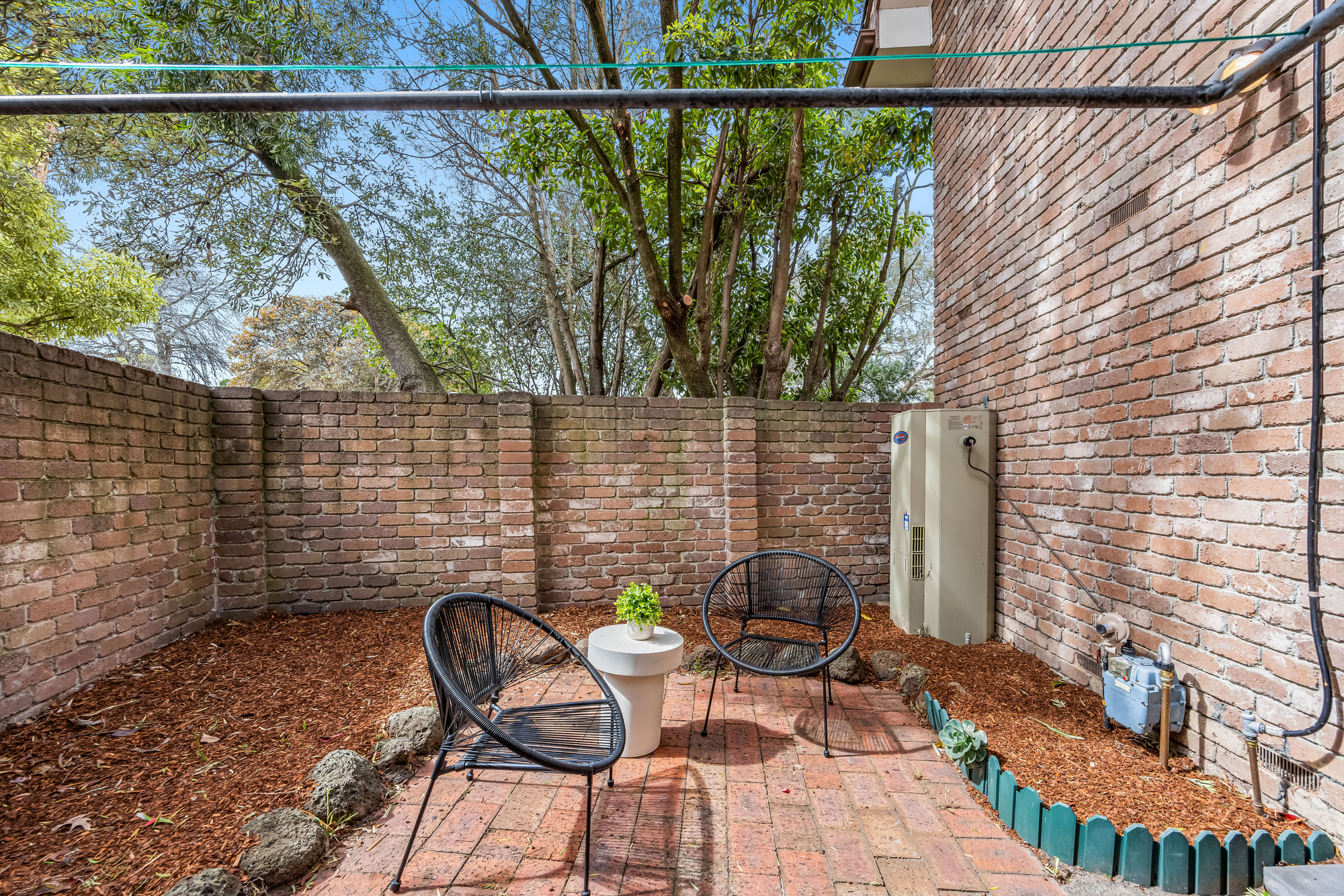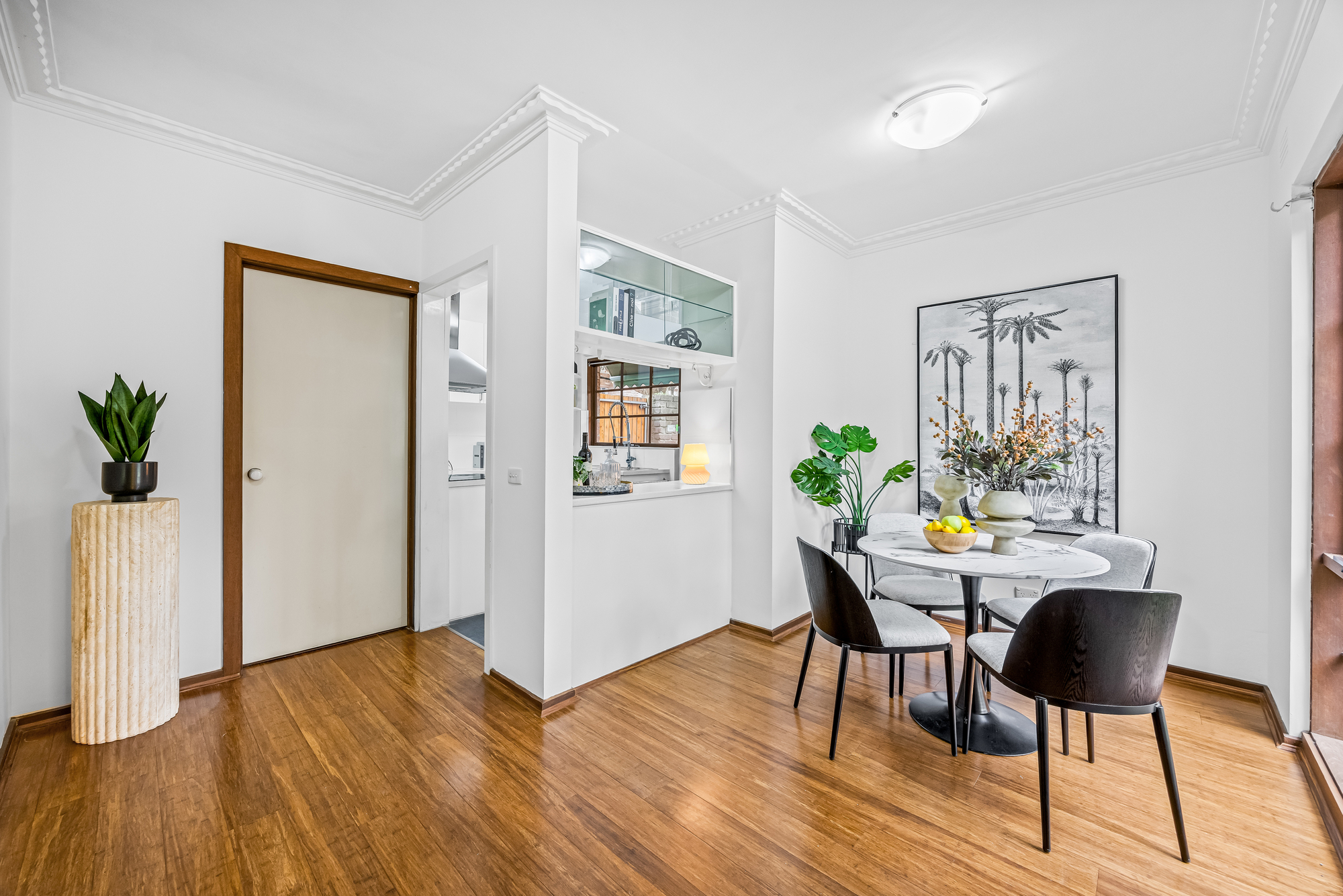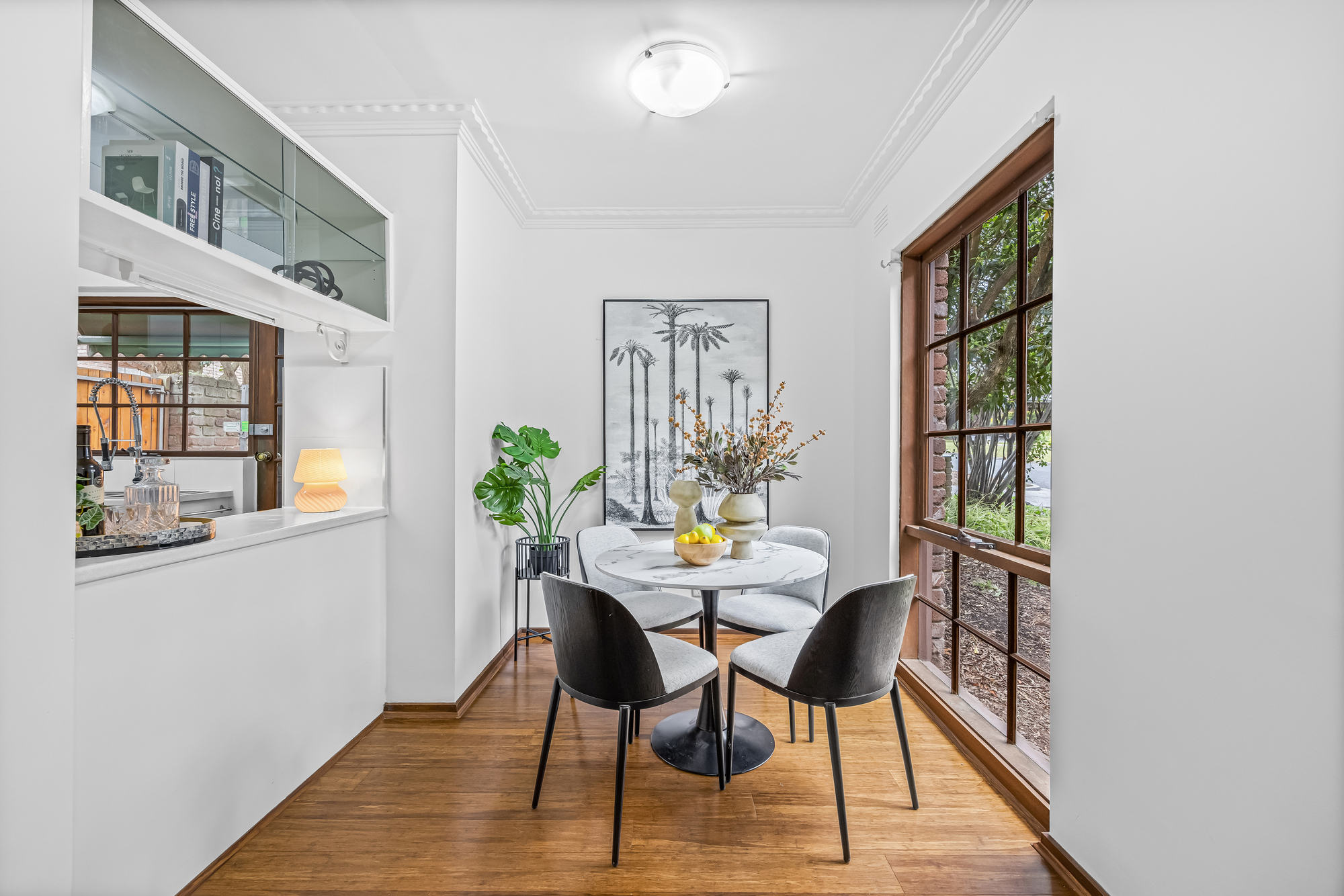 The kitchen is designed for practicality with laminate benchtops, overhead and undermount storage, a Fisher & Paykel single-drawer dishwasher, AEG electric oven and induction stove, plus direct access to a petite private paved courtyard where leafy green trees create a soothing canopy.