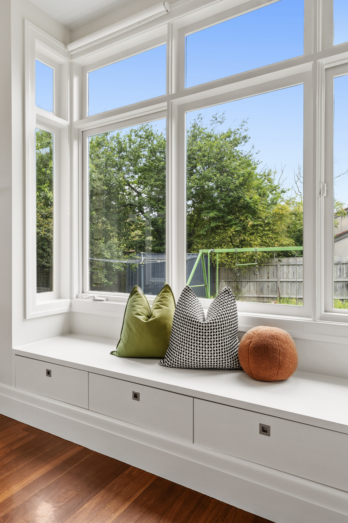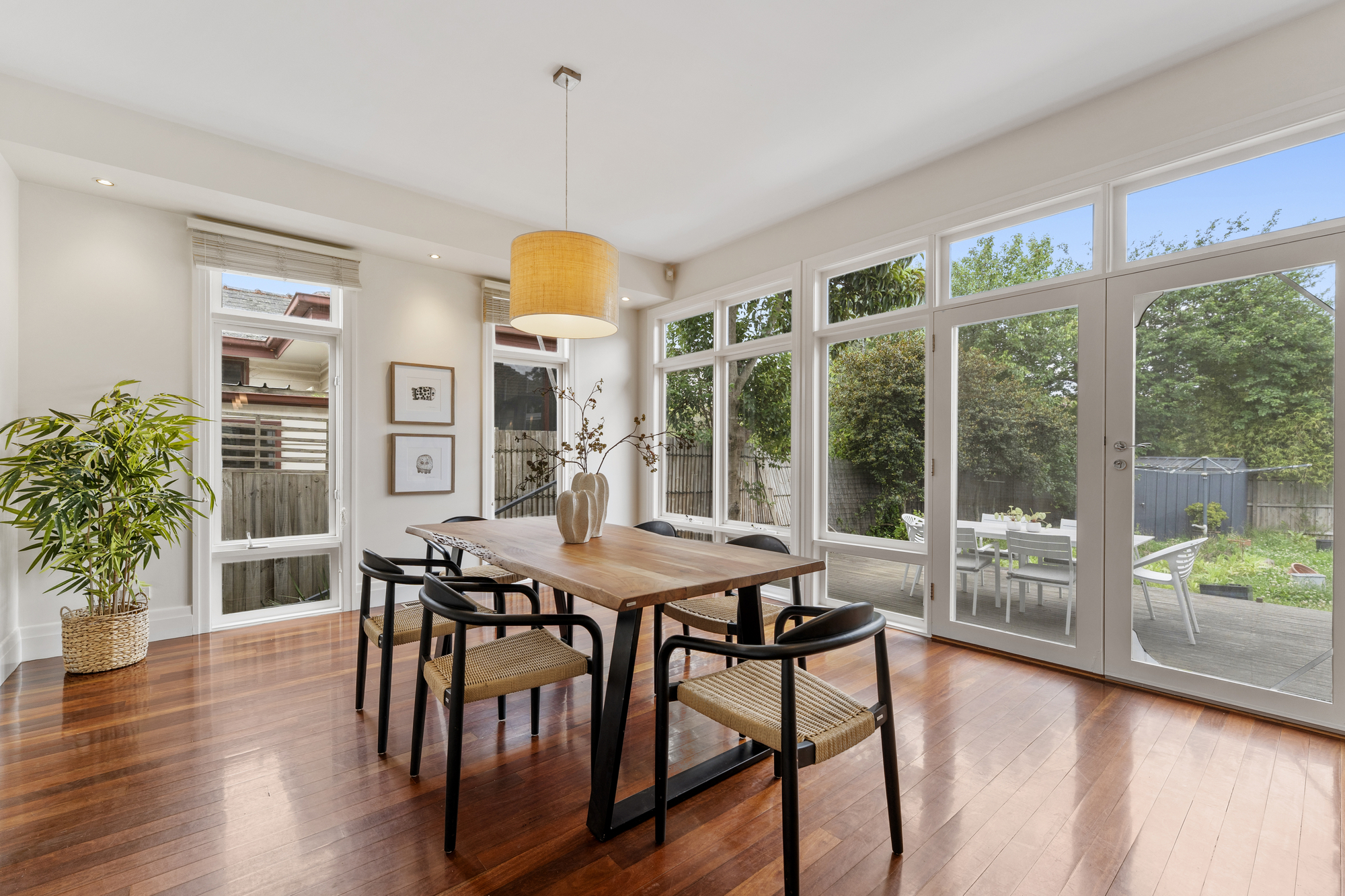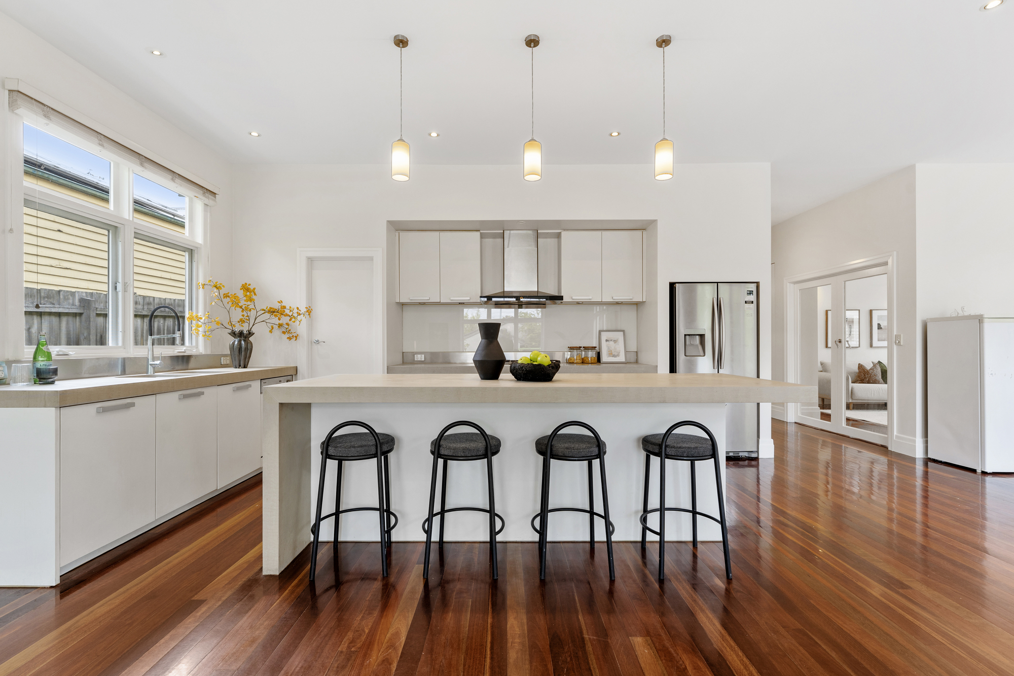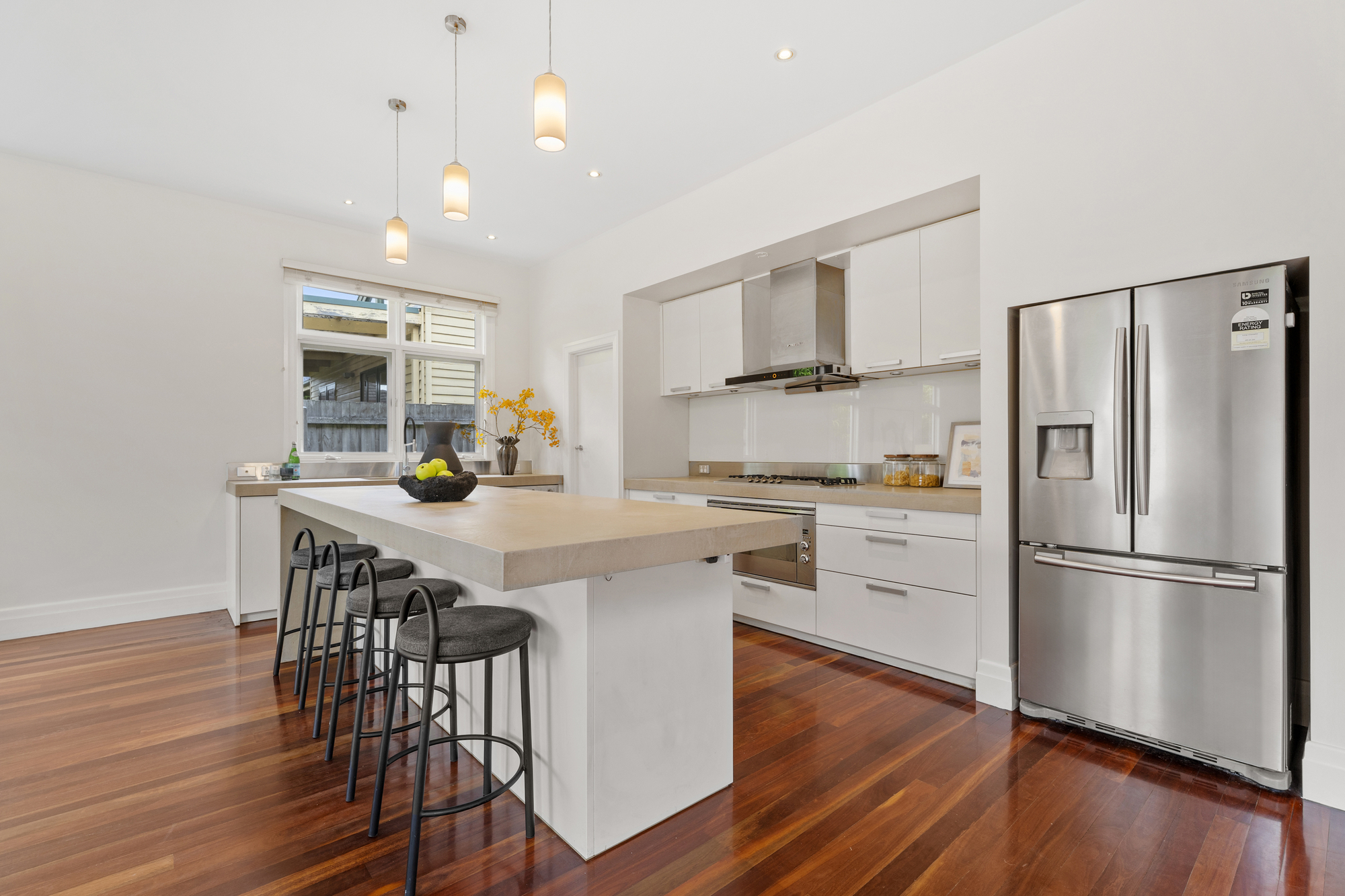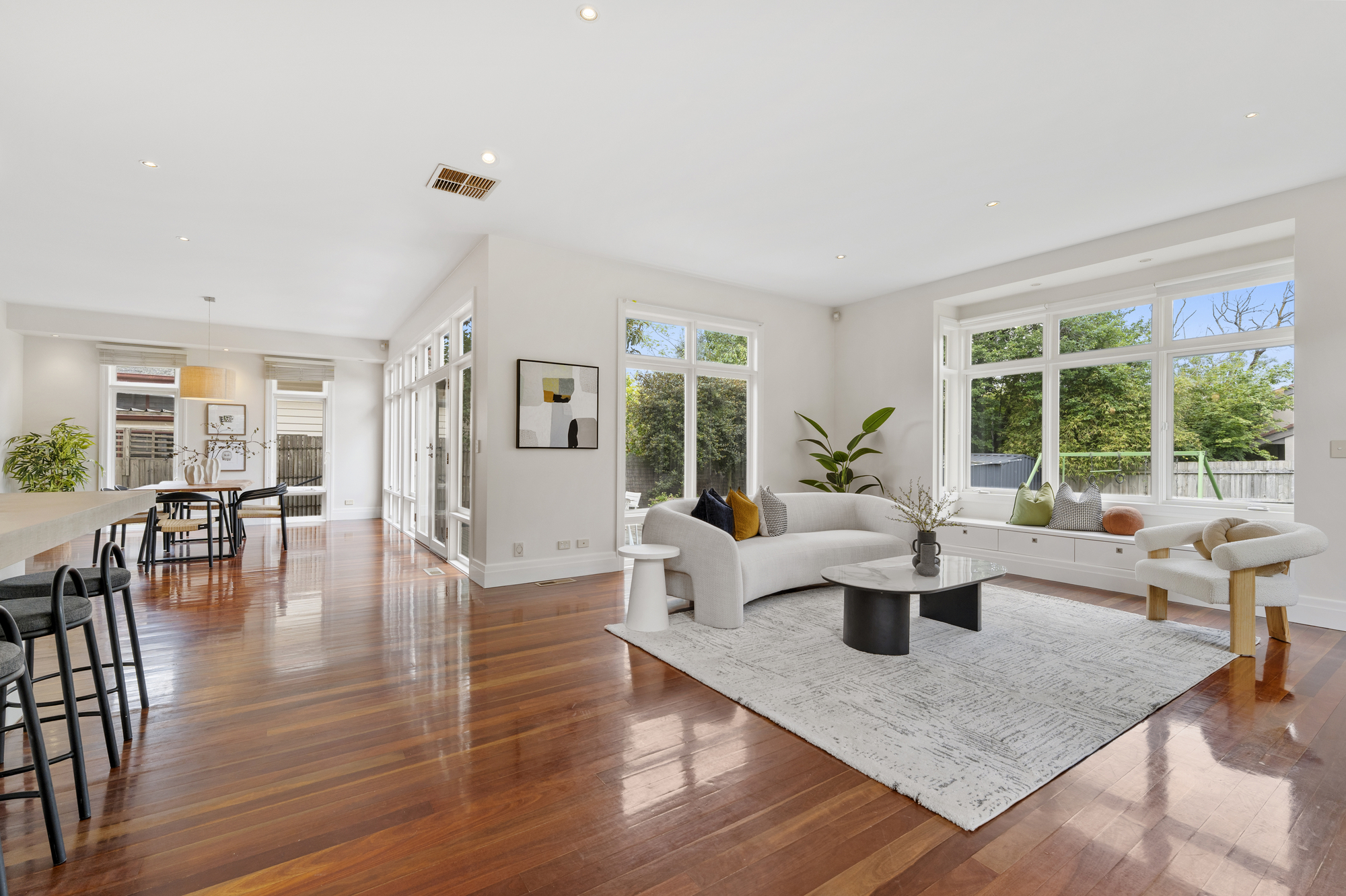 The spacious living and dining areas are highlighted by timber floors, large windows, and a bay window with a bench. The dining room opens onto a timber deck, perfect for outdoor entertaining. The kitchen is a chef’s dream, with an island stone countertop, Miele dishwasher, a five-burner gas stove, space for a double-door fridge, and a walk-in pantry.