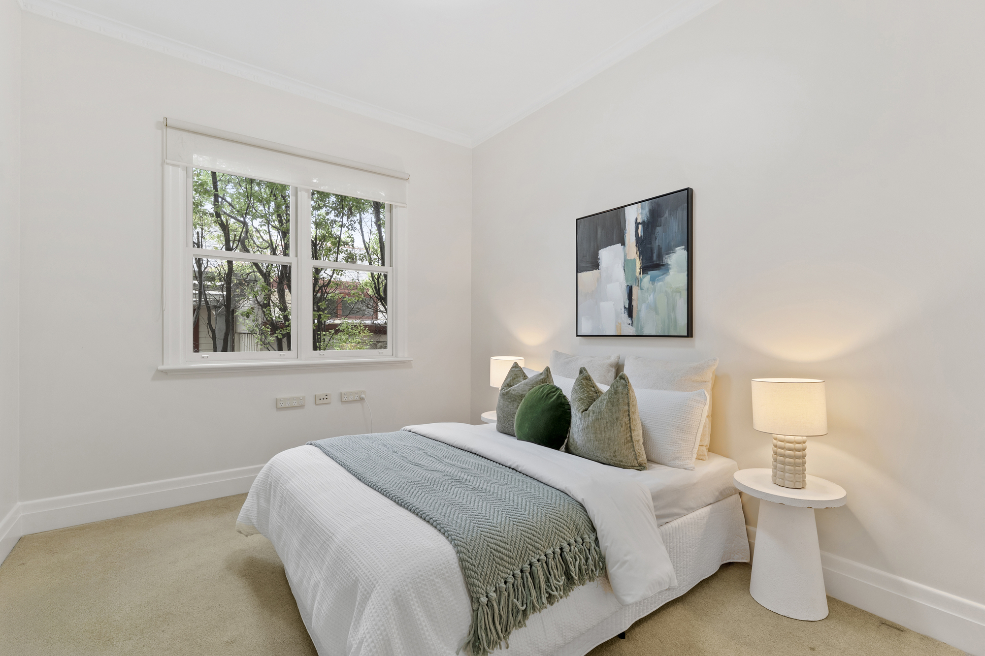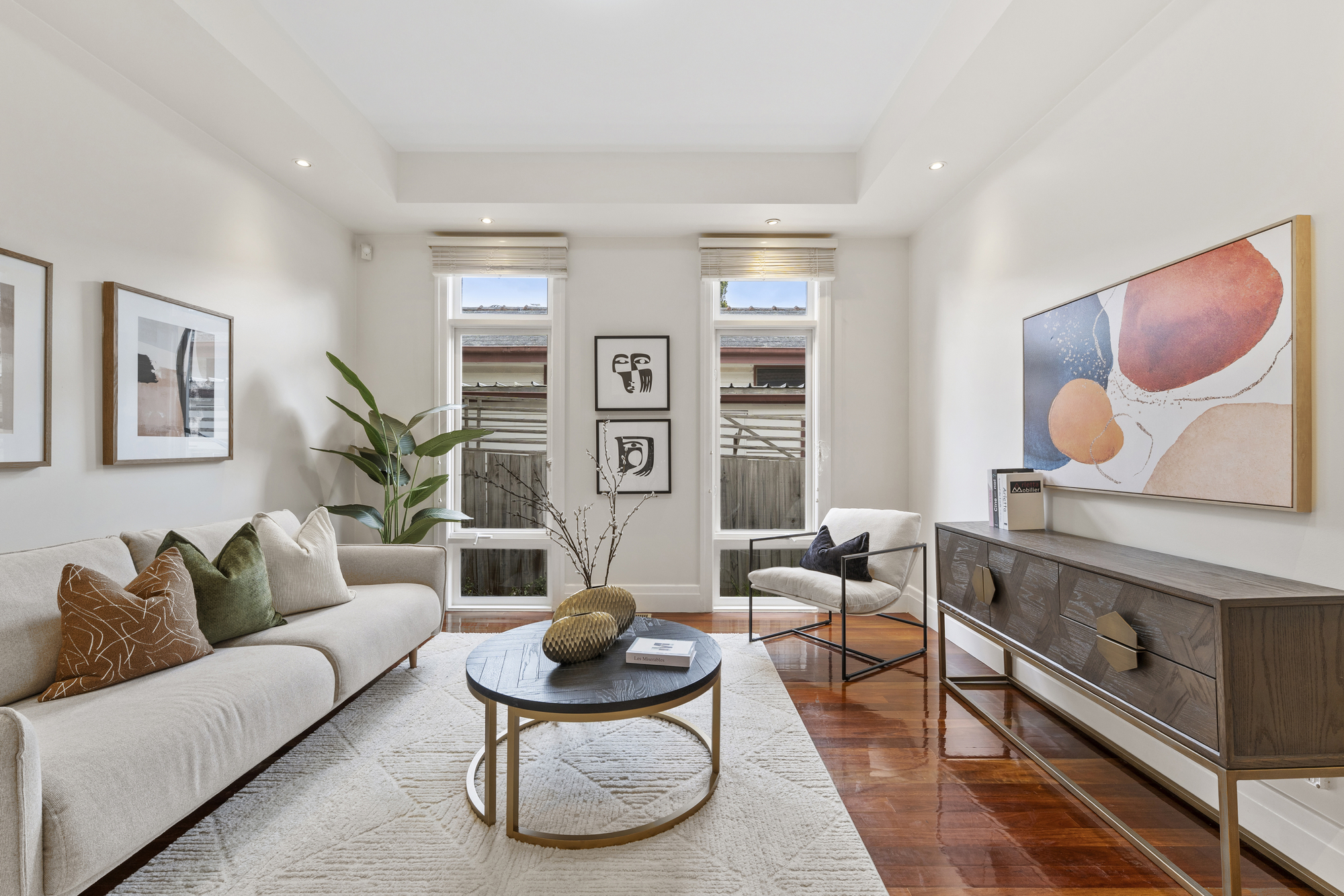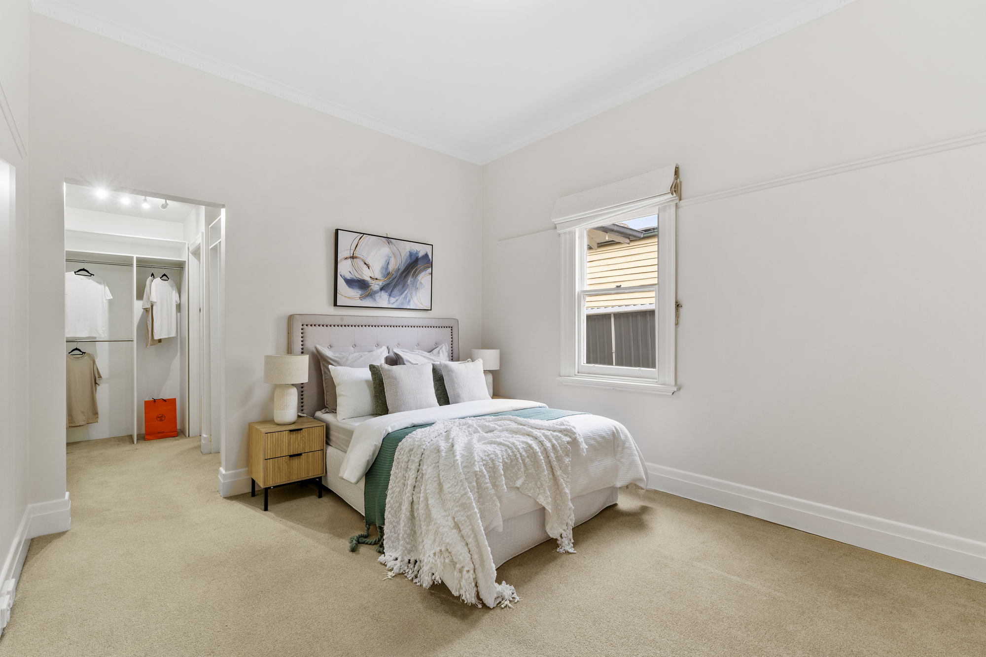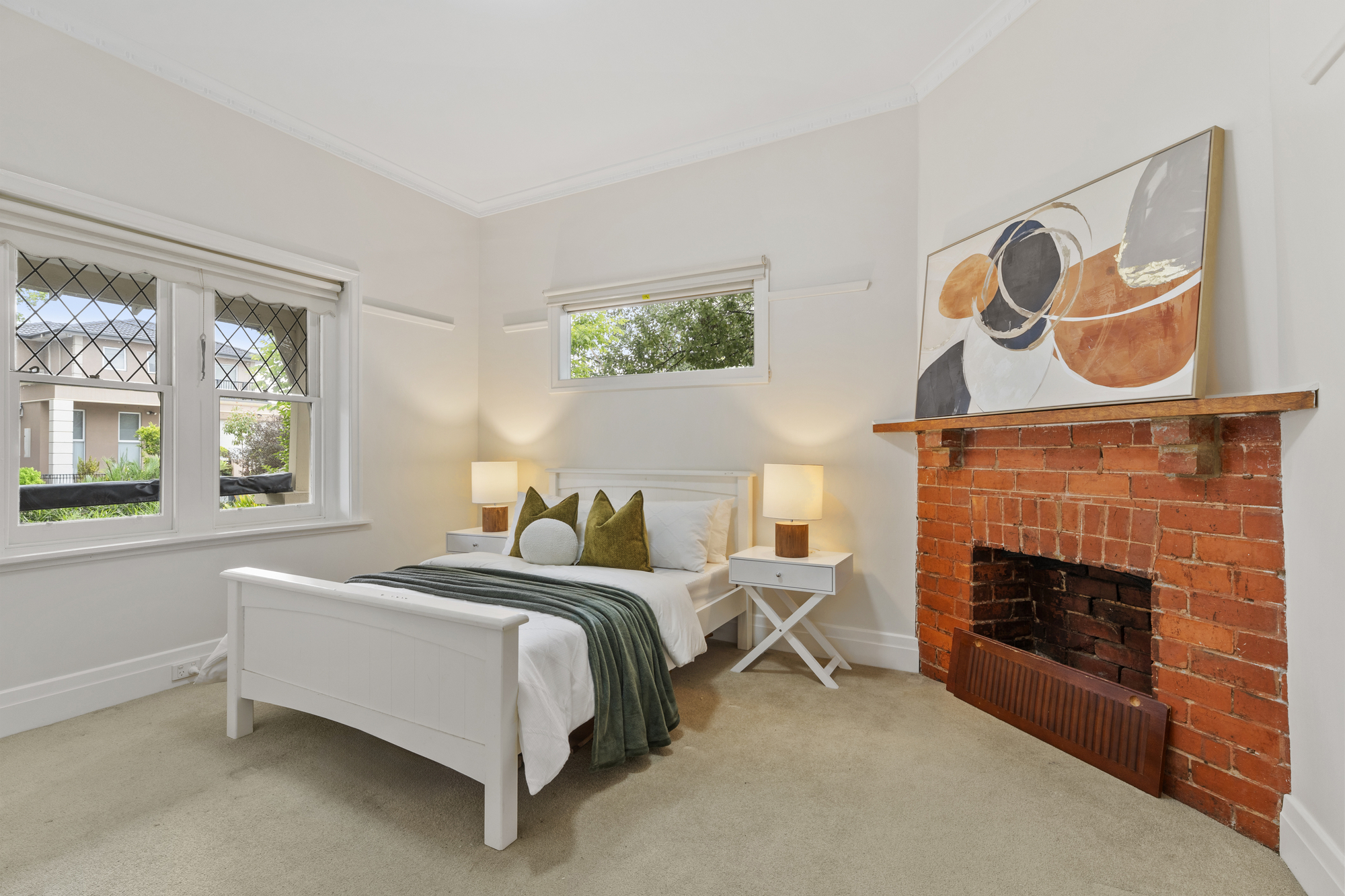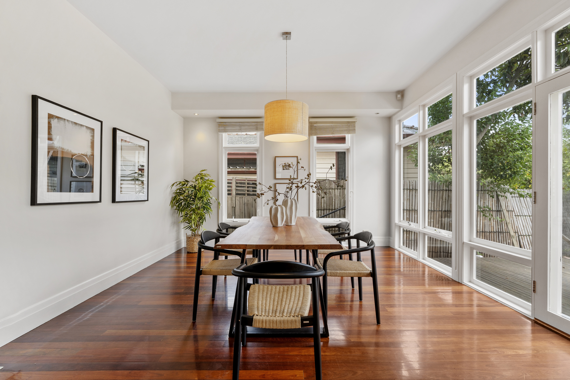 The spacious living and dining areas are highlighted by timber floors, large windows, and a bay window with a bench. The dining room opens onto a timber deck, perfect for outdoor entertaining. The kitchen is a chef’s dream, with an island stone countertop, Miele dishwasher, a five-burner gas stove, space for a double-door fridge, and a walk-in pantry.