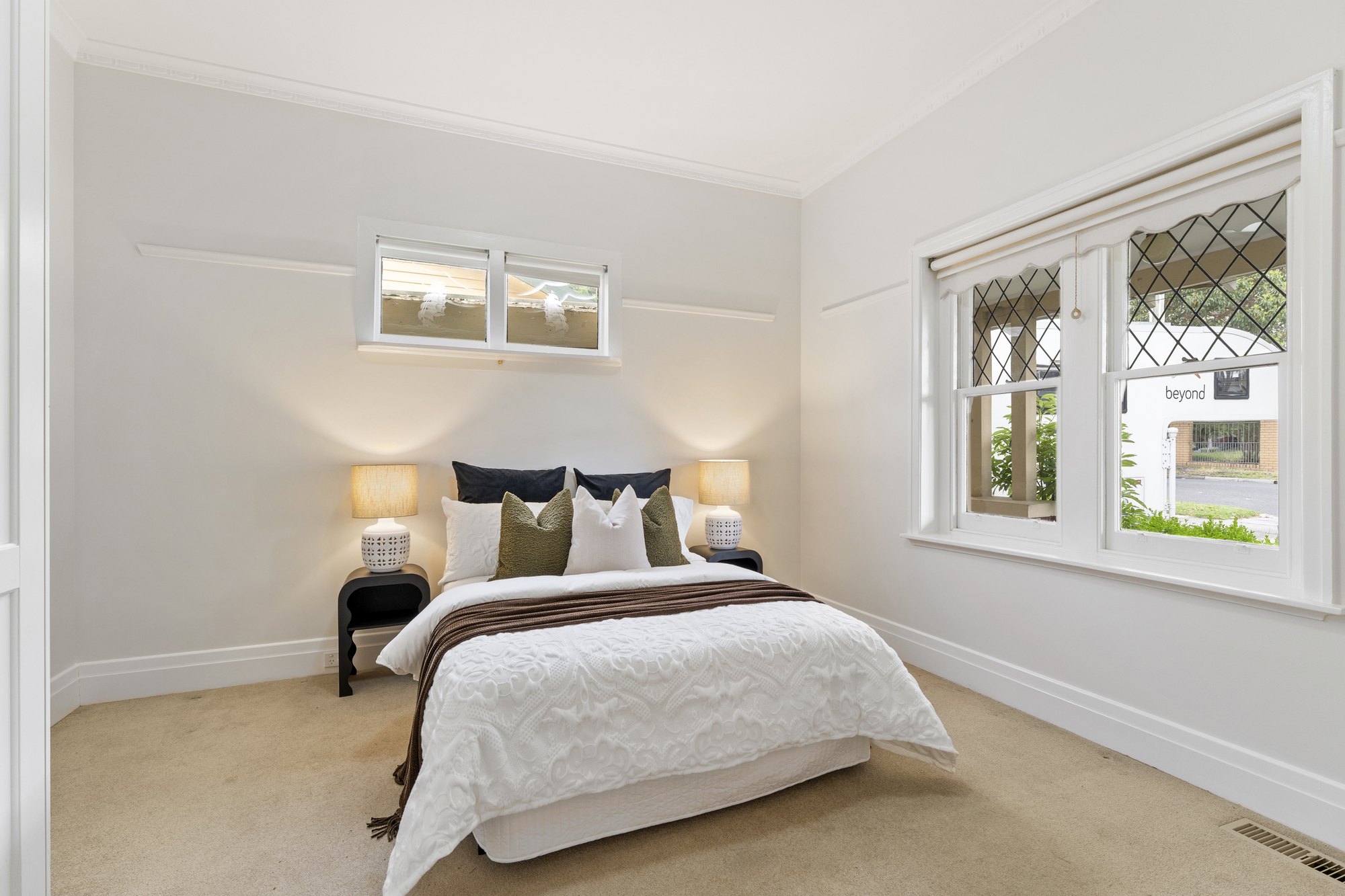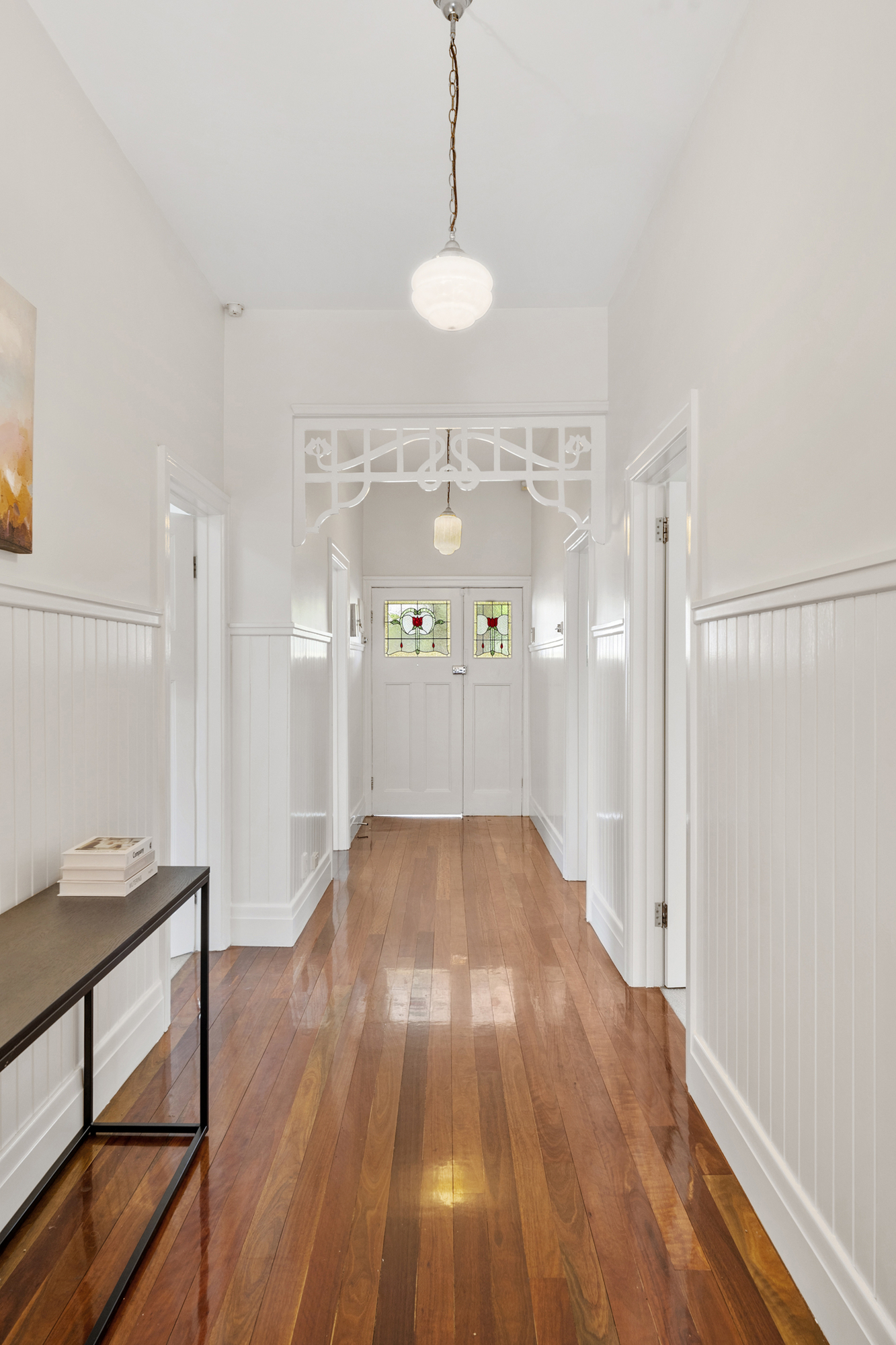 The property also includes a secondary lounge with French doors, providing a versatile space for relaxation or entertainment. High ceilings throughout the home enhance the sense of space and light, while the stained-glass front door adds a unique touch.