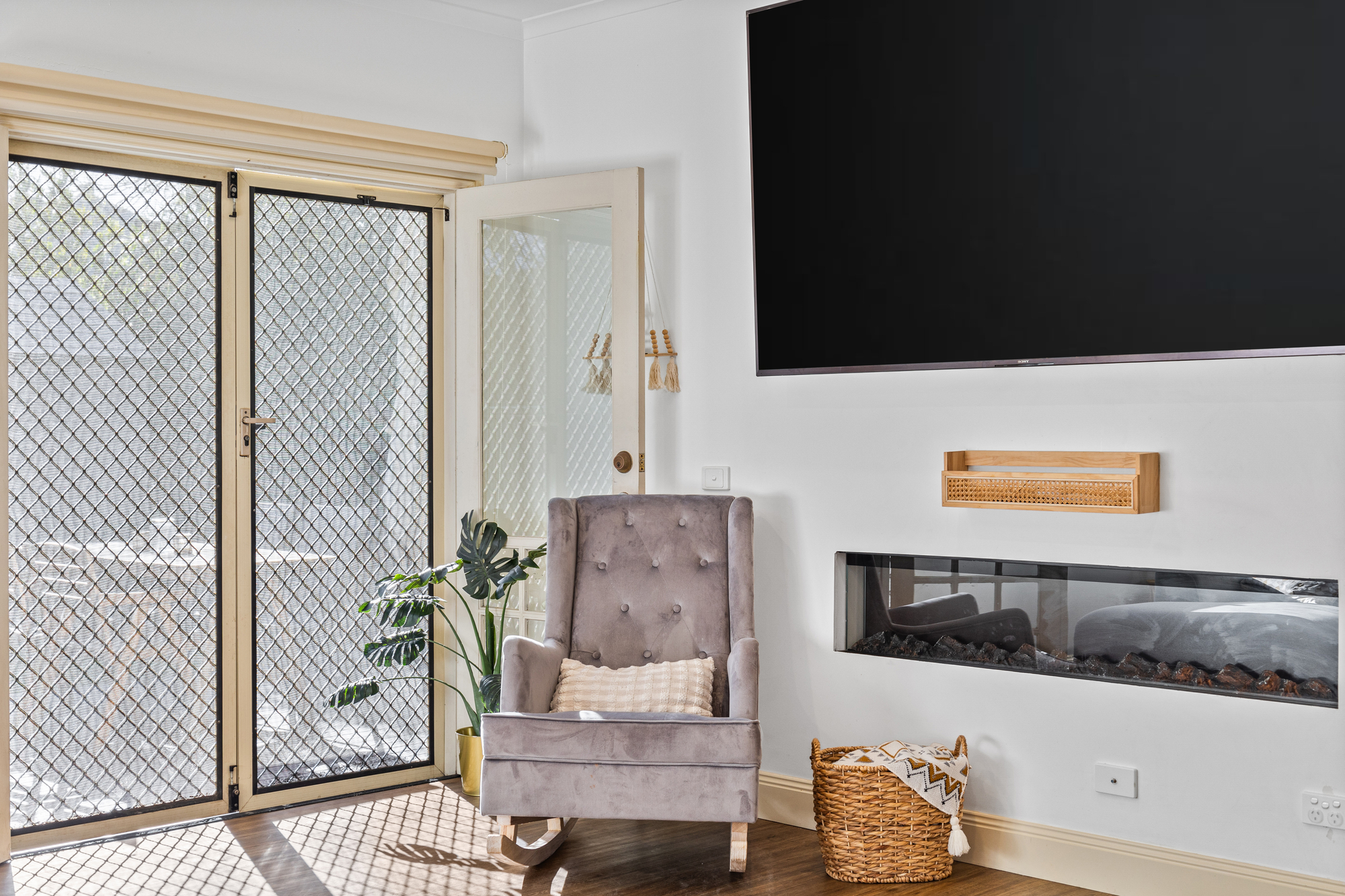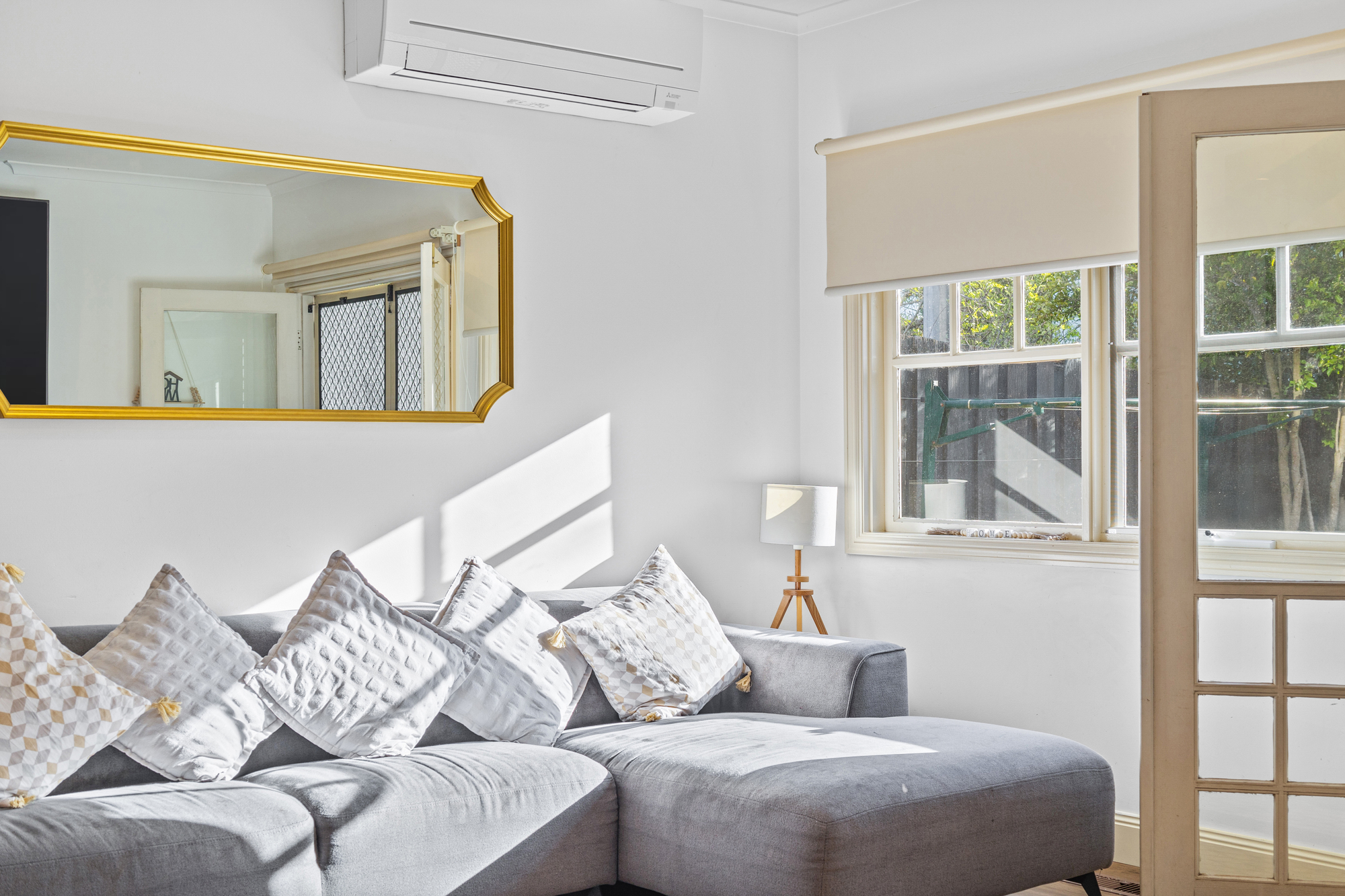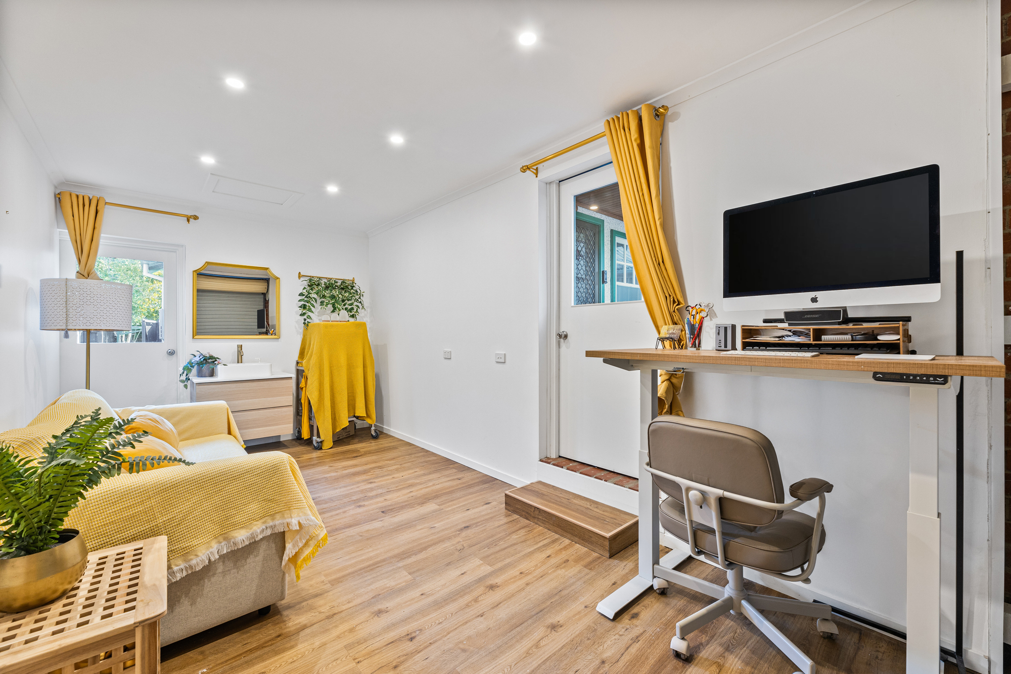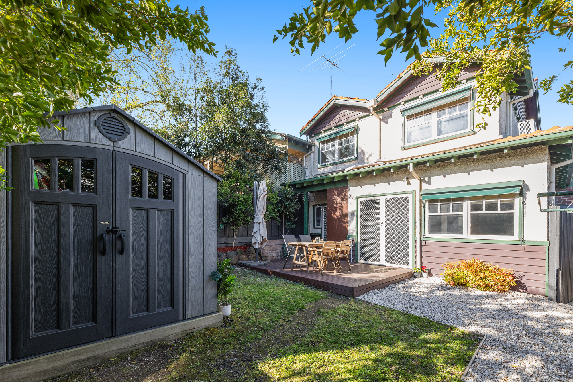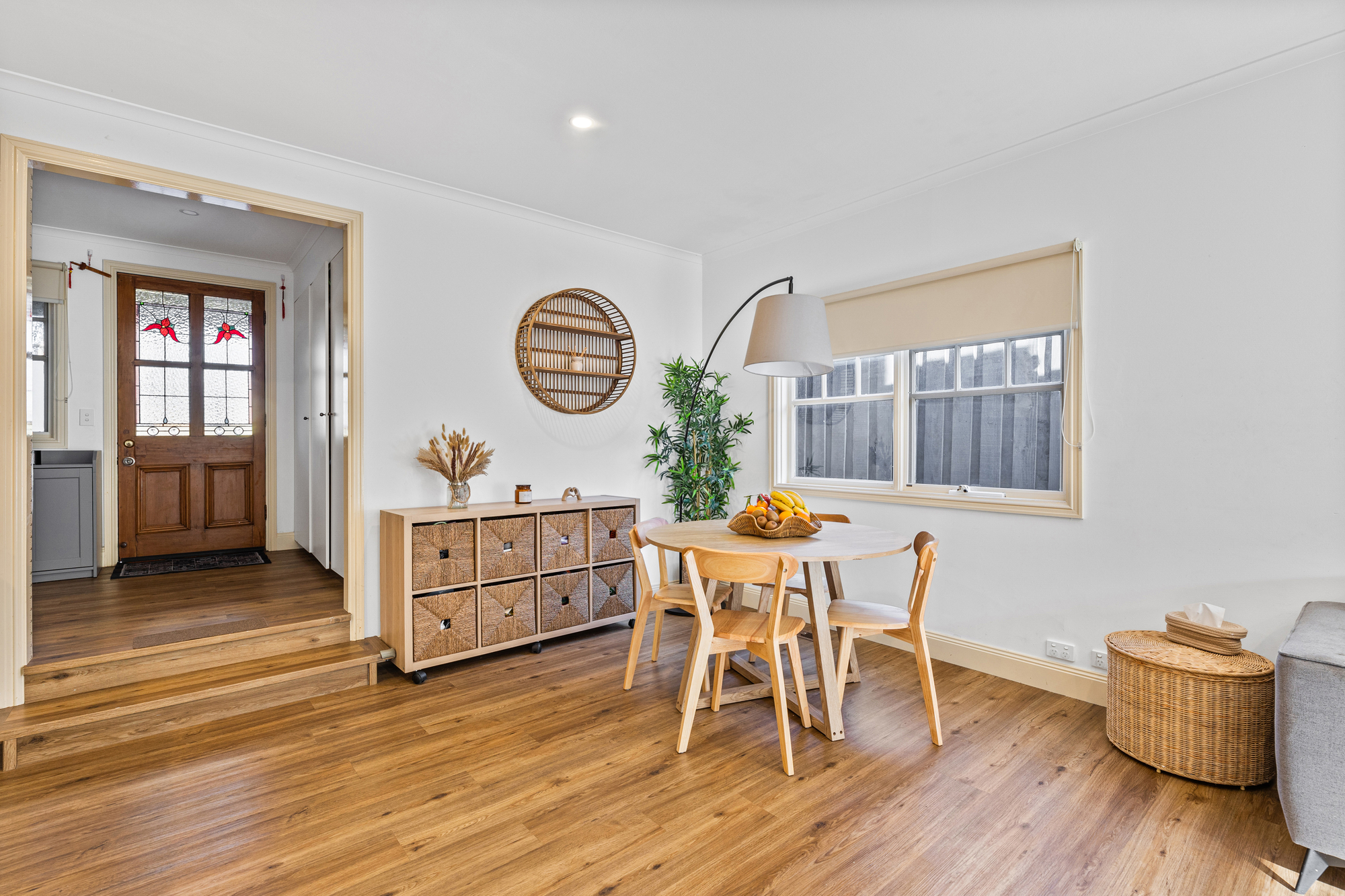 Outdoors, a low-maintenance backyard with a shed creates a private retreat, complemented by an alfresco area perfect for enjoying the garden. A low-maintenance front yard completes the picture. Additional features include split system heating and cooling in the main living area and stained glass detail at the front door for a touch of charm.