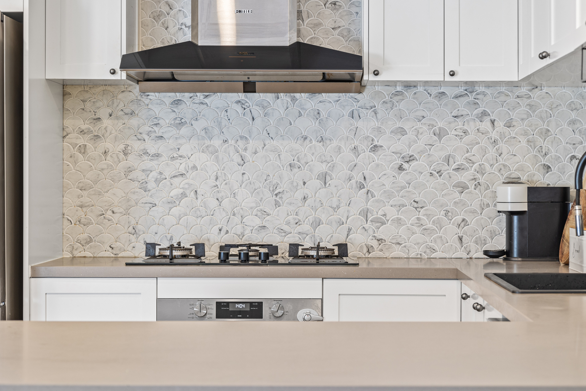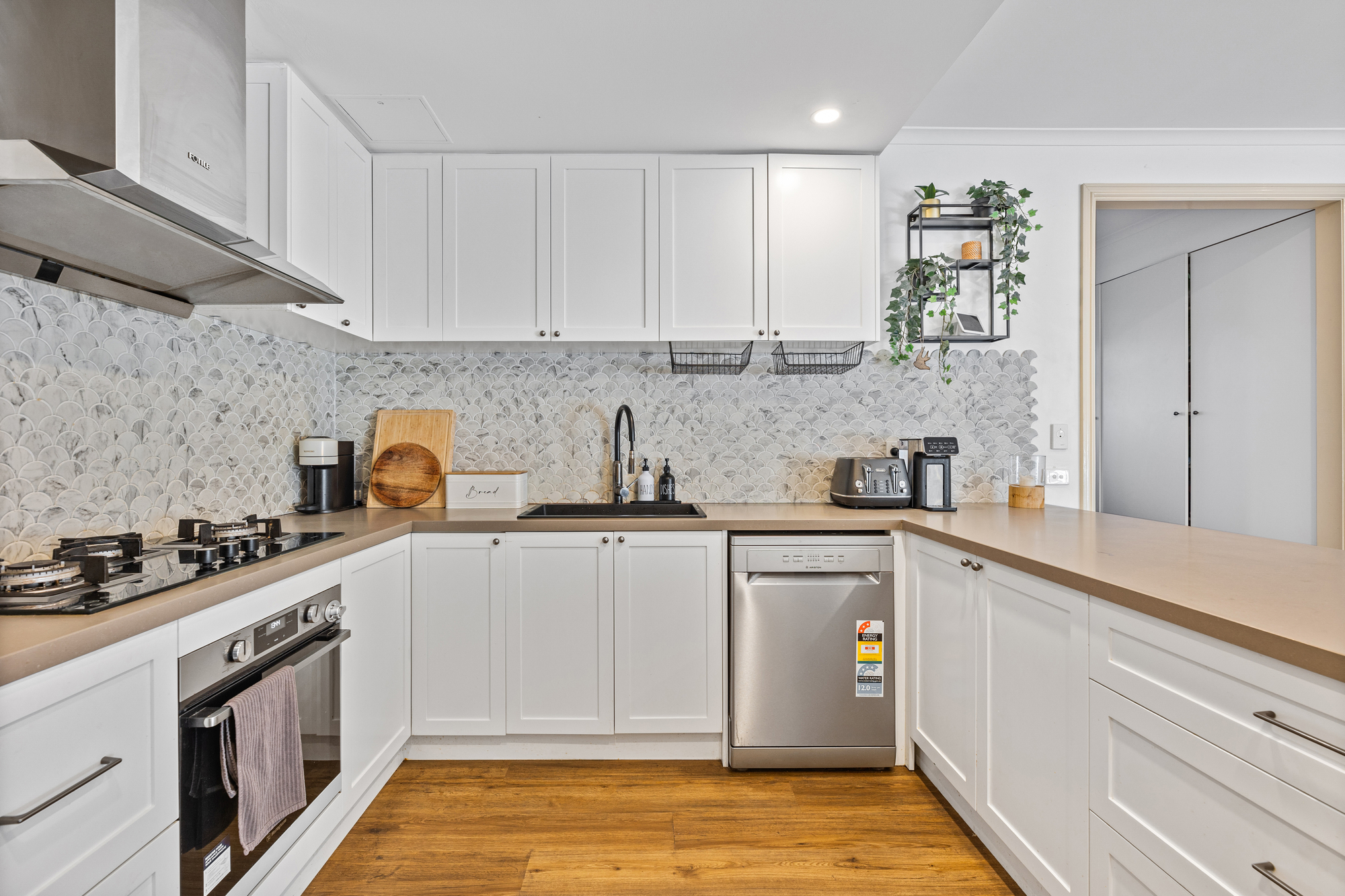 The ground floor features an expansive open-plan living, dining, and kitchen zone, highlighted by a skylight that floods the interiors with natural light. The kitchen is appointed with stone benchtops, Ariston dishwasher, Westinghouse oven, Fotile gas stove, and a double under-mount sink. A large island bench comfortably seats four, while a walk-in pantry provides excellent storage. A powder room and additional storage solutions further enhance everyday ease.