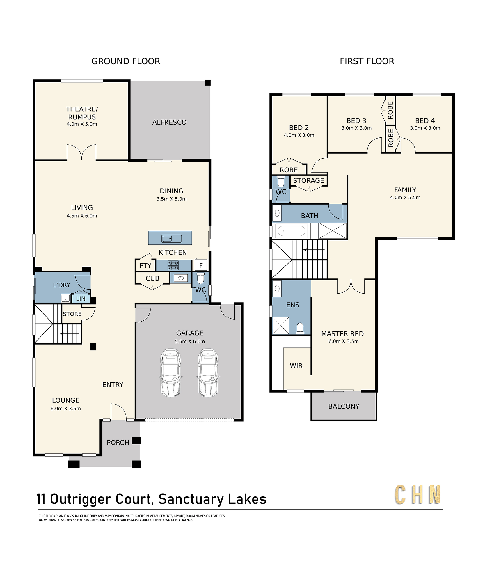 Downstairs is designed for both entertaining and everyday living, offering multiple living zones including a front formal lounge and an enclosed theatre room with double doors — perfect for movie nights, a home office or quiet retreat. The central kitchen, complete with island bench, connects seamlessly to the dining and main living area, flowing through to a low-maintenance backyard with concrete alfresco.