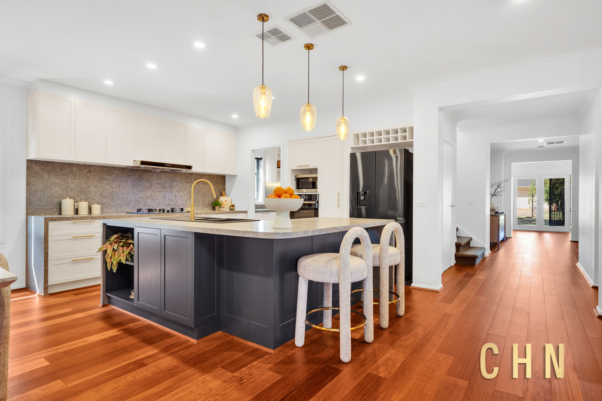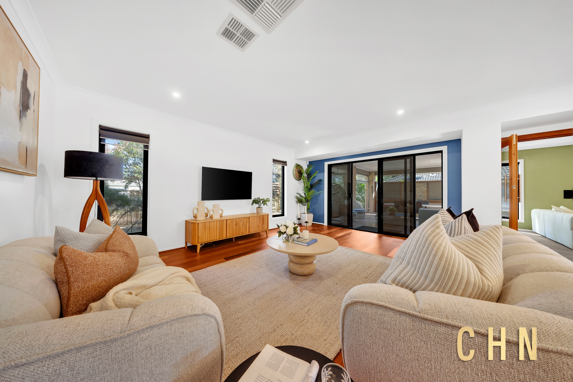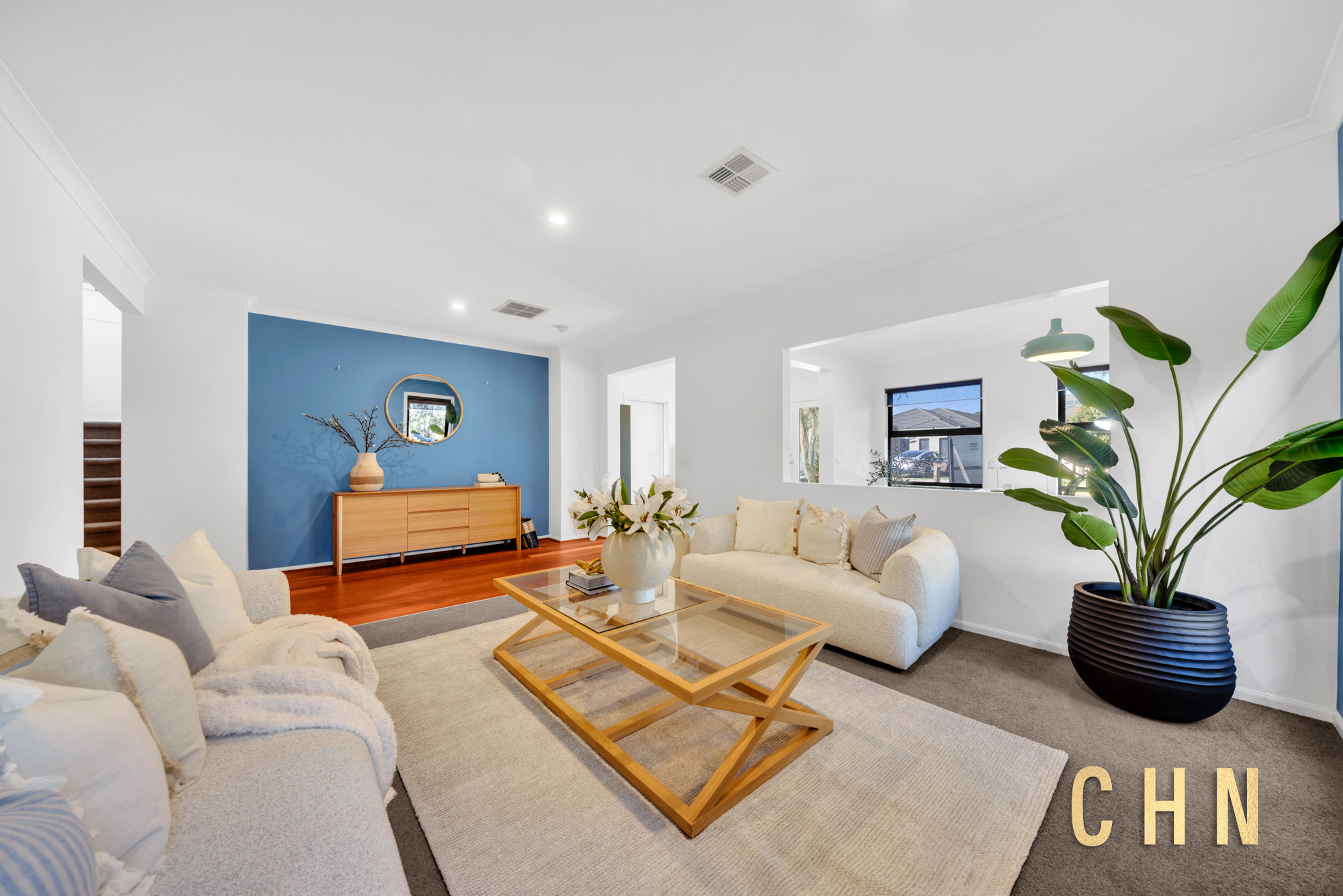 From the moment you arrive, the home’s curb appeal shines with a low-maintenance front garden, elevated decked porch, and exposed concrete surround. Facing a charming shared park, the grand double front doors welcome you into a spacious entry with wide hallways, floorboarded living zones, and plush carpeted rooms, all bathed in natural light from oversized windows and enhanced by LED downlights throughout.
