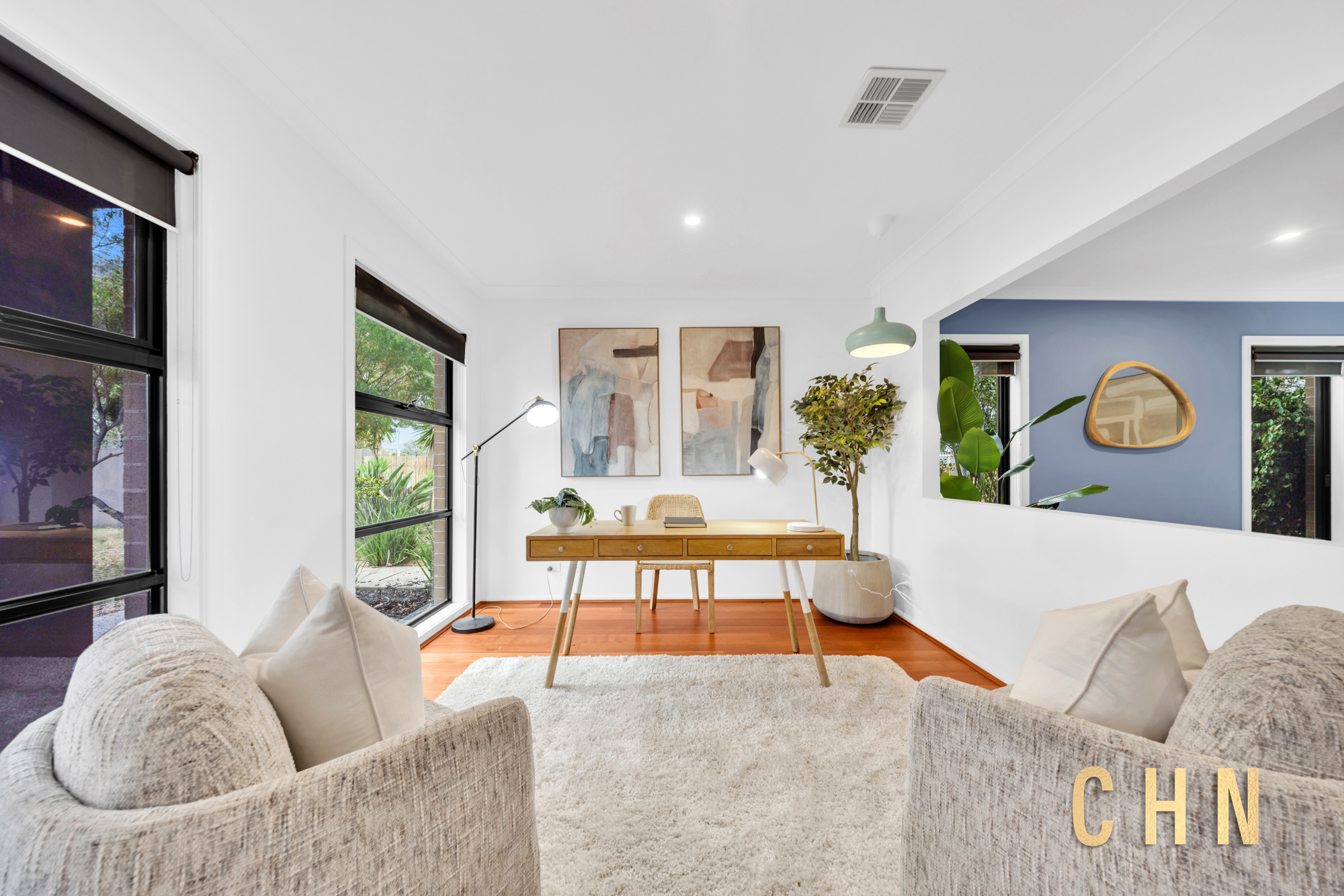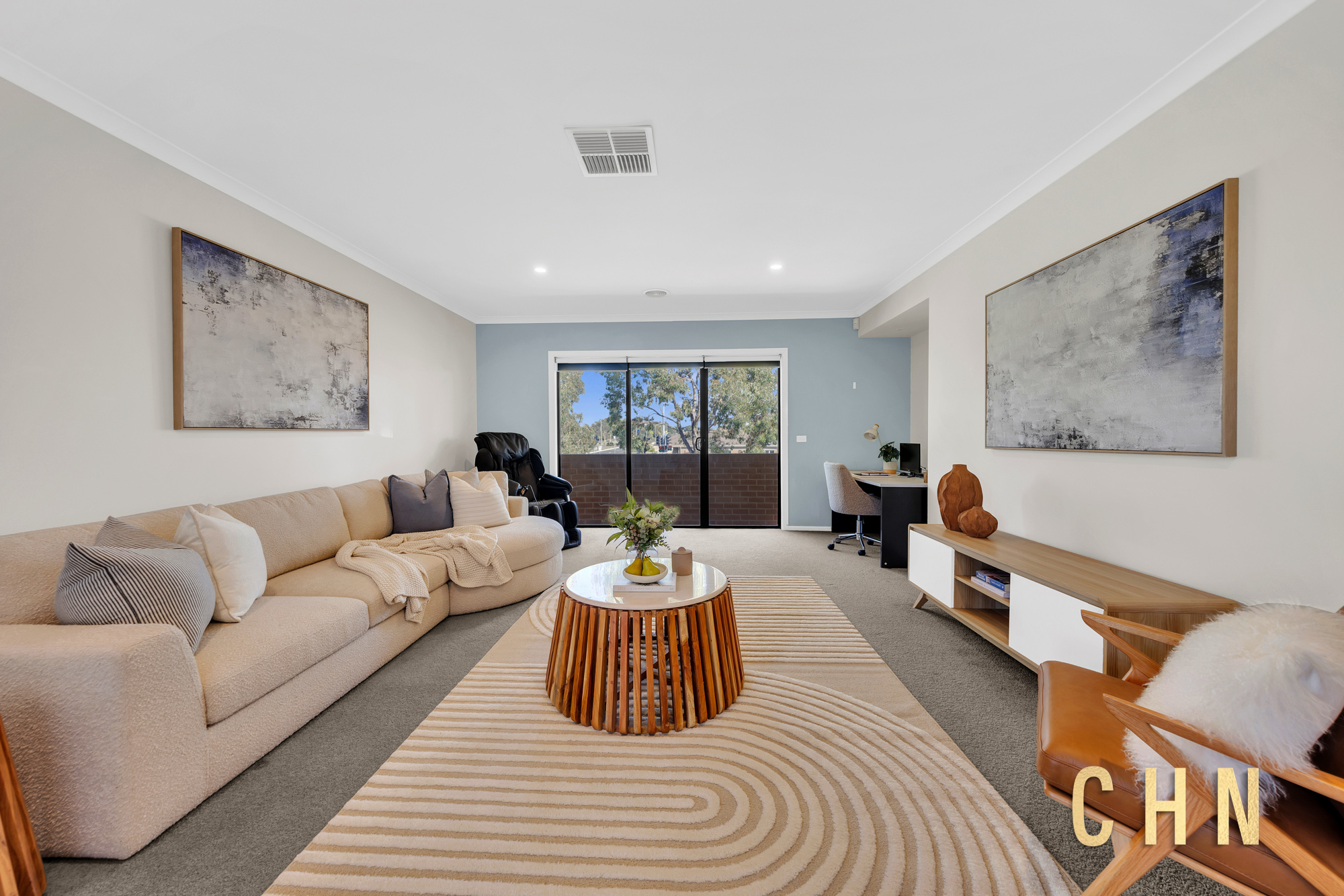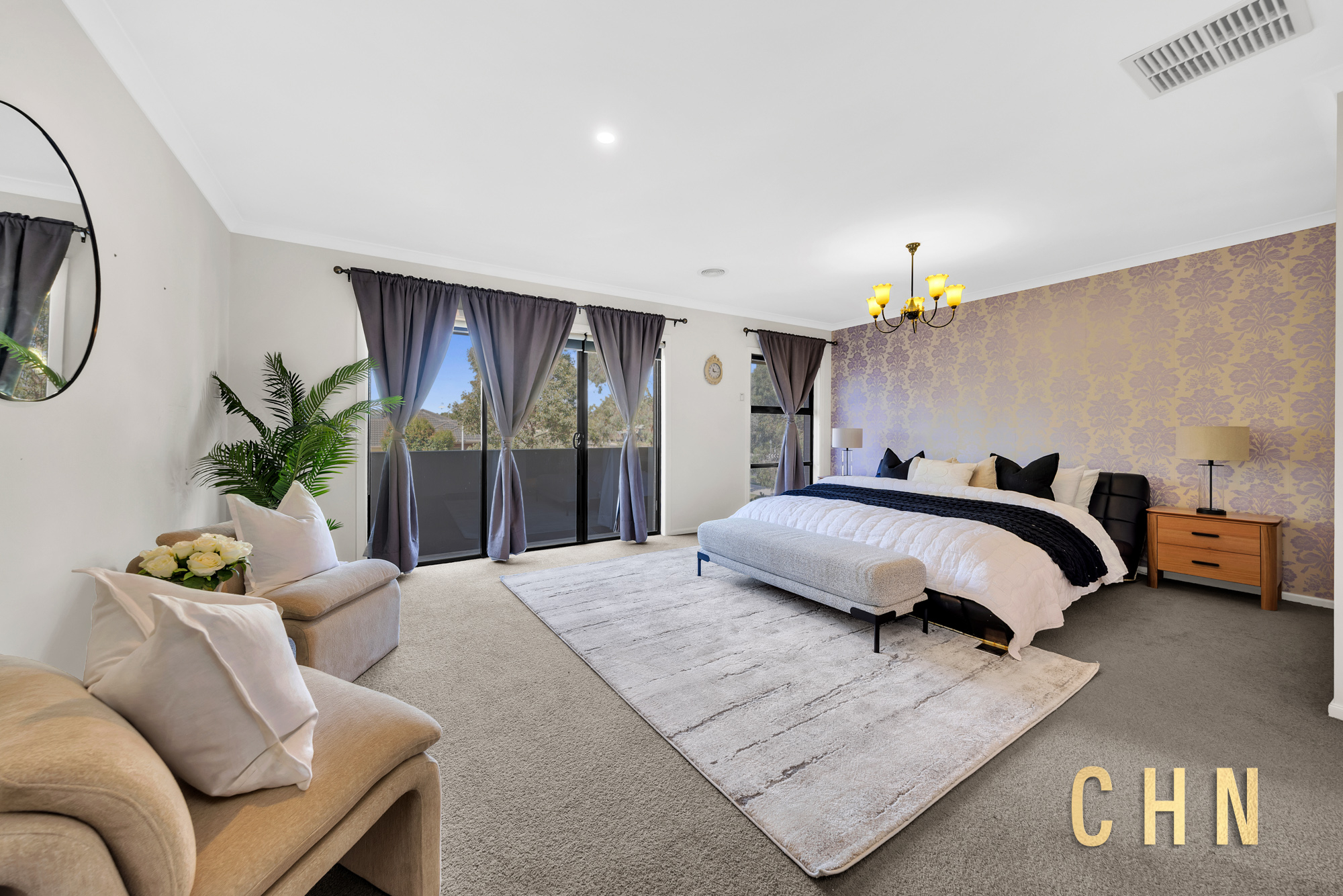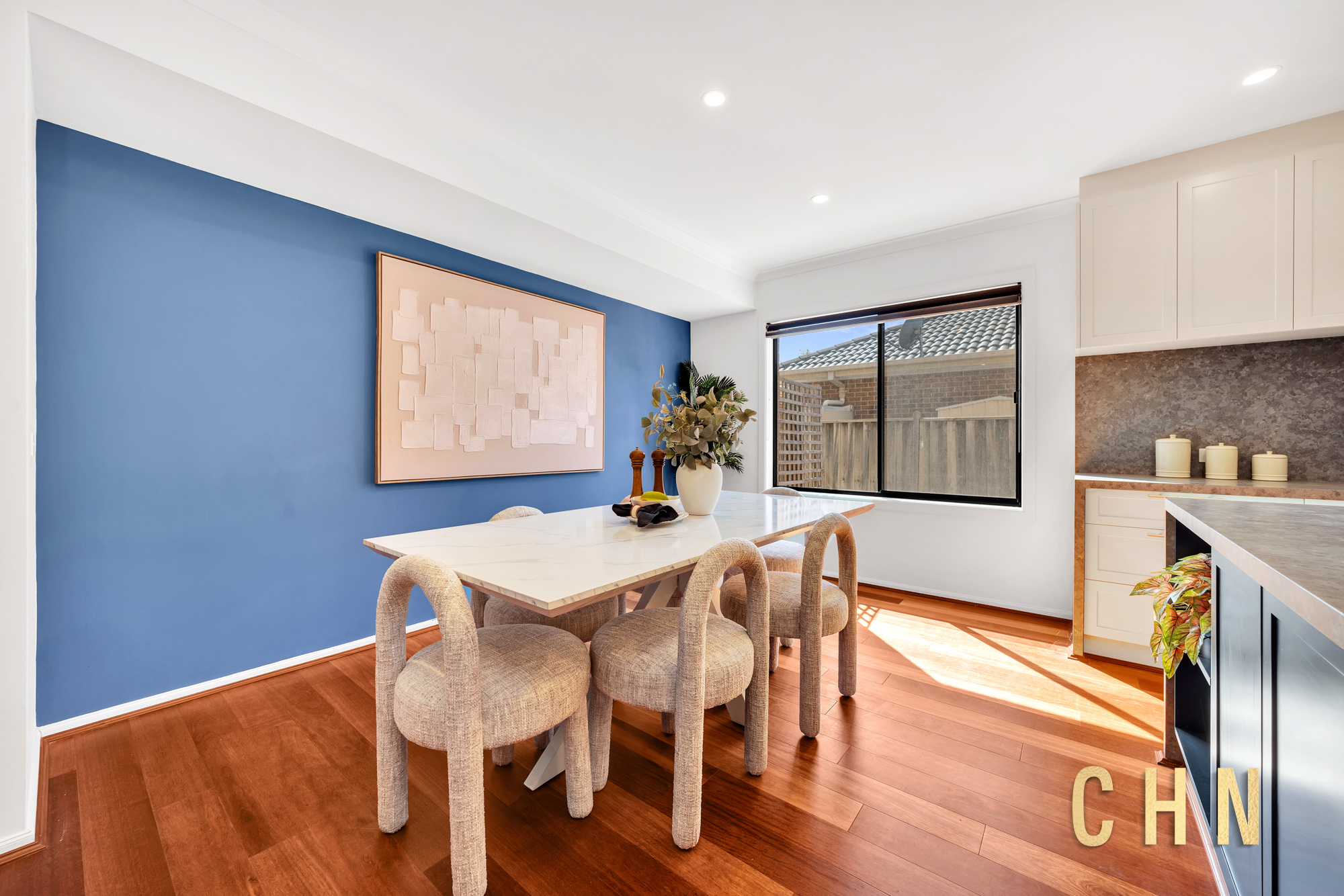 From the moment you arrive, the home’s curb appeal shines with a low-maintenance front garden, elevated decked porch, and exposed concrete surround. Facing a charming shared park, the grand double front doors welcome you into a spacious entry with wide hallways, floorboarded living zones, and plush carpeted rooms, all bathed in natural light from oversized windows and enhanced by LED downlights throughout.