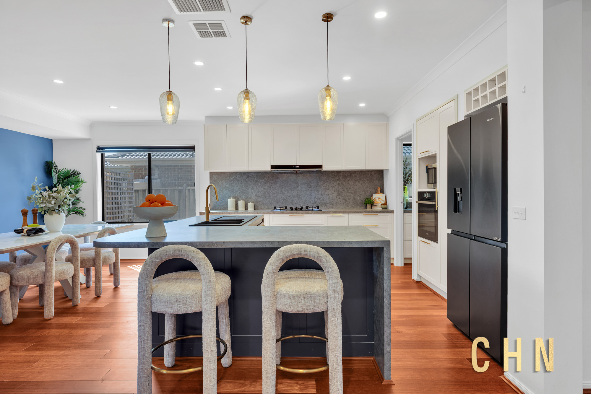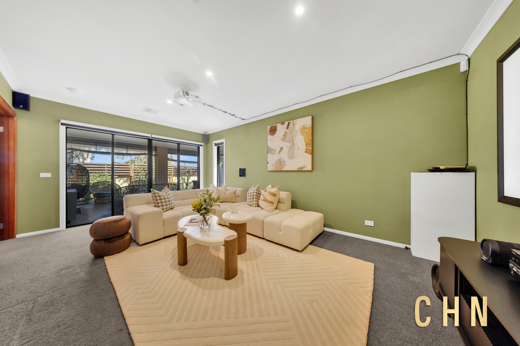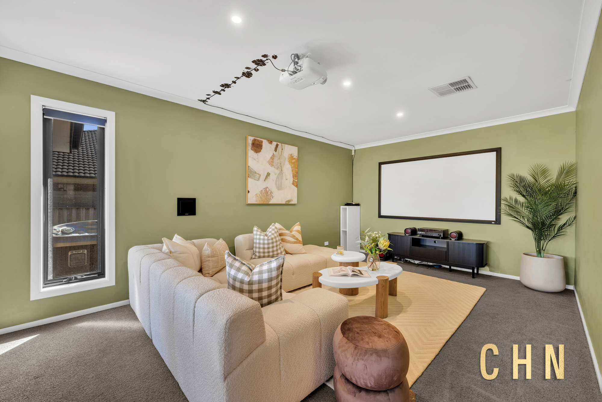 Downstairs, the layout includes a formal lounge, a dedicated home office, and a large powder room with stylish vanity and a full-size mirror. The heart of the home is a light-filled open-plan living and dining area, centered around a chef’s kitchen featuring a stunning L-shaped waterfall island, upgraded FOTILE 900mm gas cooktop, Bosch built-in steam oven, butler’s pantry, and abundant storage. A fully equipped theatre room — complete with an Epson projector, screen, and surround sound — adds a cinematic touch to family nights.
