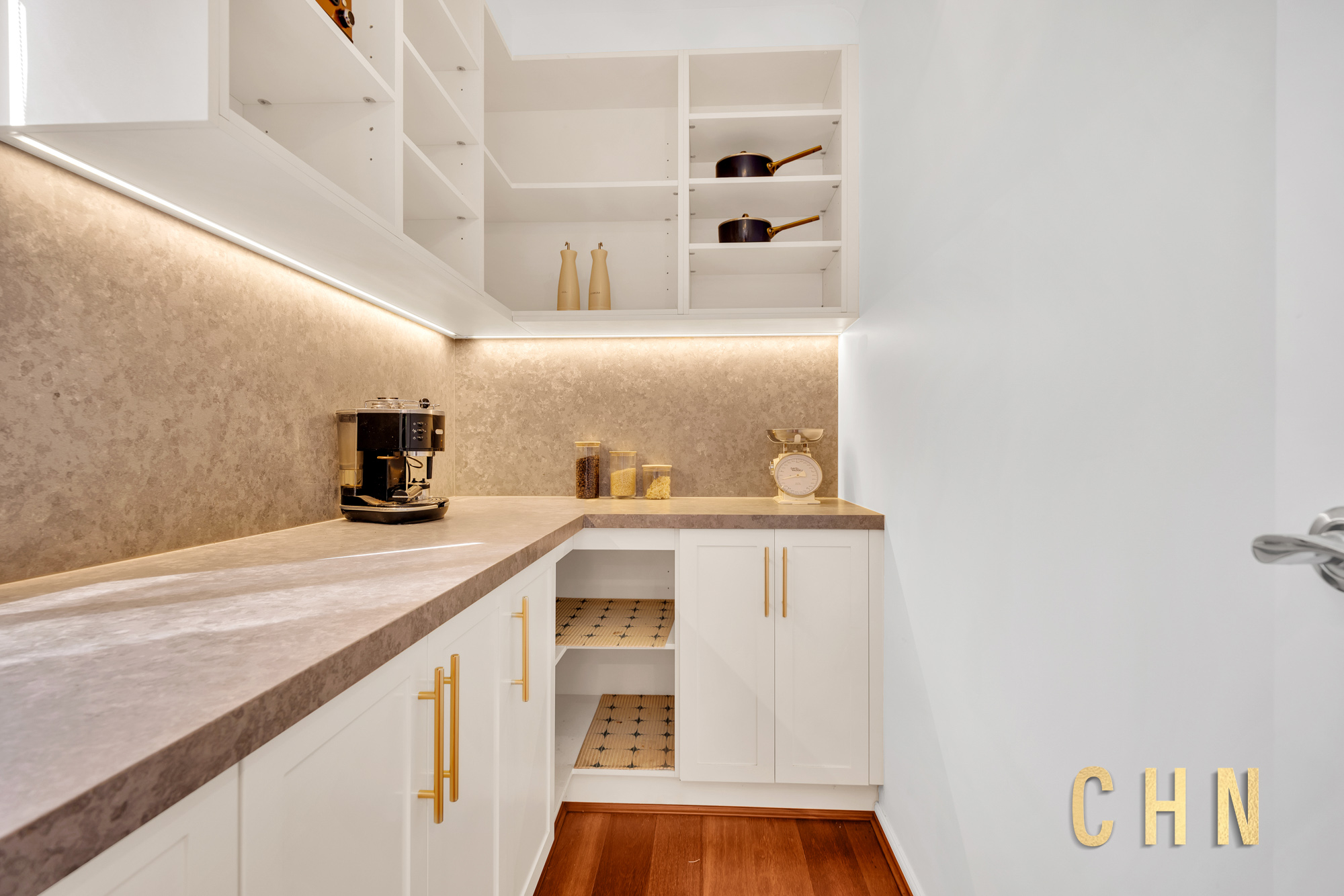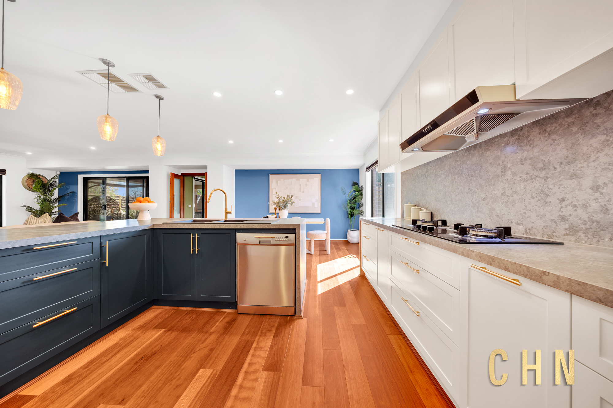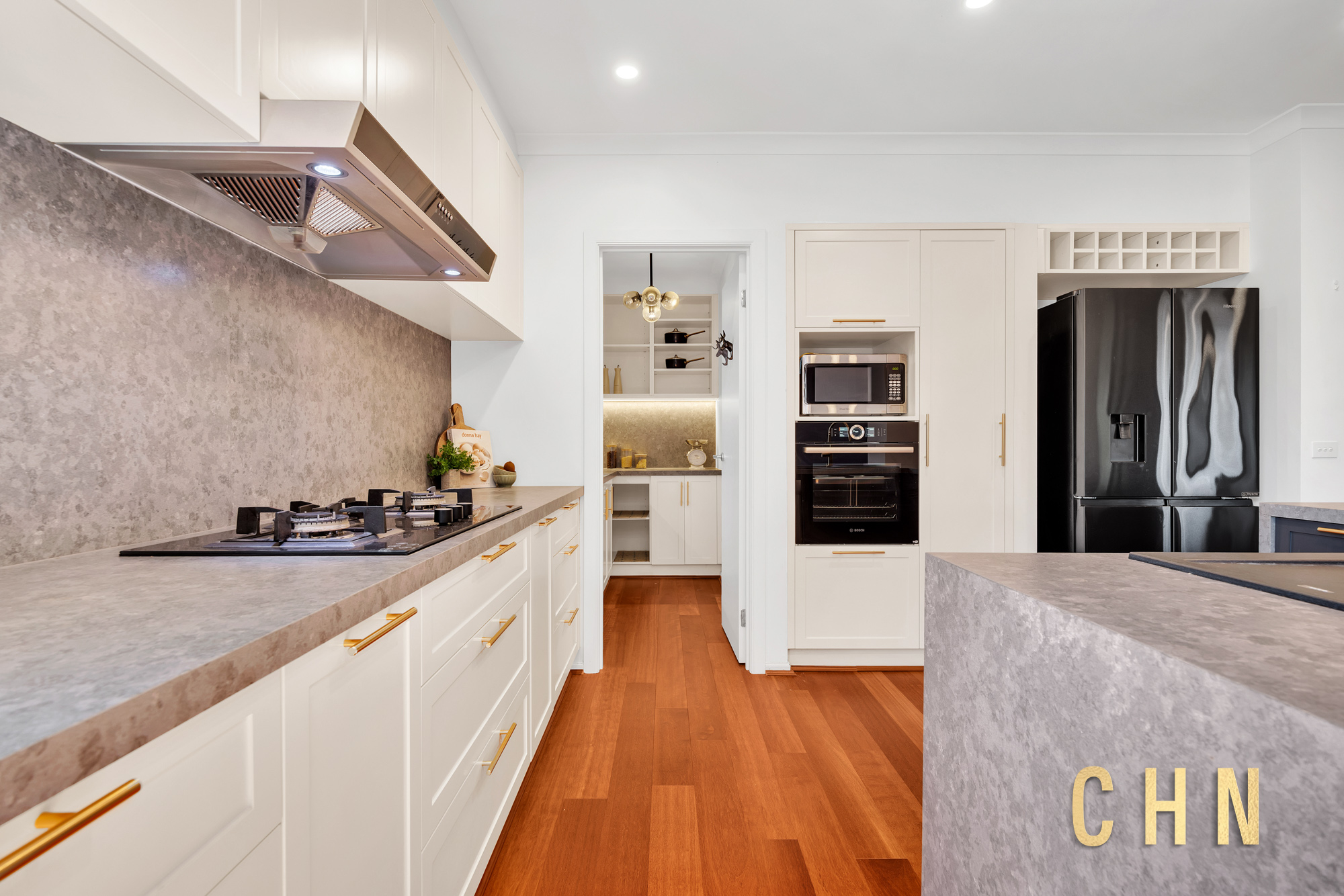 Downstairs, the layout includes a formal lounge, a dedicated home office, and a large powder room with stylish vanity and a full-size mirror. The heart of the home is a light-filled open-plan living and dining area, centered around a chef’s kitchen featuring a stunning L-shaped waterfall island, upgraded FOTILE 900mm gas cooktop, Bosch built-in steam oven, butler’s pantry, and abundant storage. A fully equipped theatre room — complete with an Epson projector, screen, and surround sound — adds a cinematic touch to family nights.