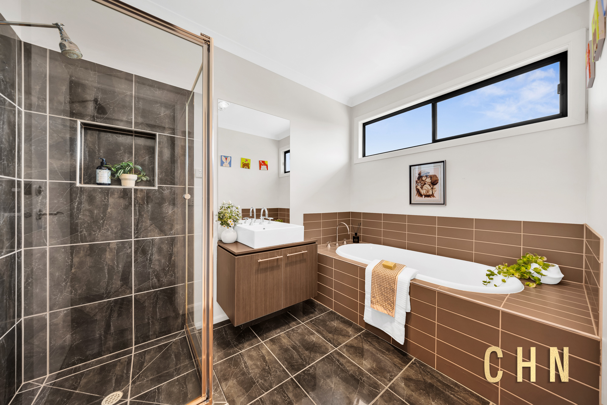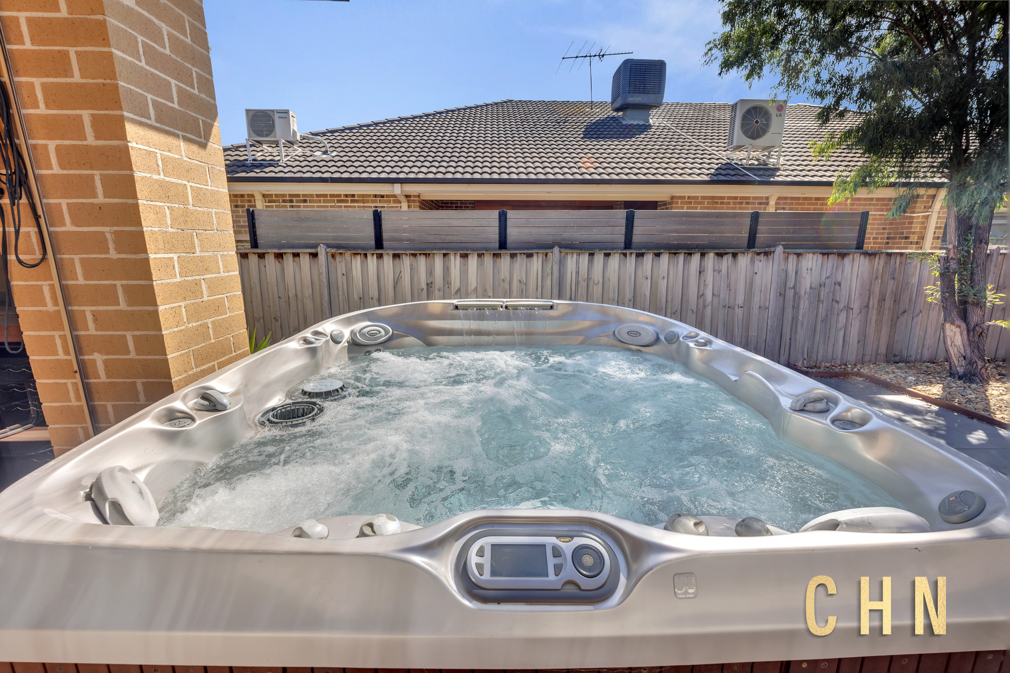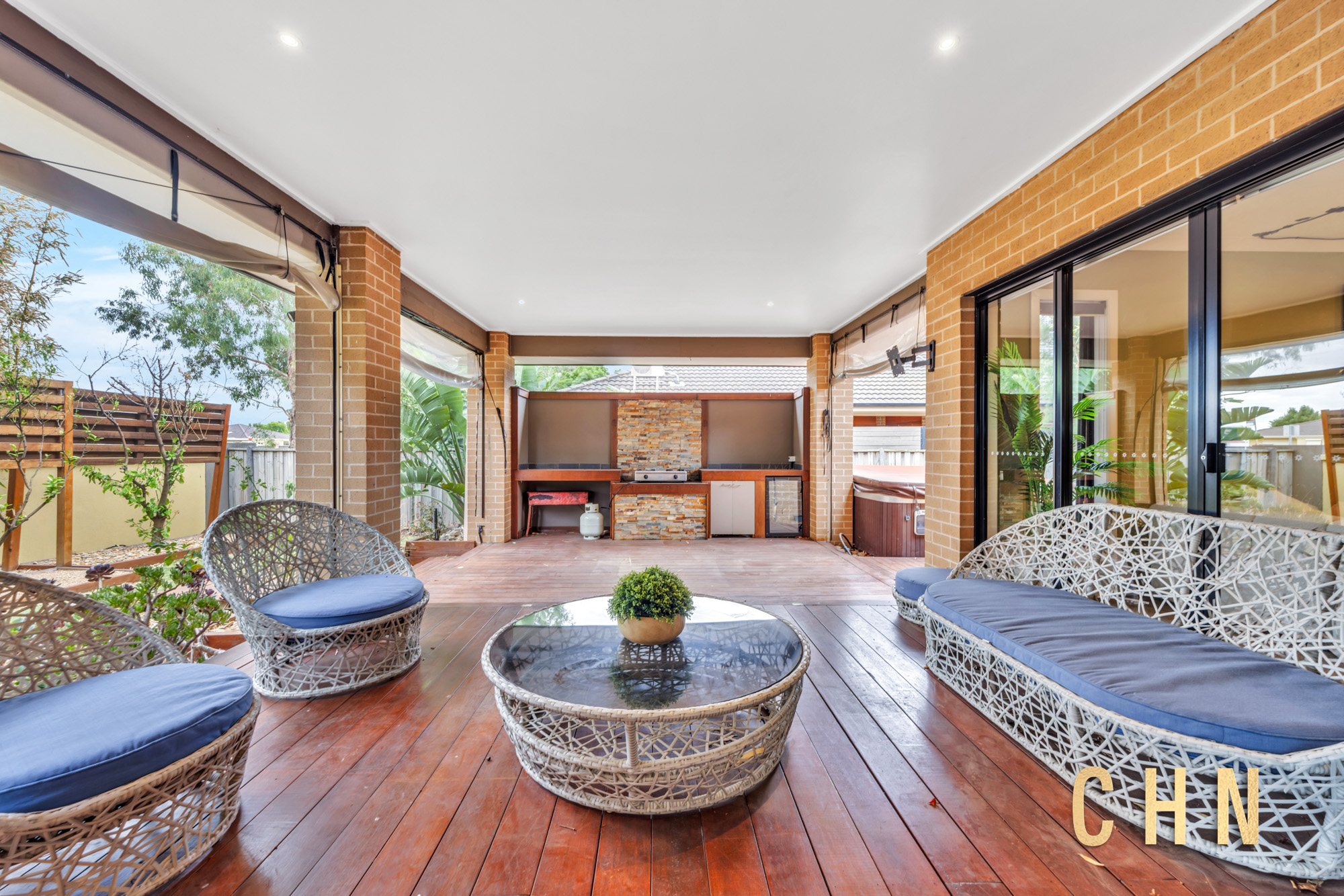 Sliding doors open to a roofed outdoor entertainment zone with elevated decking, clear foldable PVC windscreen, BBQ station with wine fridge, and your very own jacuzzi spa. The backyard continues the low-maintenance appeal with artificial grass, tiled flooring, rainwater tank, garden beds, and a serene side zen garden filled with lush greenery.