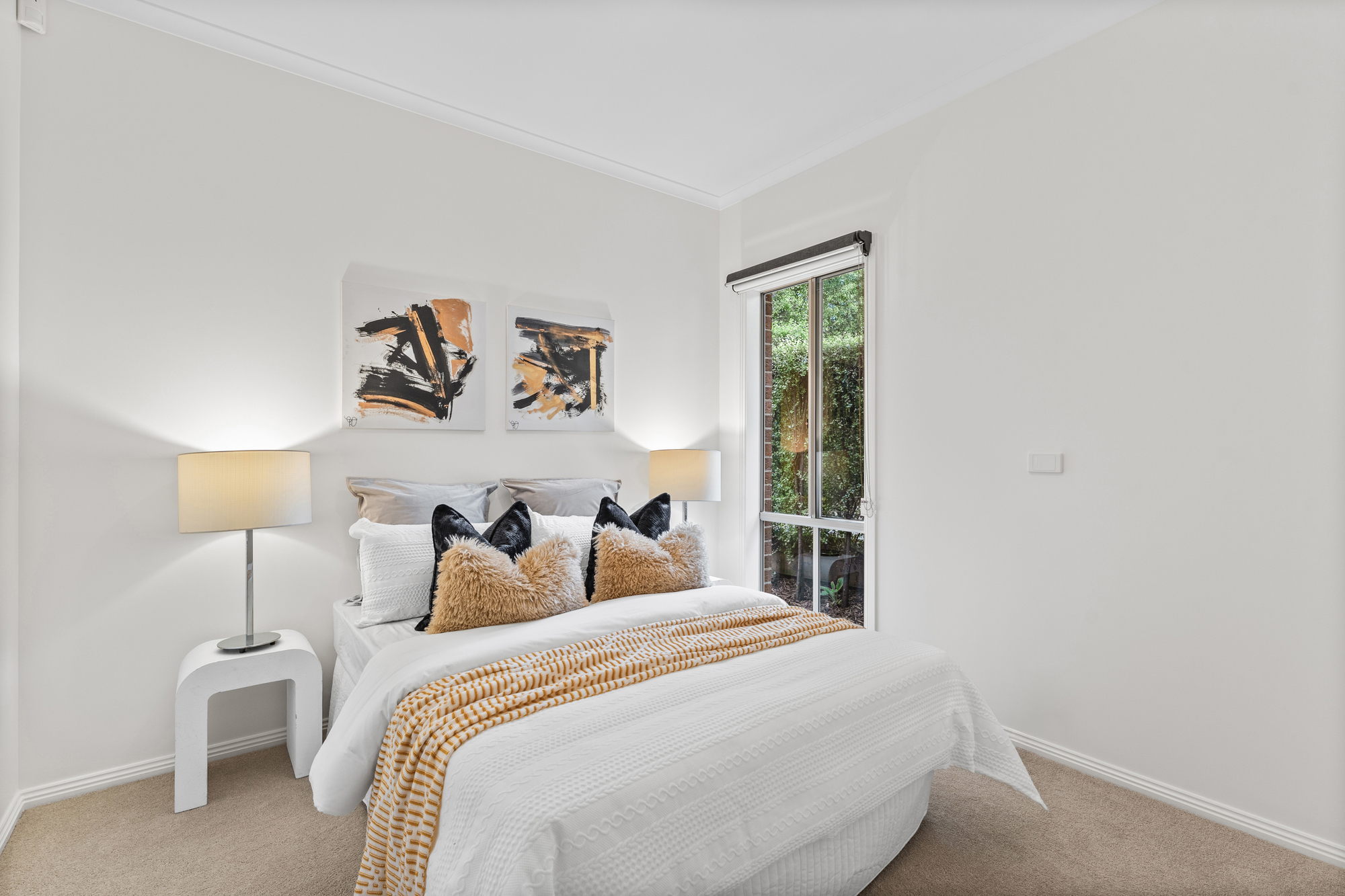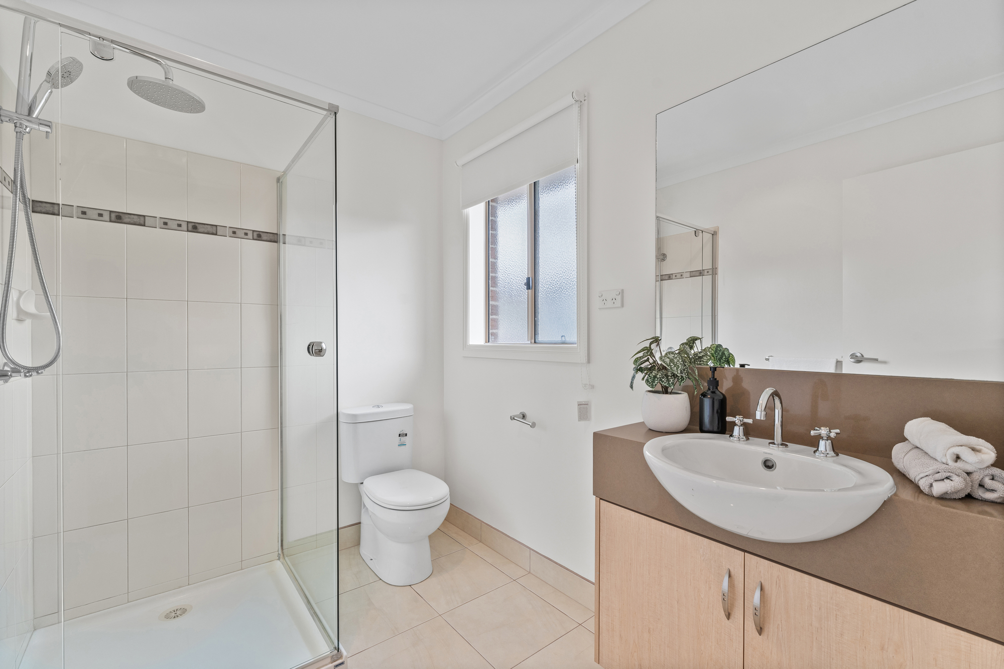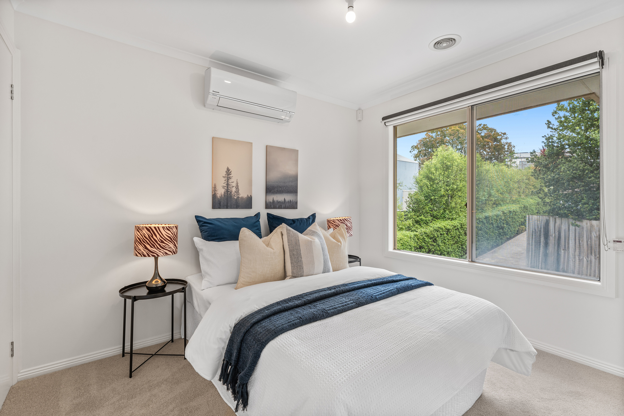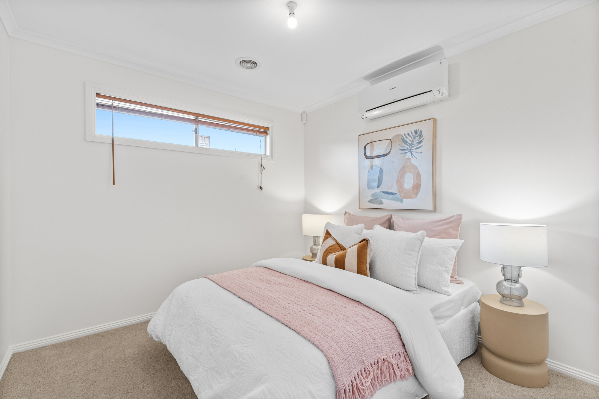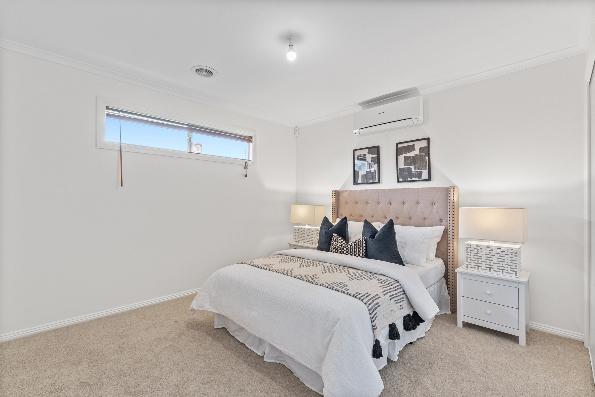 Upstairs, three carpeted bedrooms include built-in robes and split system air conditioning, with the master featuring an ensuite. The shared bathroom includes a stone vanity, bathtub, and heating lamps for added comfort. A fourth bedroom is conveniently located on the ground floor, offering flexibility for guests or a home office. Outdoors, a paved and landscaped backyard provides a neat, low-maintenance setting ideal for relaxing or entertaining. Additional features include a water tank, driveway, and ducted vacuum.