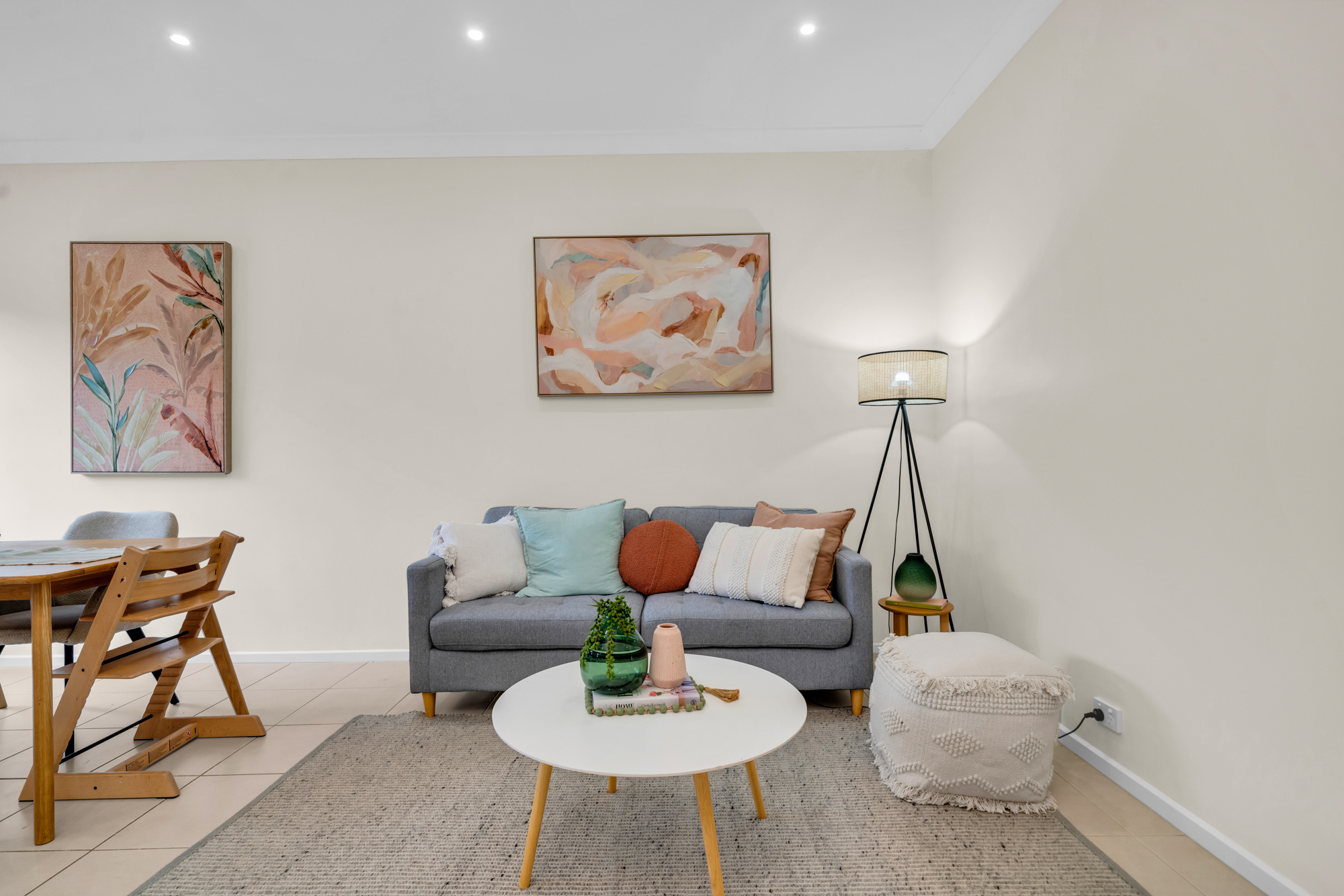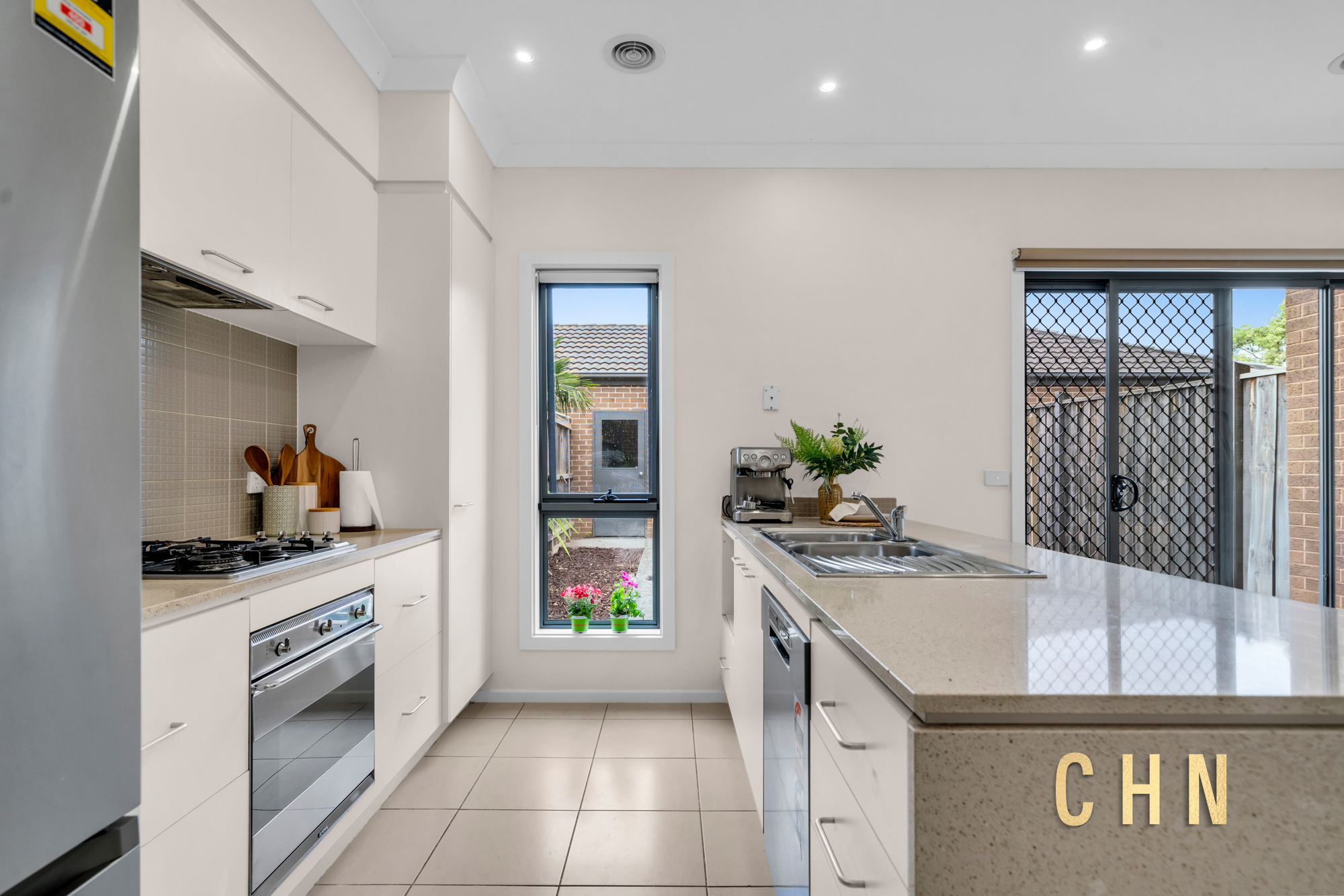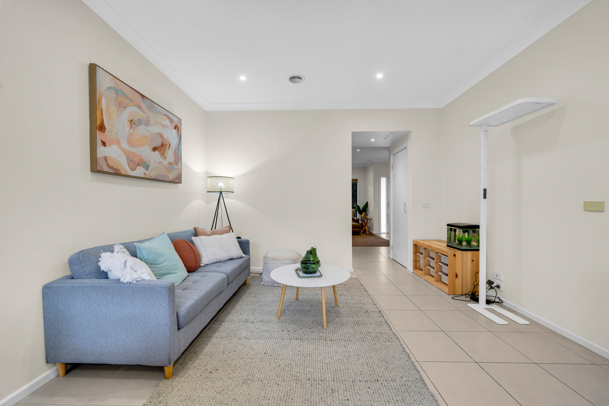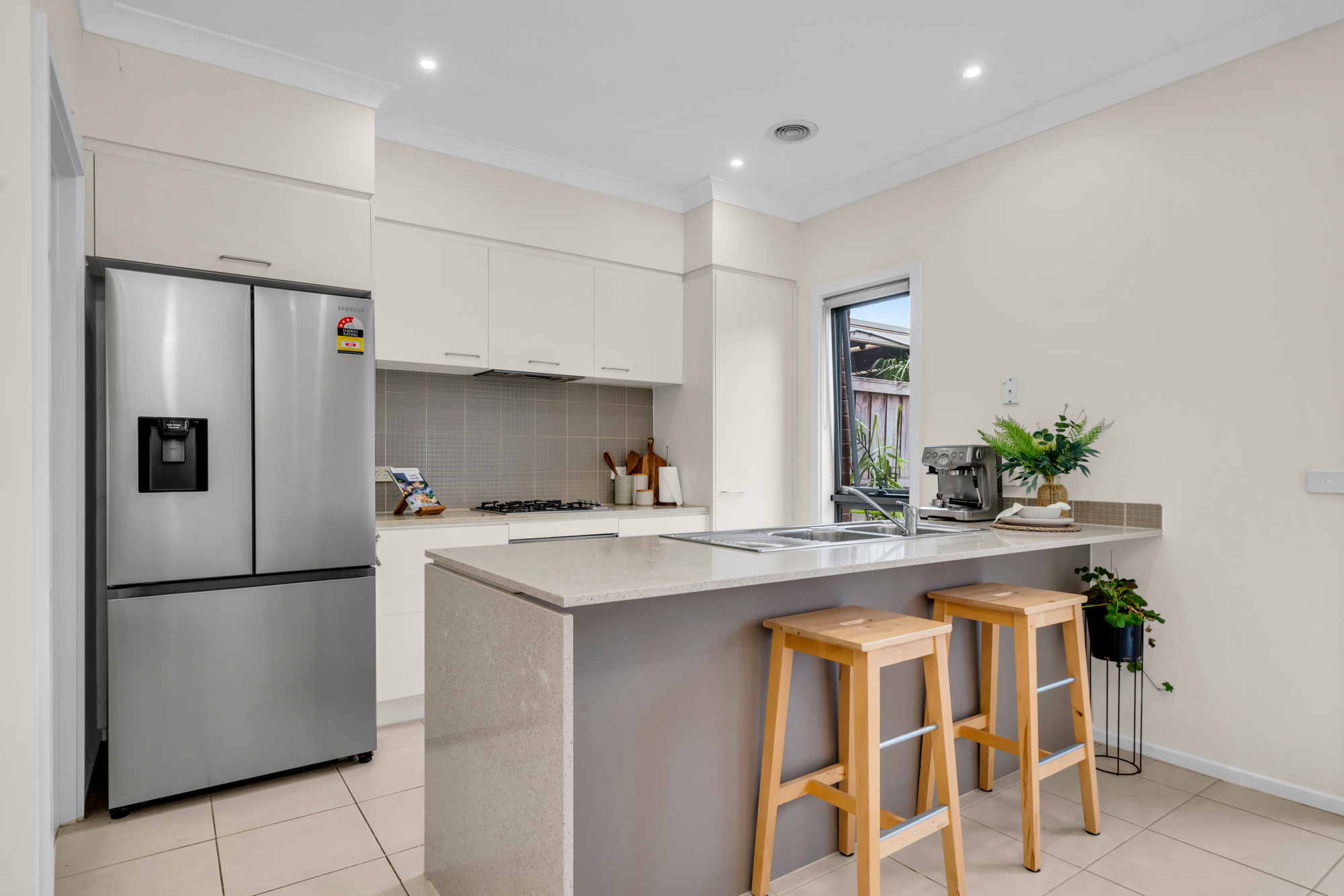 Upon entry, high ceilings and downlighting create a bright and welcoming atmosphere, complemented by a versatile front living room ideal for relaxation or entertaining. At the heart of the home, the island kitchen features a stone benchtop, tiled splashback and functional layout, seamlessly connecting to the dining and living zones for everyday ease.