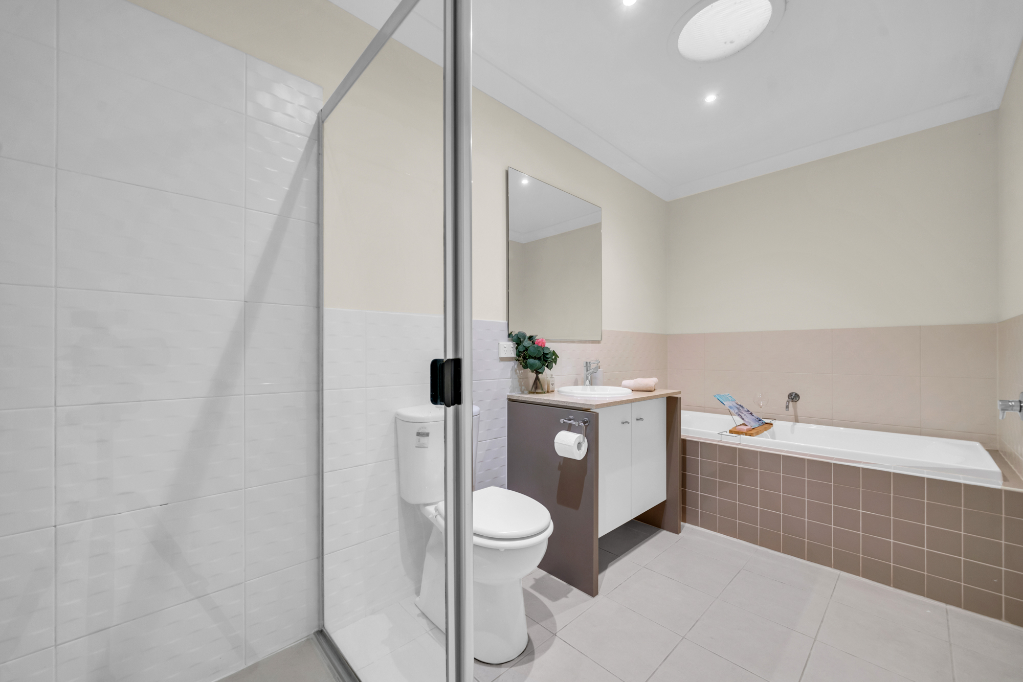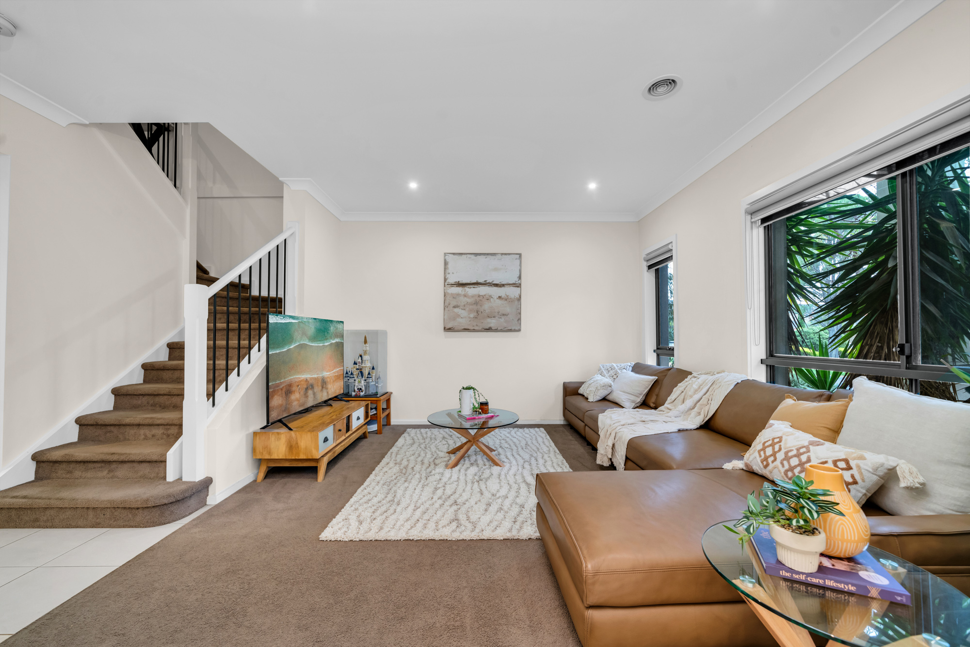 Upstairs, a small retreat nook offers additional flexibility for study or quiet relaxation. Accommodation includes two bedrooms with mirrored built-in wardrobes serviced by a central bathroom, while the main bedroom features a walk-in wardrobe, private ensuite with double basins, and a balcony enjoying street and park views.