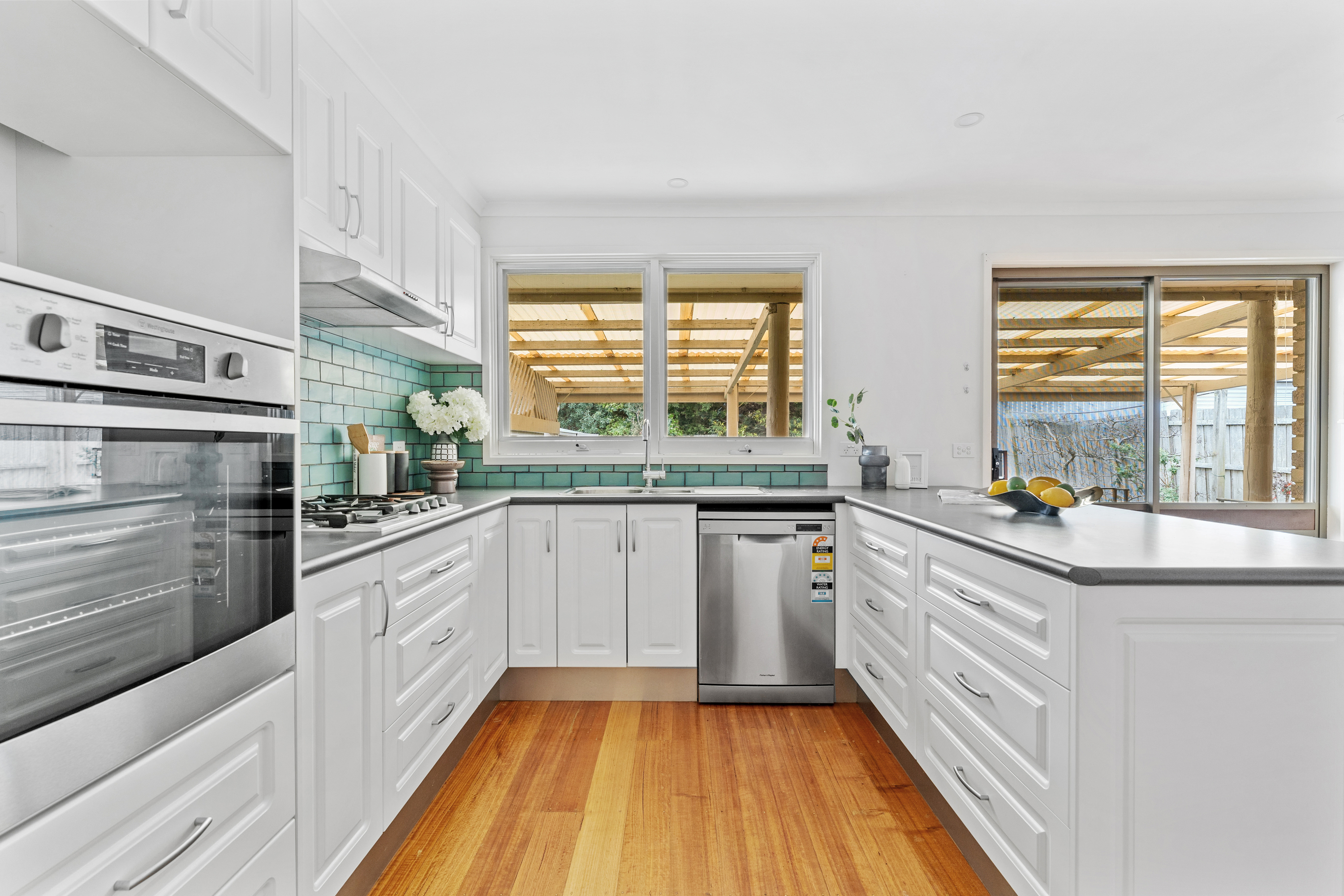 The kitchen is functional with a four-burner gas stove, breakfast bar, pantry, and ample over and under storage. Accommodation includes three bedrooms, with the master featuring a built-in robe and ceiling fan. The central bathroom is well-appointed with a bathtub, shower, large vanity, and window for natural ventilation.