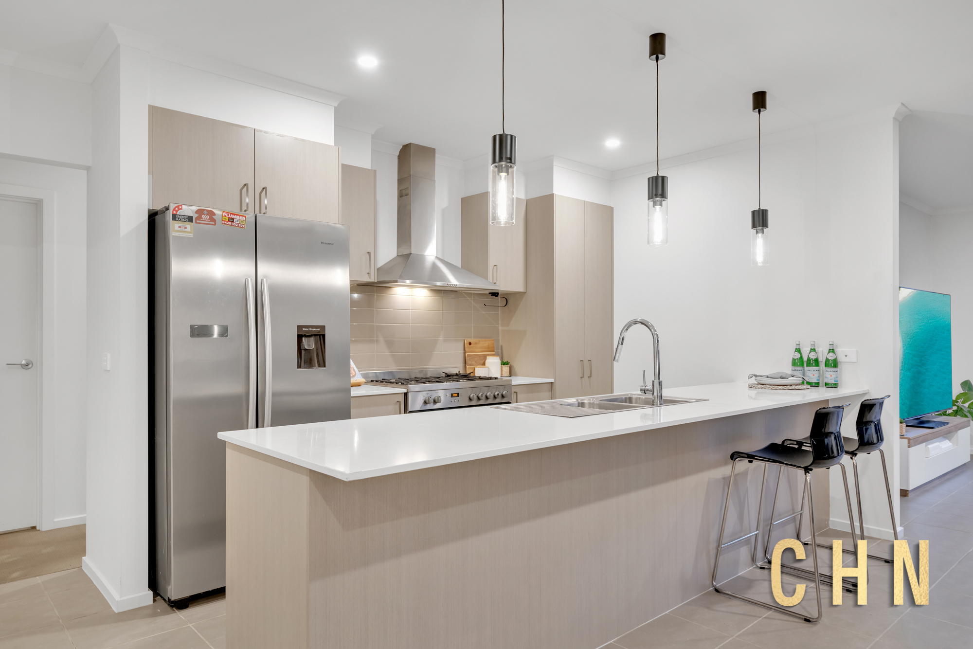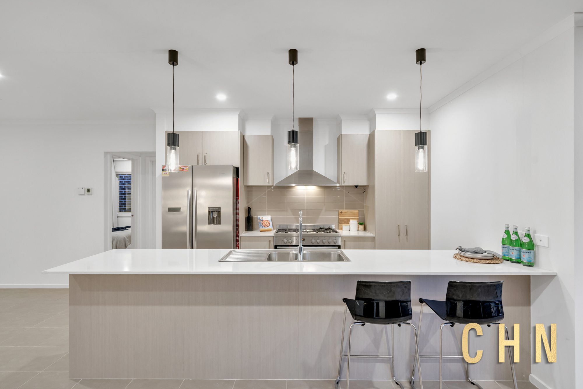 Entertaining is effortless in the light-filled living area, where a sleek U-shaped chef’s kitchen takes center stage. It boasts a Caesar stone island breakfast bar, 900mm freestanding gas appliances, top-and-bottom cabinetry, a built-in pantry, and stylish pendant lighting. Glass sliding doors seamlessly connect the family retreat to the backyard, where a modern deck overlooks low-maintenance artificial grass and garden beds—perfect for gatherings.
